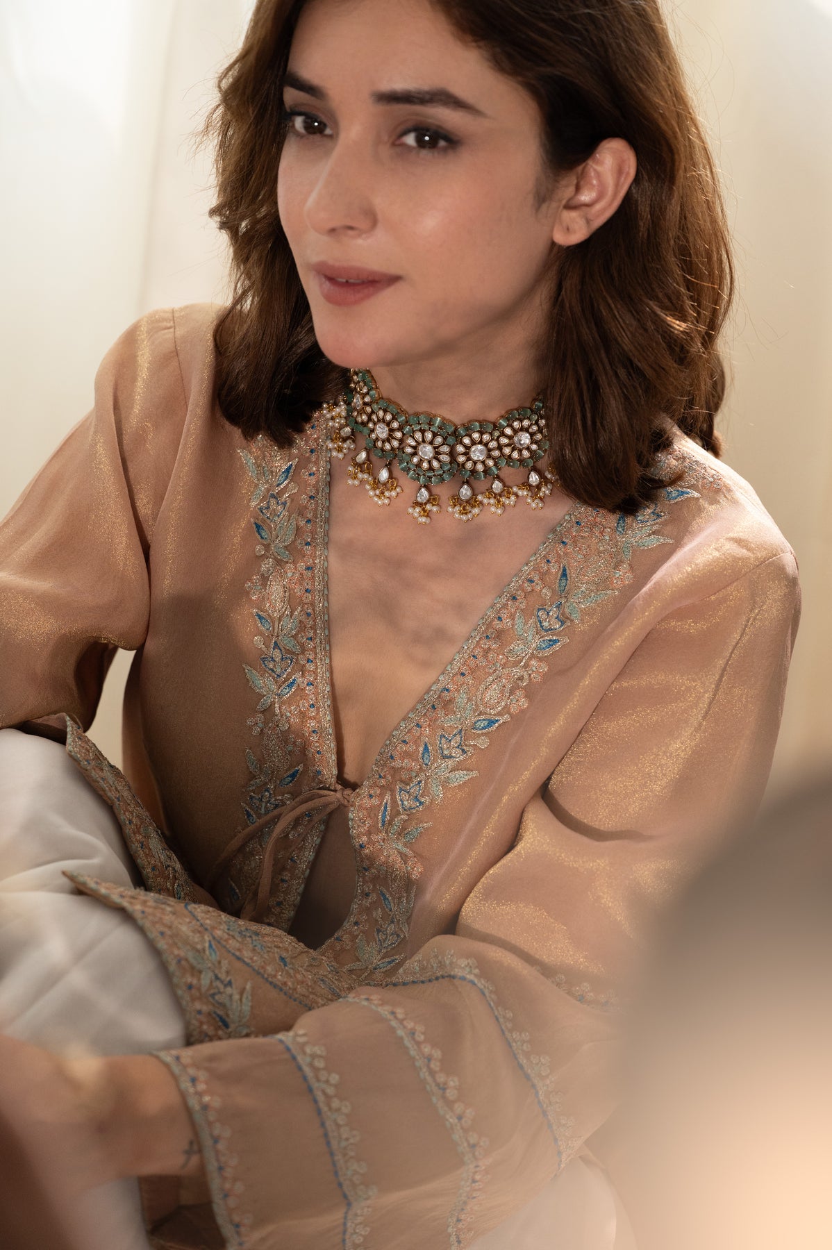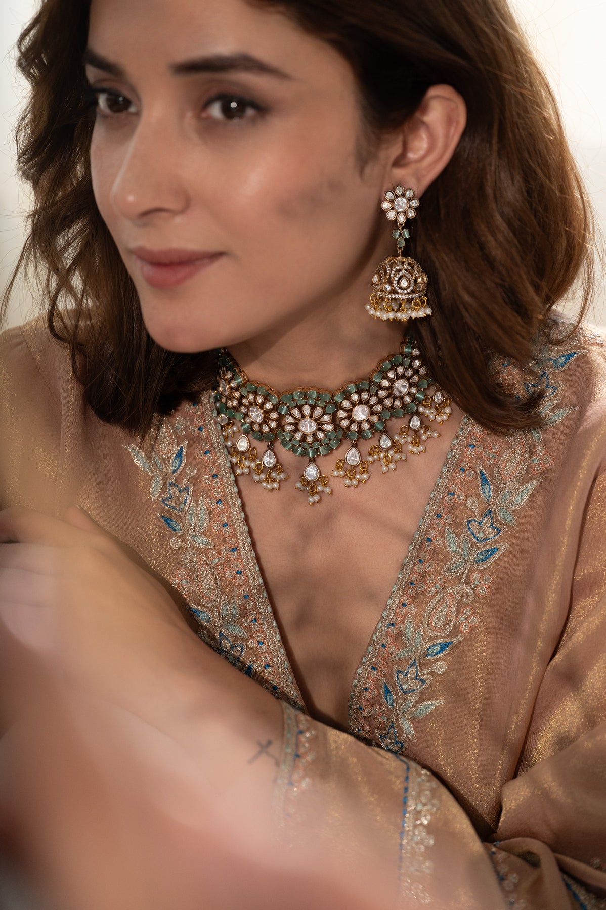 The Nimra necklace set is a delightful blend of royal elegance and fresh charm, bursting with grace and sparkle. The necklace is a dazzling medley of mint-hued fluorite stones, polkis, and dainty pearls that fringe like a festive jingle. The jhumka-style earrings echo the same opulence, with intricate details that dance with every turn of your head. It’s the kind of set that doesn’t just accessorize an outfit, it defines it.