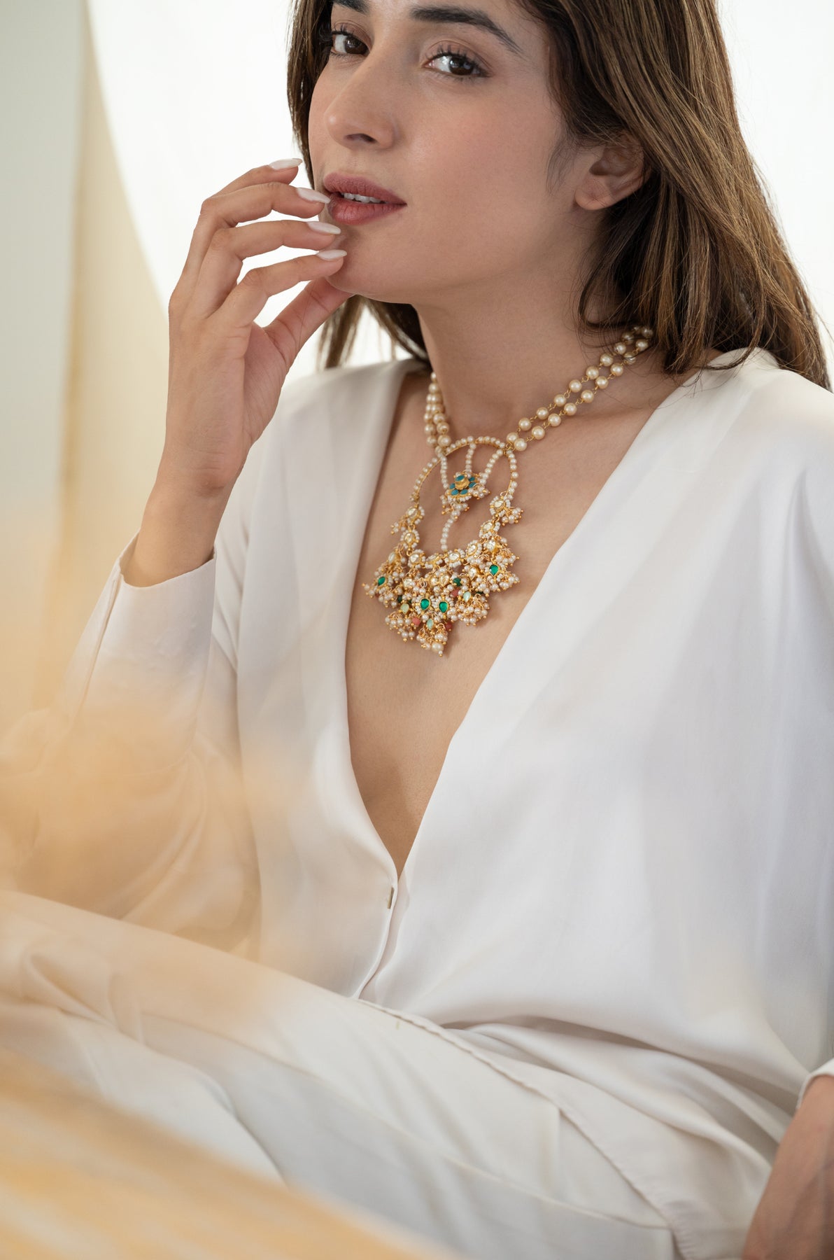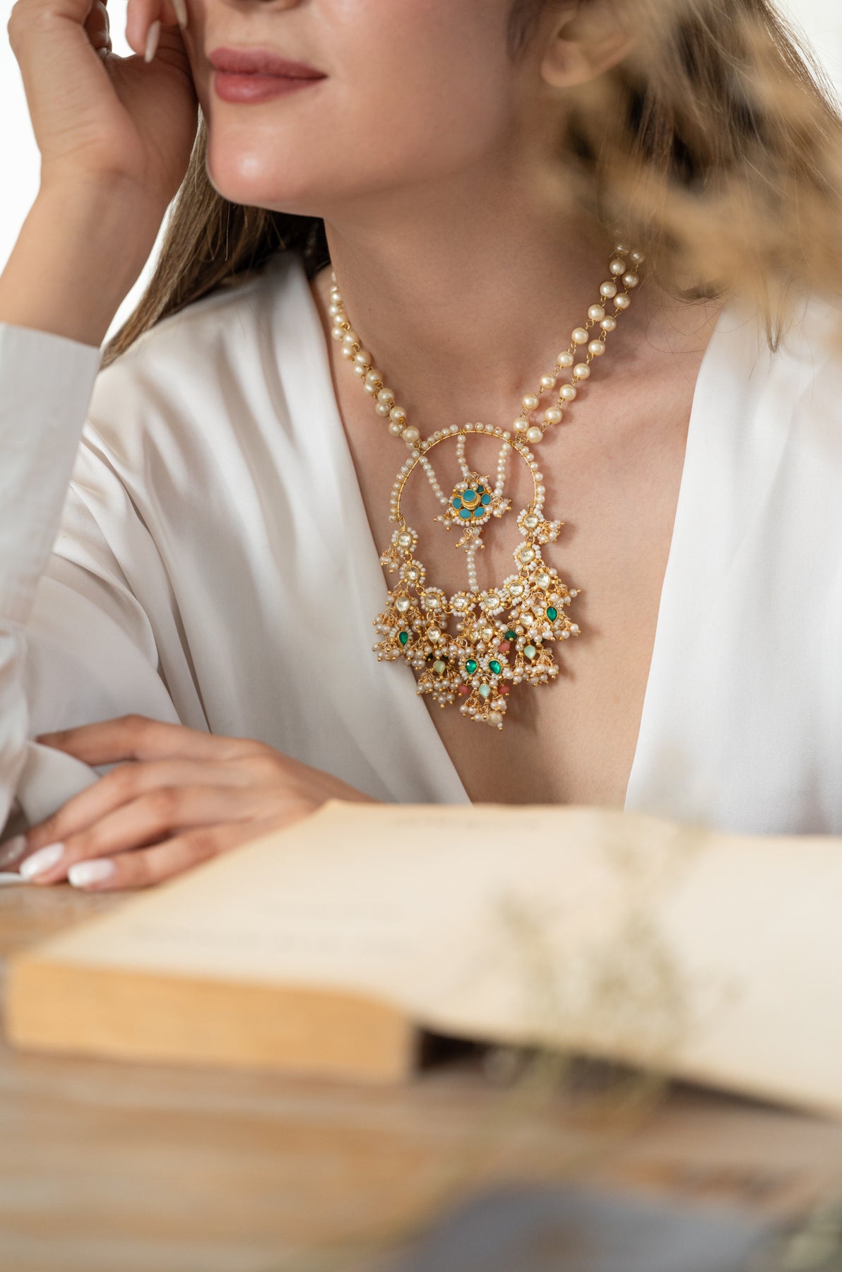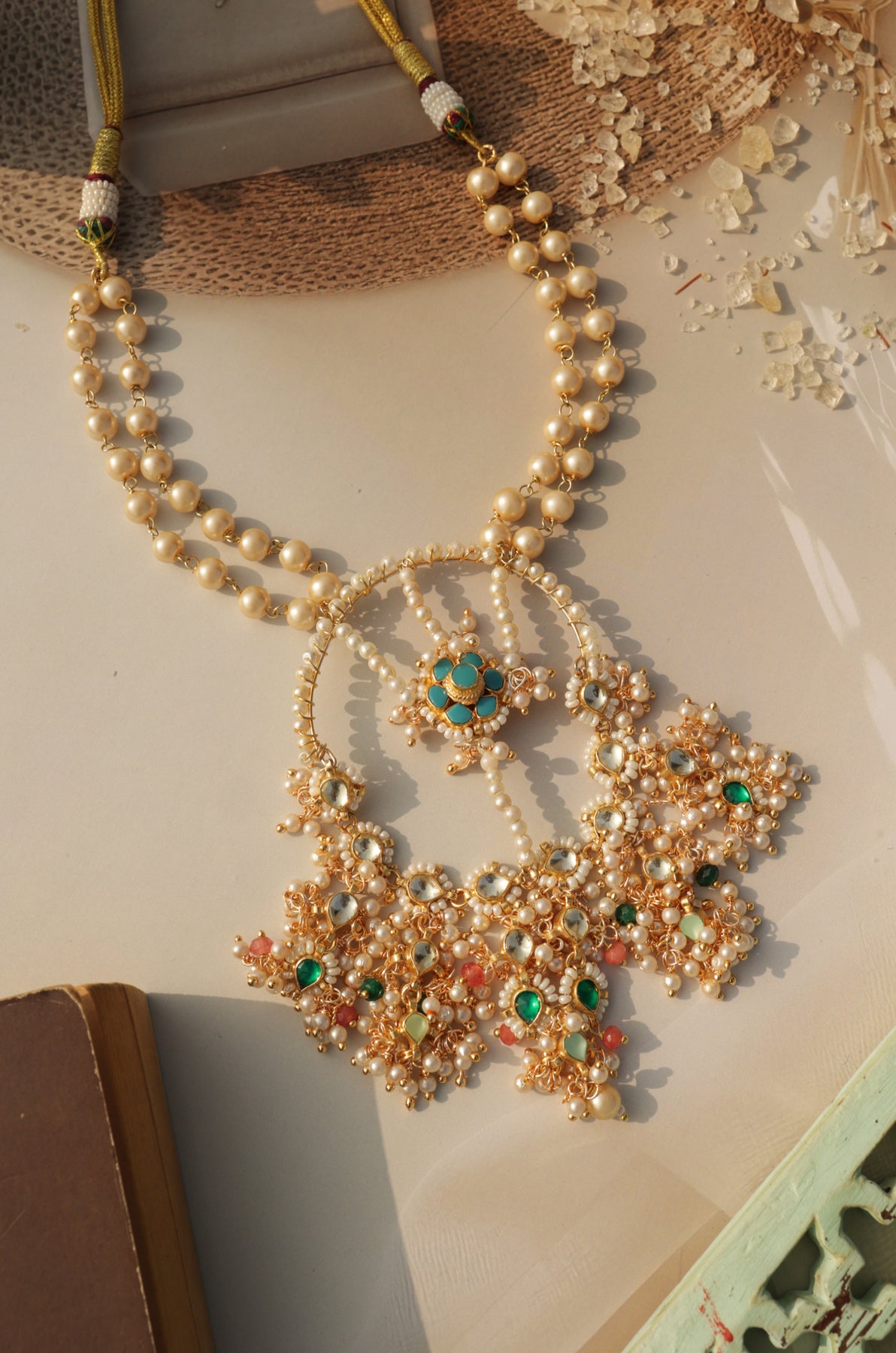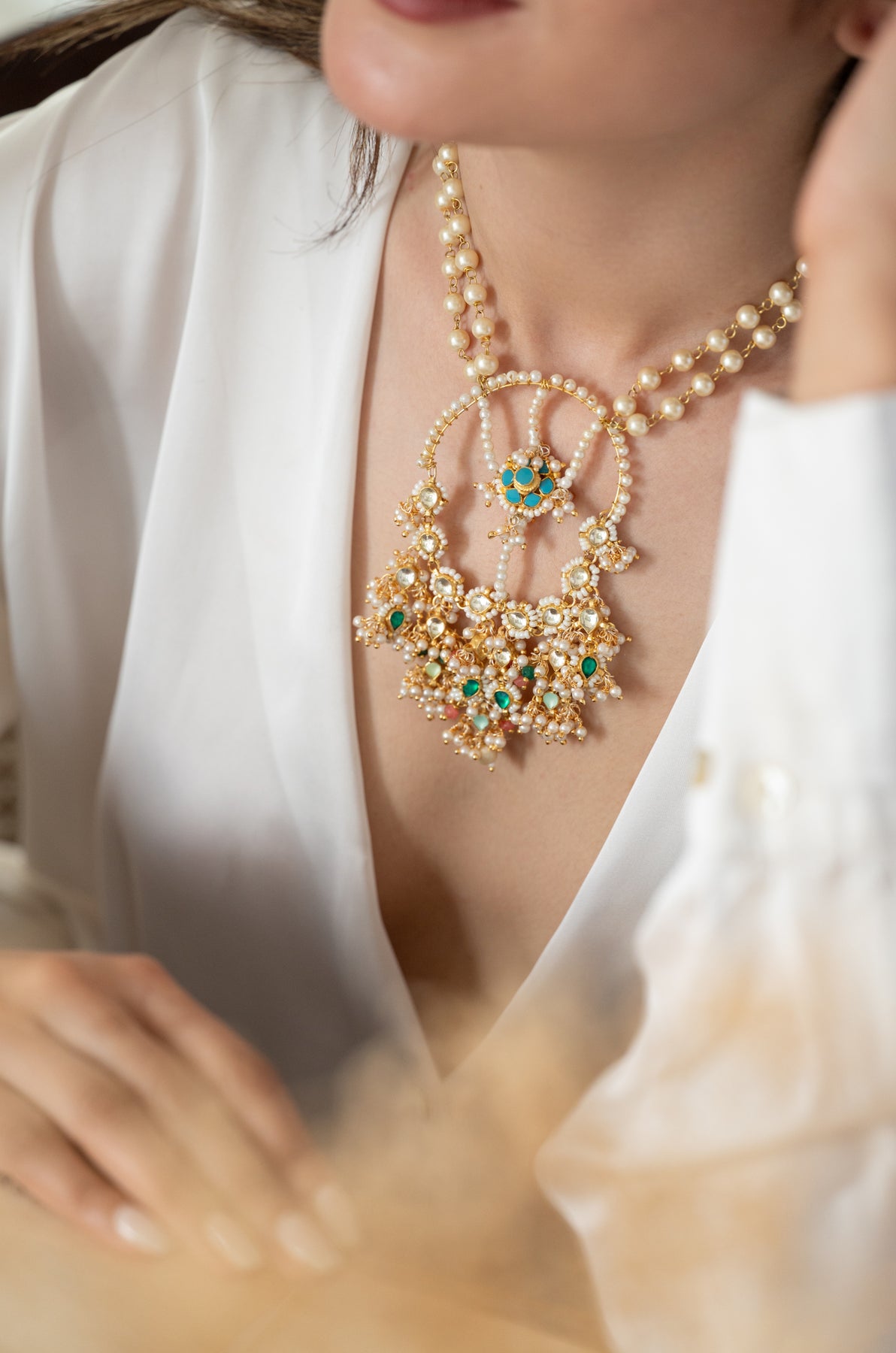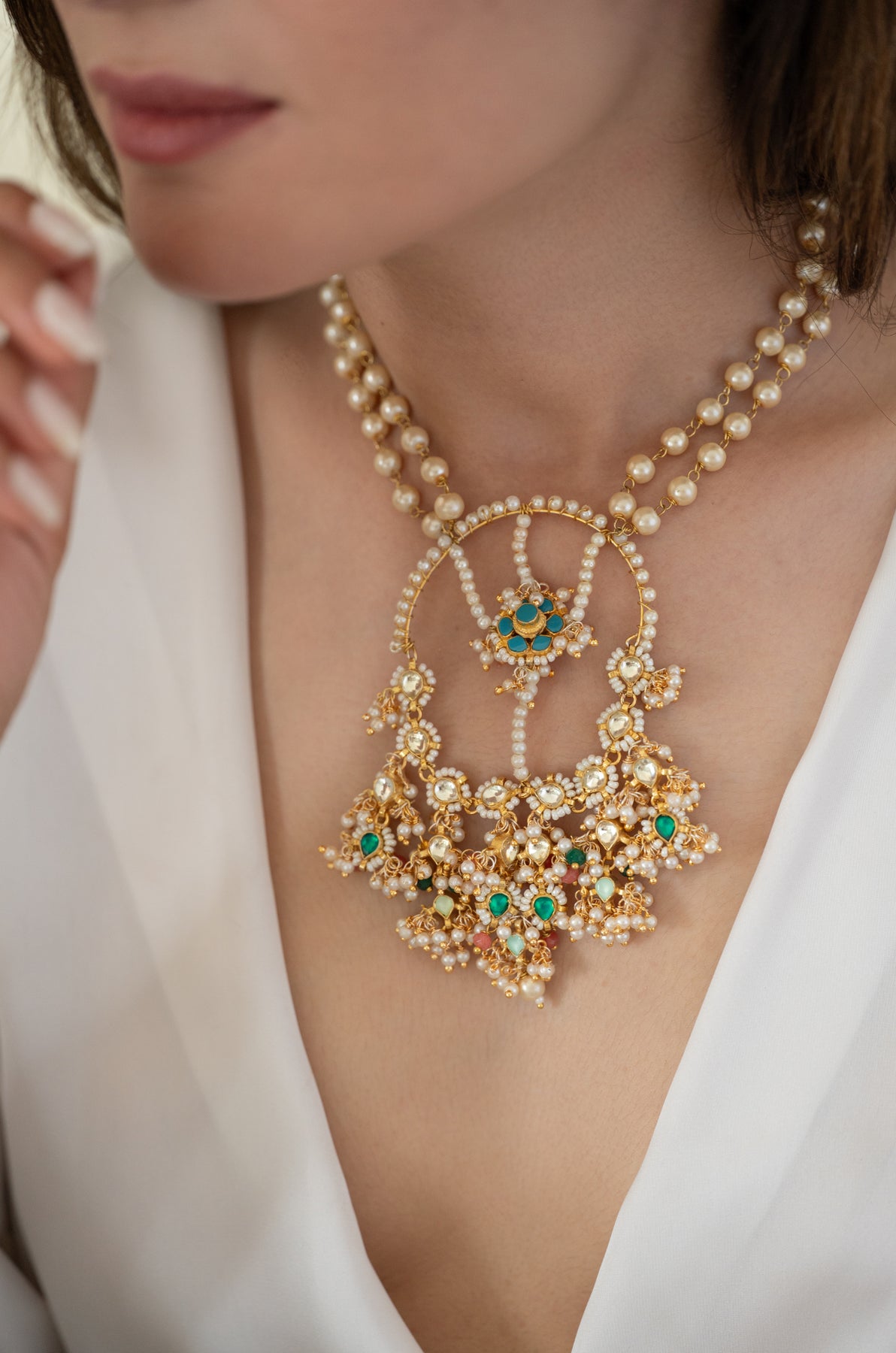 Introducing the Smitakshi kundan necklace - a beautiful blend of traditional handcraft and modern elegance. Adorned with lustrous shell pearls, this statement piece features a delicate floral turquoise design at its center, surrounded by a circle of pearls and kundan. The bottom hangings add a perfect finishing touch. Elevate any outfit with this exquisite, exclusive necklace.