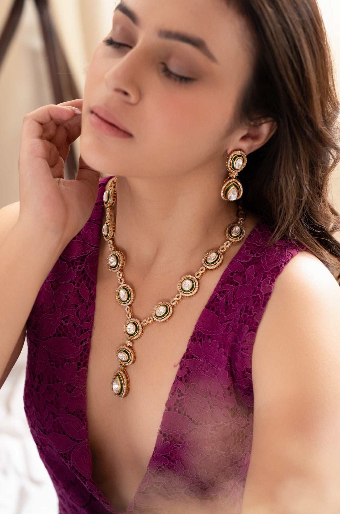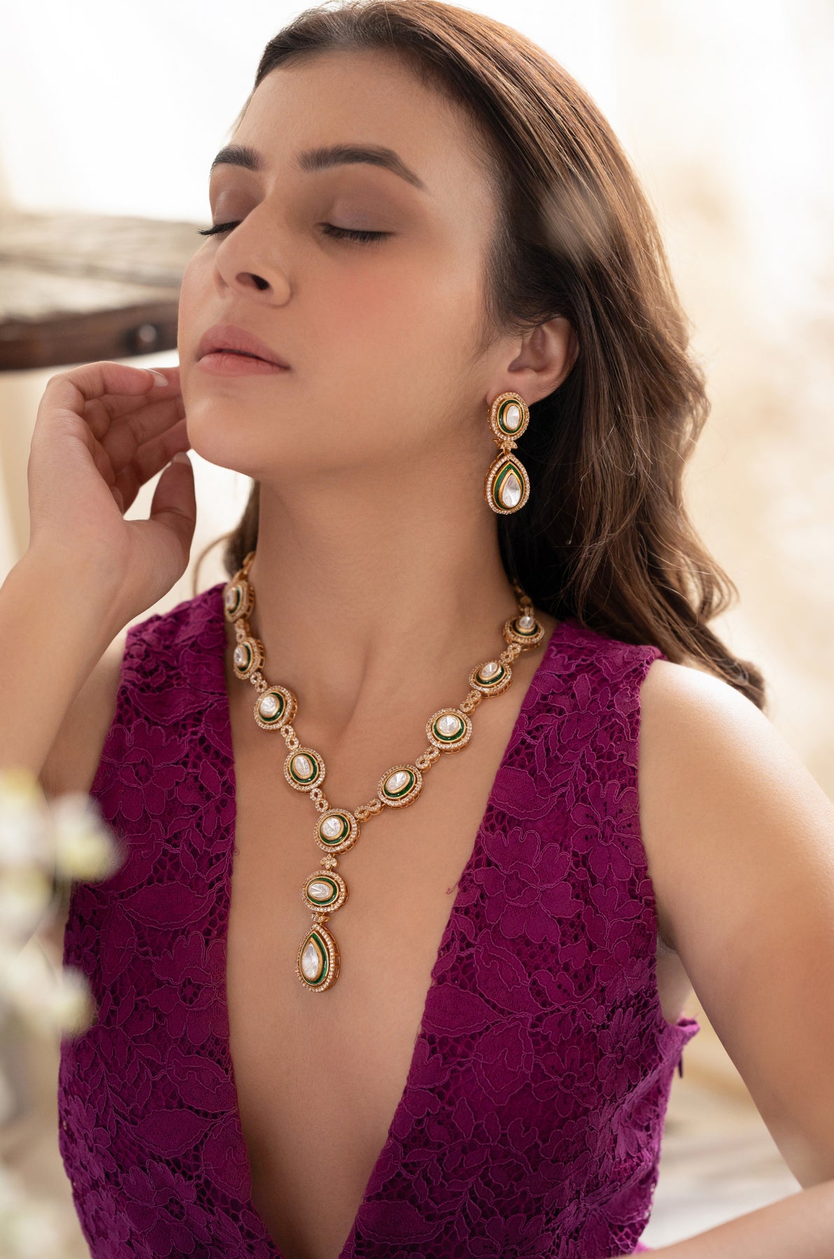 Elevate your elegance with the Tiya necklace set, featuring a contemporary design adorned with sparkling cubic zirconia and vibrant emerald green enameled polki. This exquisite set includes matching earrings, perfectly crafted to complement the necklace, making it ideal for sophisticated occasions and adding a refined touch to your ensemble.
