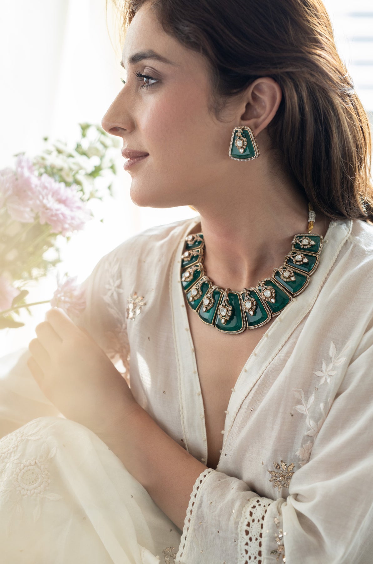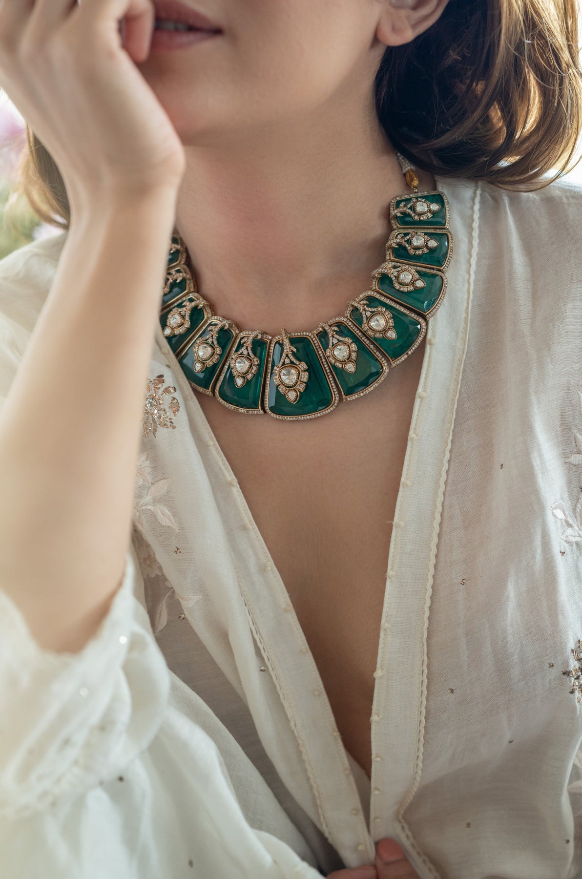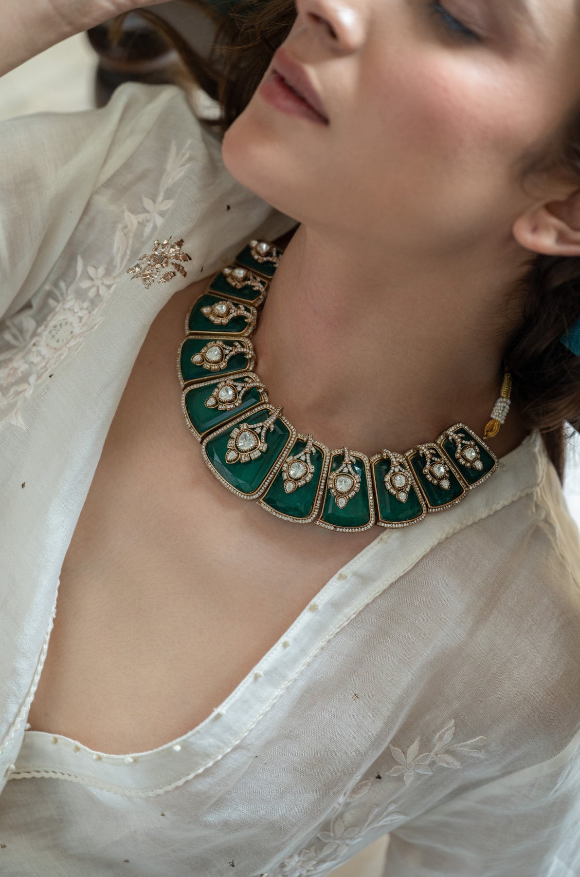 A statement necklace handcrafted with rich emerald doublet stones, set in a bold collar style. Each segment is embellished with uncut polki and highlighted with cubic zirconia accents for added brilliance. Paired with matching earrings, this set beautifully blends traditional artistry with a contemporary silhouette, perfect for weddings and festive occasions.