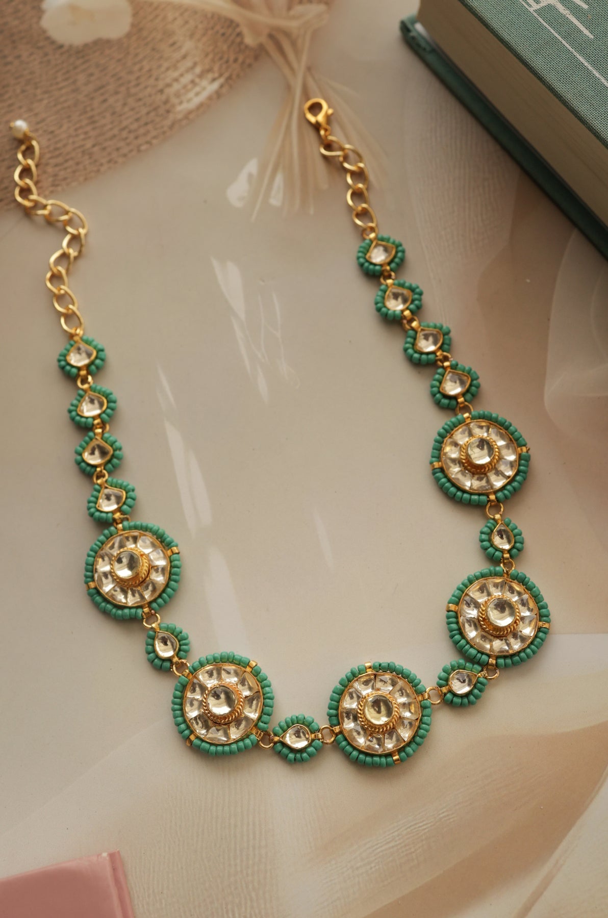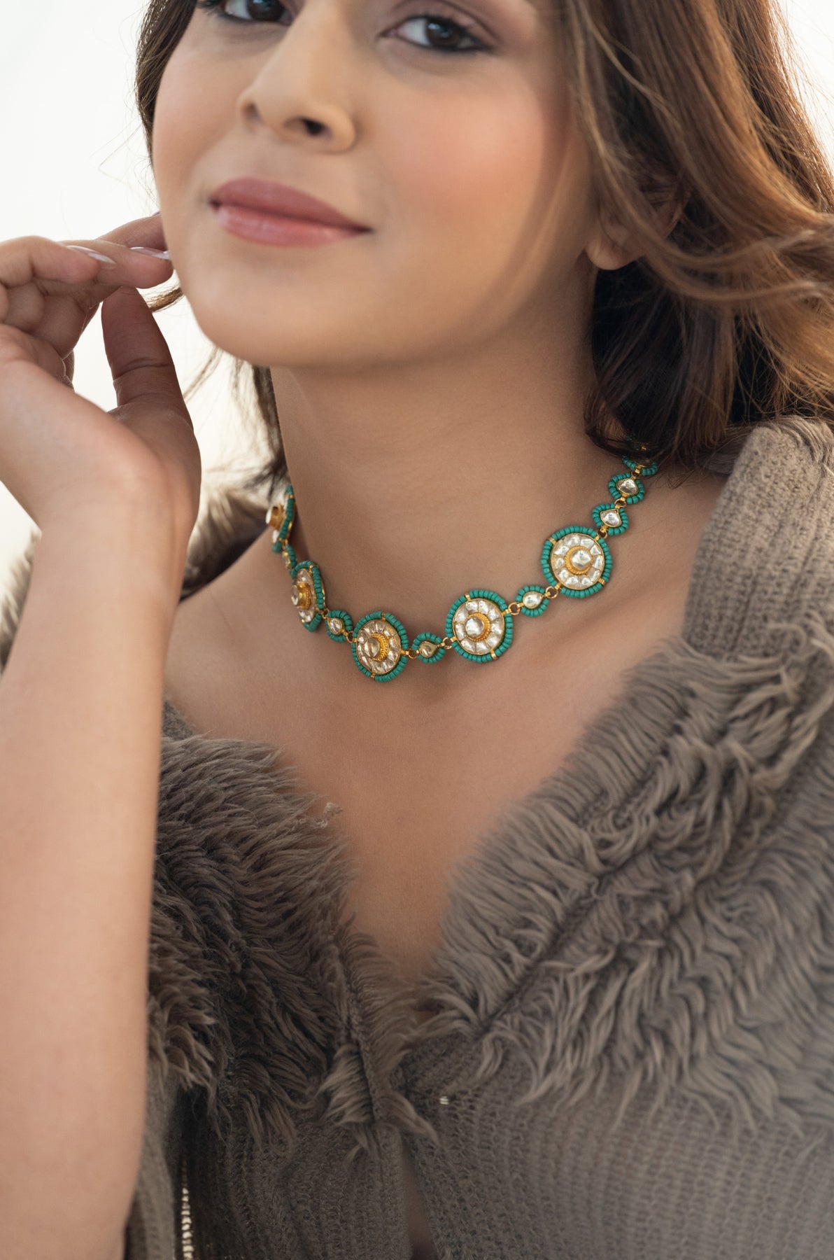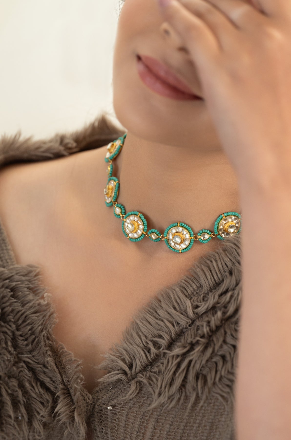 Jena brings timeless elegance with a playful twist! This classic kundan necklace features intricate detailing outlined with vibrant turquoise beads that catch the light beautifully. Perfect for adding a pop of color to traditional wear or elevating your everyday style, this piece celebrates the artistry of traditional craftsmanship with a modern edge. A versatile treasure that transitions effortlessly from celebrations to special moments.