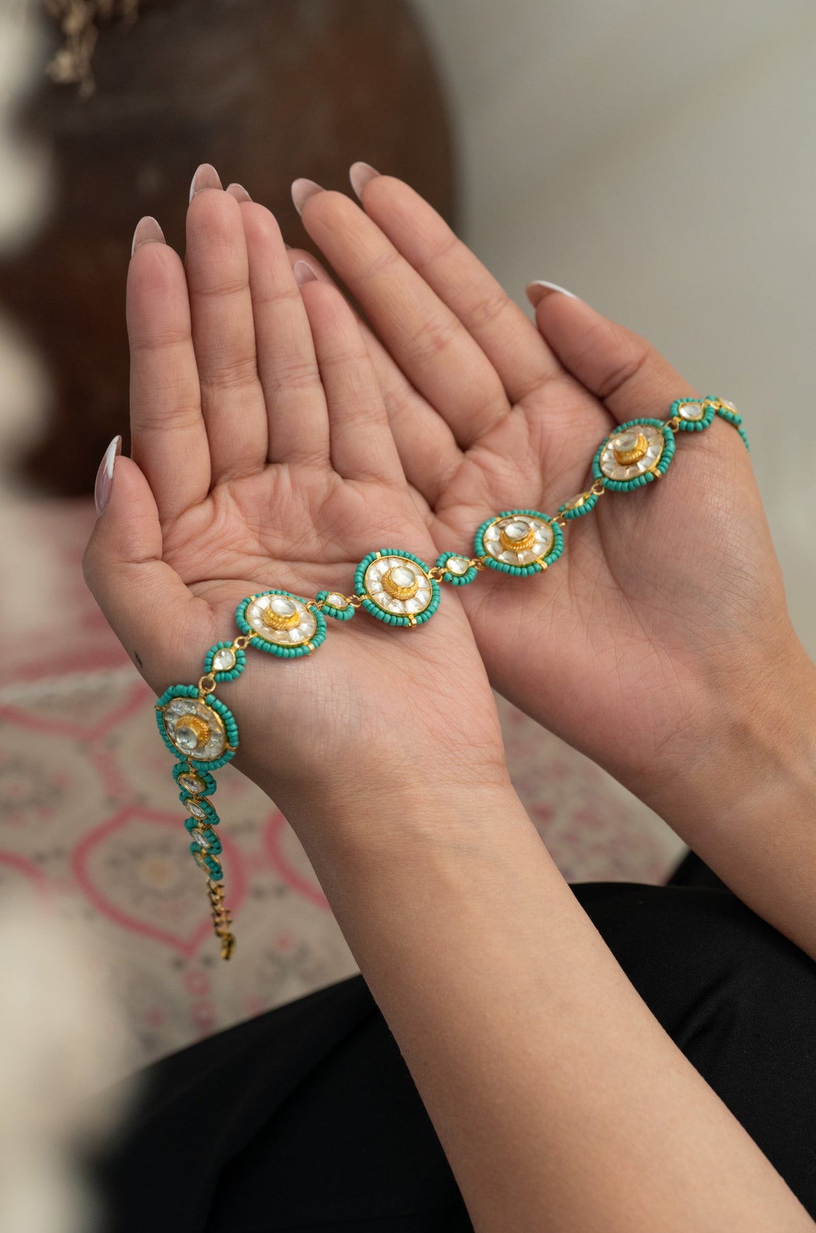 • When handling your jewelry, do so with clean and dry hands. Avoid excessive pulling, twisting, or bending, especially with delicate pieces or those with intricate stringing.