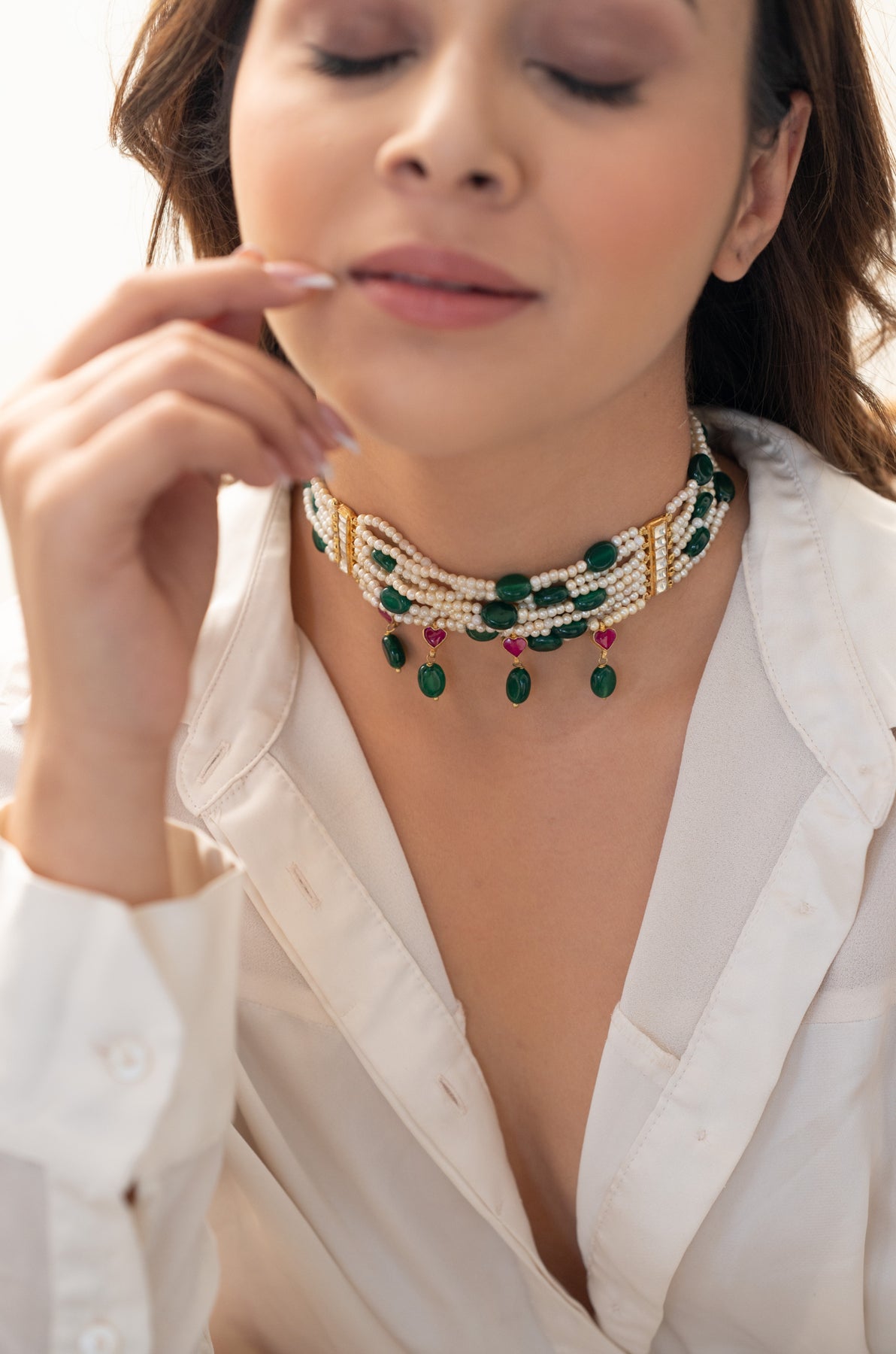 Introducing the Kamakshi necklace, a playful celebration of timeless elegance! This stunning piece weaves lustrous pearls with rich green jade stones, creating a mesmerizing dance of natural beauty. Vibrant red kundan highlights add a touch of regal sparkle, catching light with every movement. Perfect for those who love mixing tradition with contemporary flair, this necklace transforms any outfit into something extraordinary. Whether you're dressing up for a special occasion or adding glamour to your everyday look, this beauty brings joy and sophistication in equal measure.