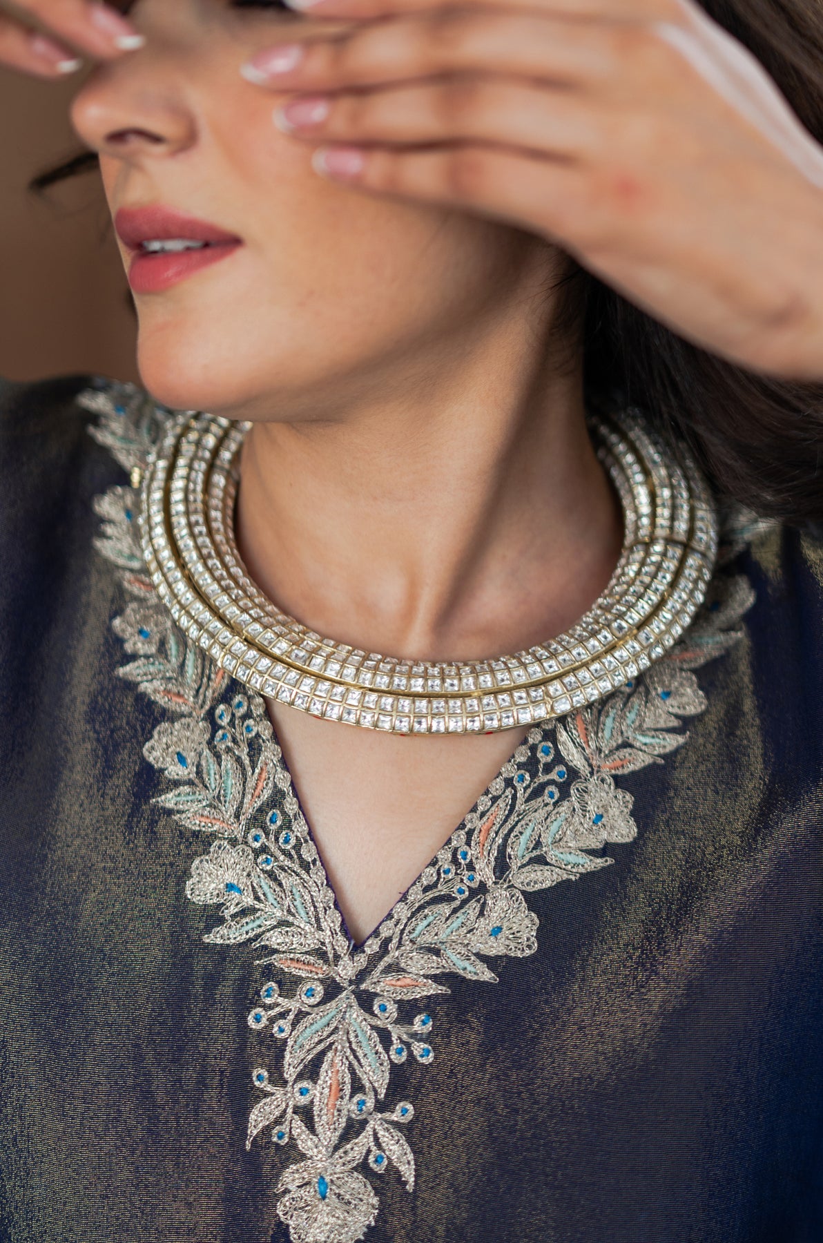 Picture yourself draped in pure royalty with this triple-tiered choker that's basically a geometric masterpiece around your neck. Square polki stones are arranged in a flawless grid formation, stacked in three gorgeous layers that scream sophistication without saying a word. The golden setting wraps everything in warmth, while those crystal-clear polki stones catch the light like tiny windows into luxury. It's the kind of necklace that makes you feel like you just walked out of a palace, perfect for weddings, celebrations, or whenever you want to turn heads with architectural elegance and timeless glamour.