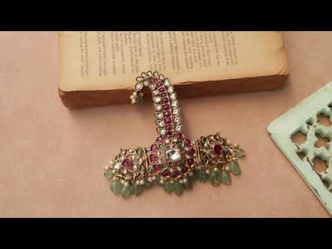 Elevate your groom's complete look with our Manmohak multicolored polki kalgi. Adorned with delicate polki work, this piece adds a touch of elegance and modernity to any hair style. The traditional pink, green, and mint stones enhance the wedding look, creating a perfect balance of luxury and tradition. Experience the perfect change in hair styling with this piece of creativity.