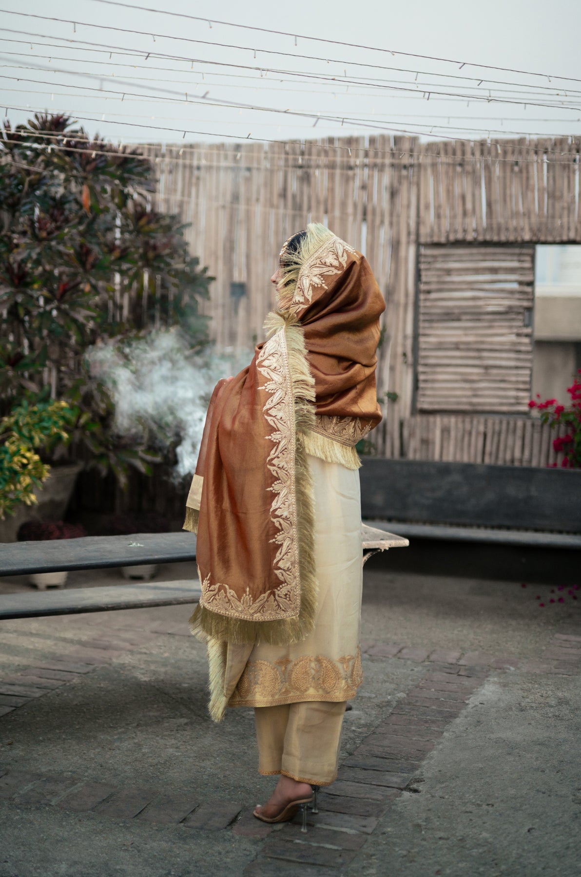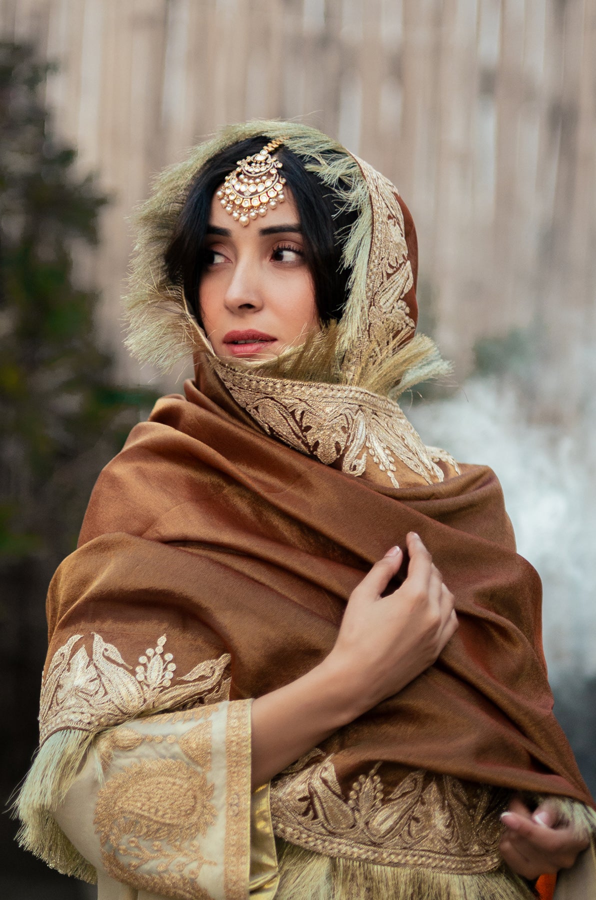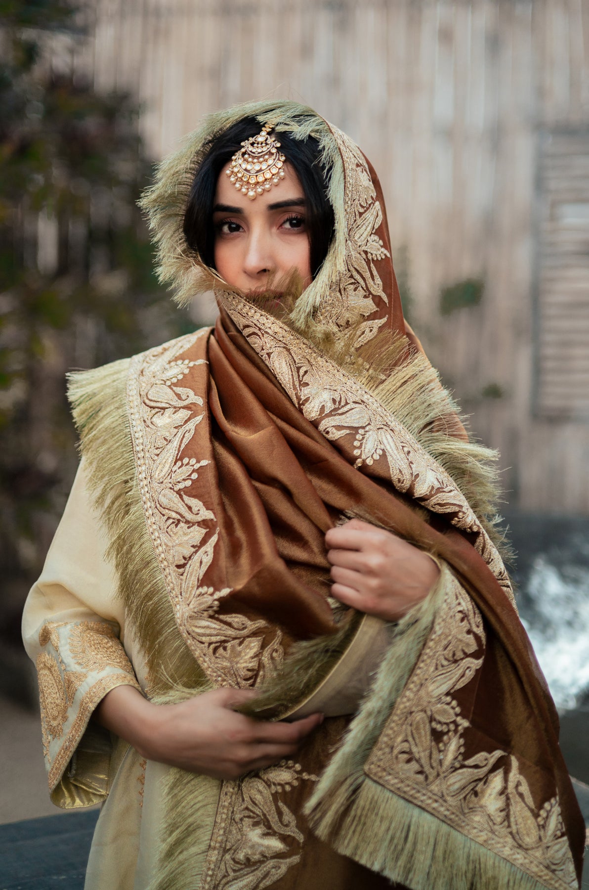 Wrap yourself in the timeless elegance of our Roohani odhini, a traditional drape that whispers stories of heritage with every fold. Crafted from delicate tissue fabric, this brown beauty floats effortlessly around your shoulders, blending classic Kashmiri artistry with everyday grace.