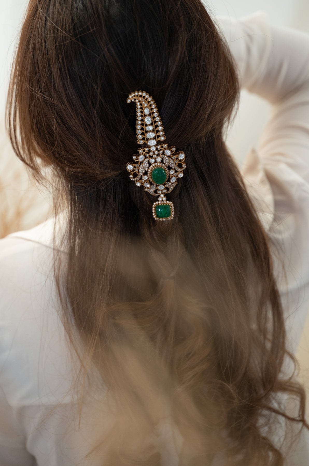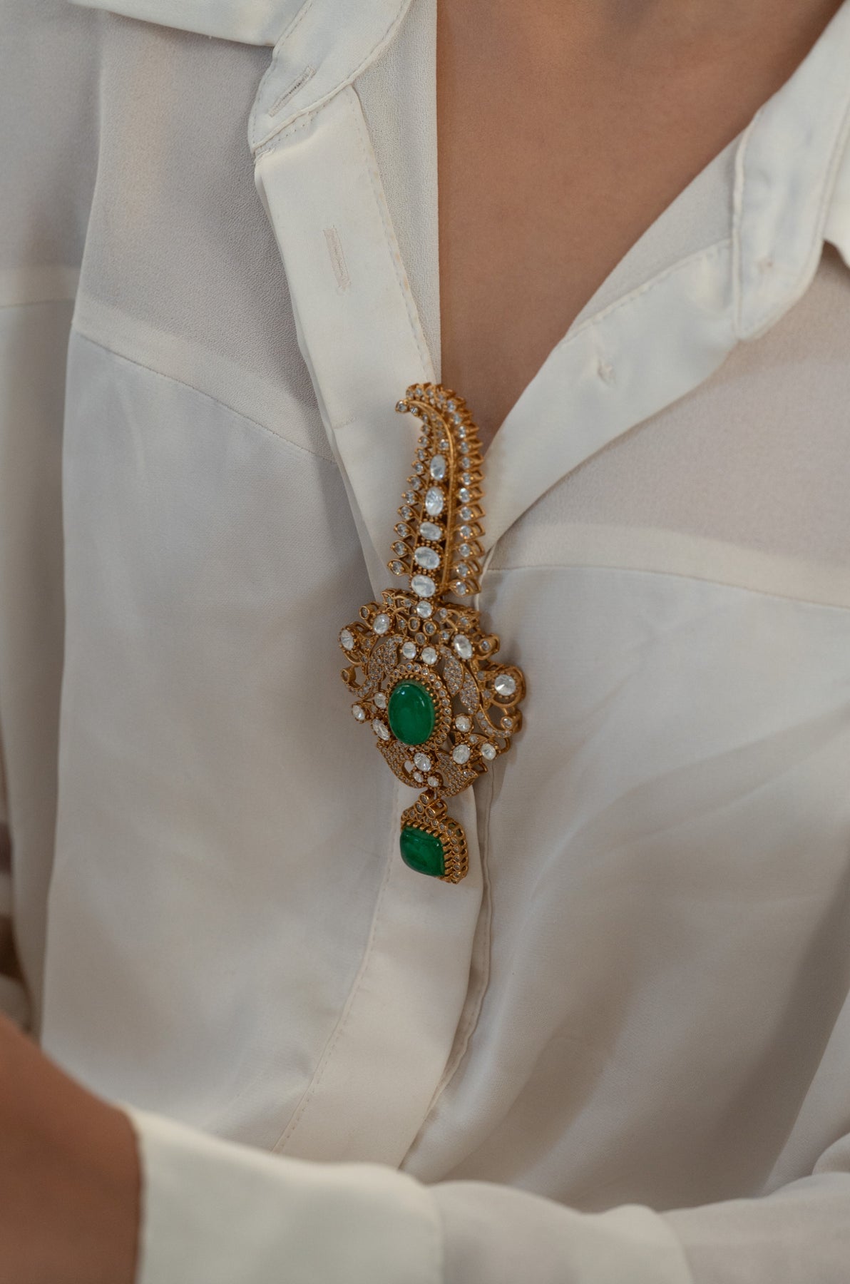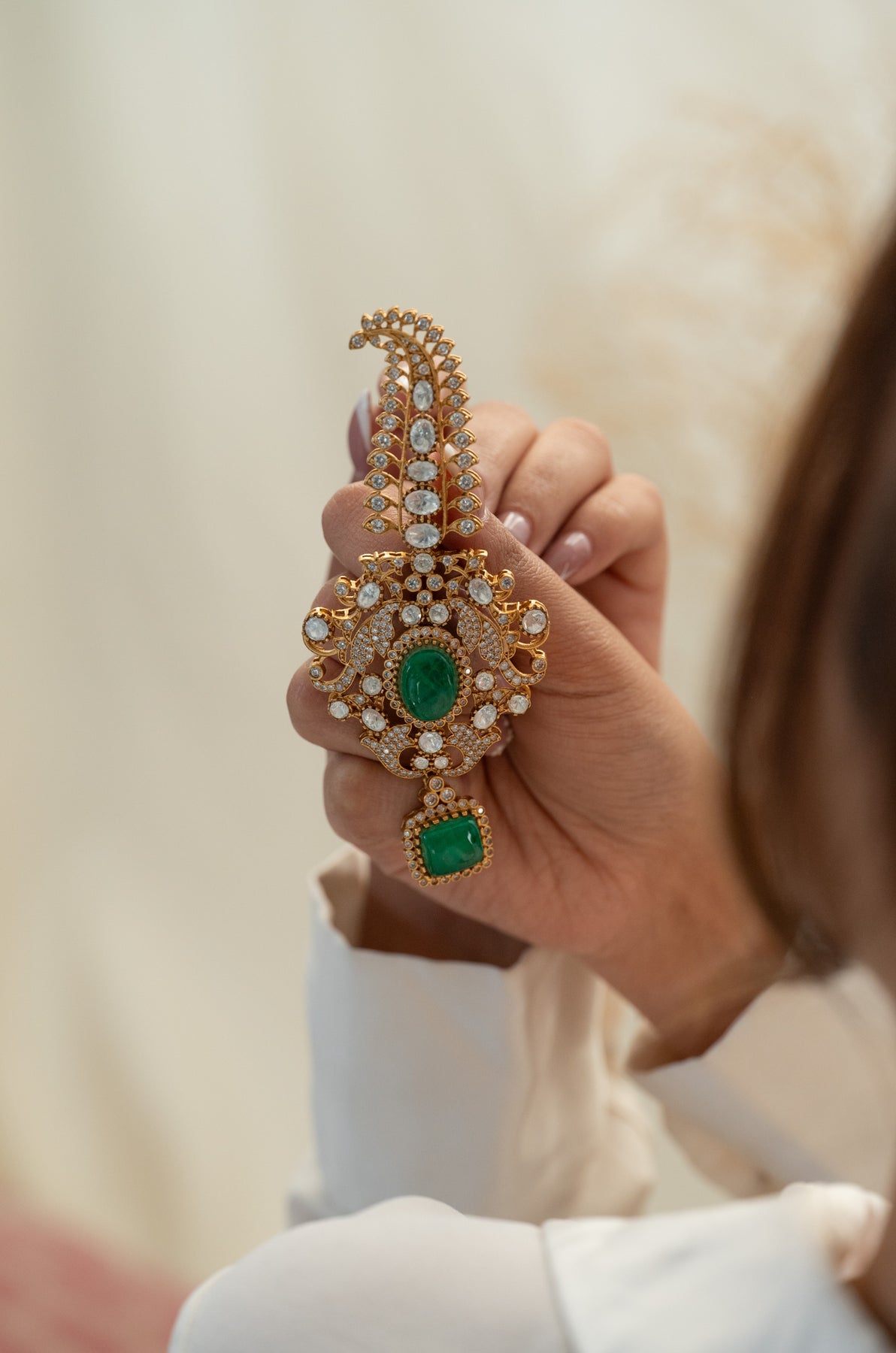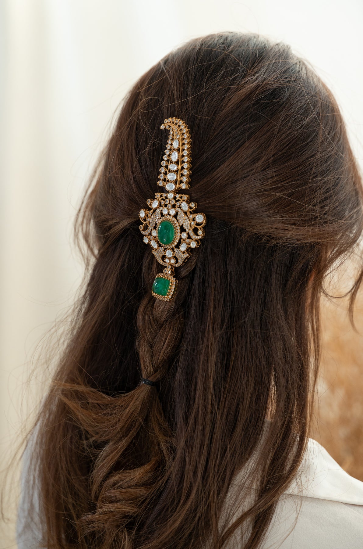 Introducing the Rumi kalgi, a versatile beauty that steals the show whether you're a groom elevating your wedding day look or a bride seeking the perfect braid embellishment. This playful accessory features exquisite polki craftsmanship that sparkles with every movement, while the lush green tones add a vibrant touch to any formal ensemble. Pin it, braid it, style it your way, this ornament brings just the right amount of glamour and tradition to make your celebration unforgettable. Because looking fabulous shouldn't be limited by gender or convention.