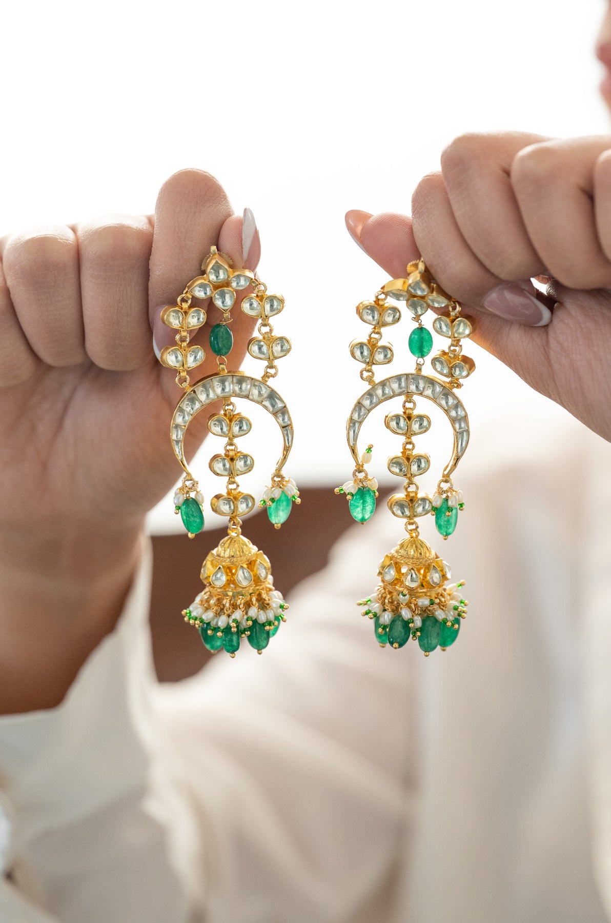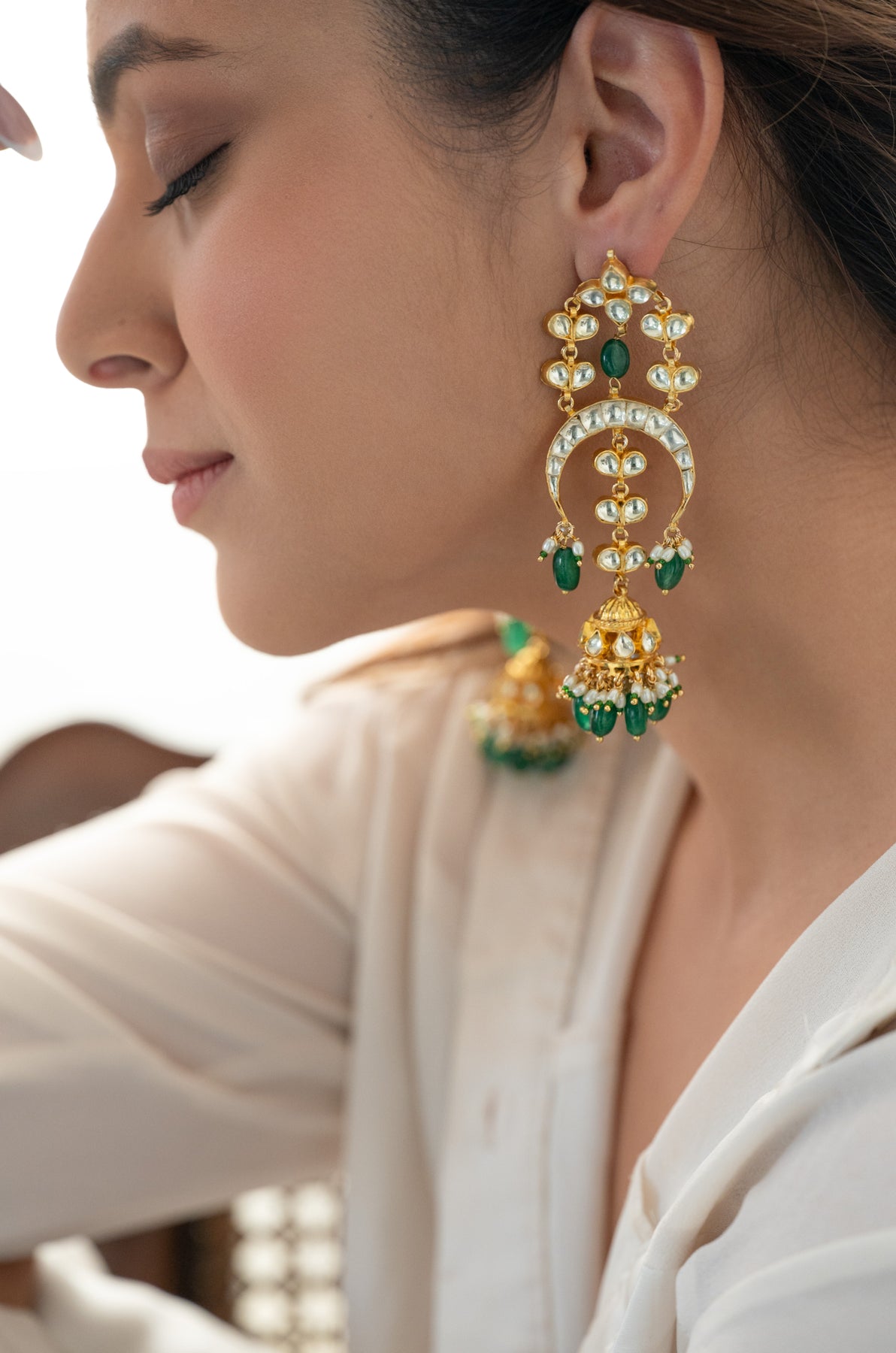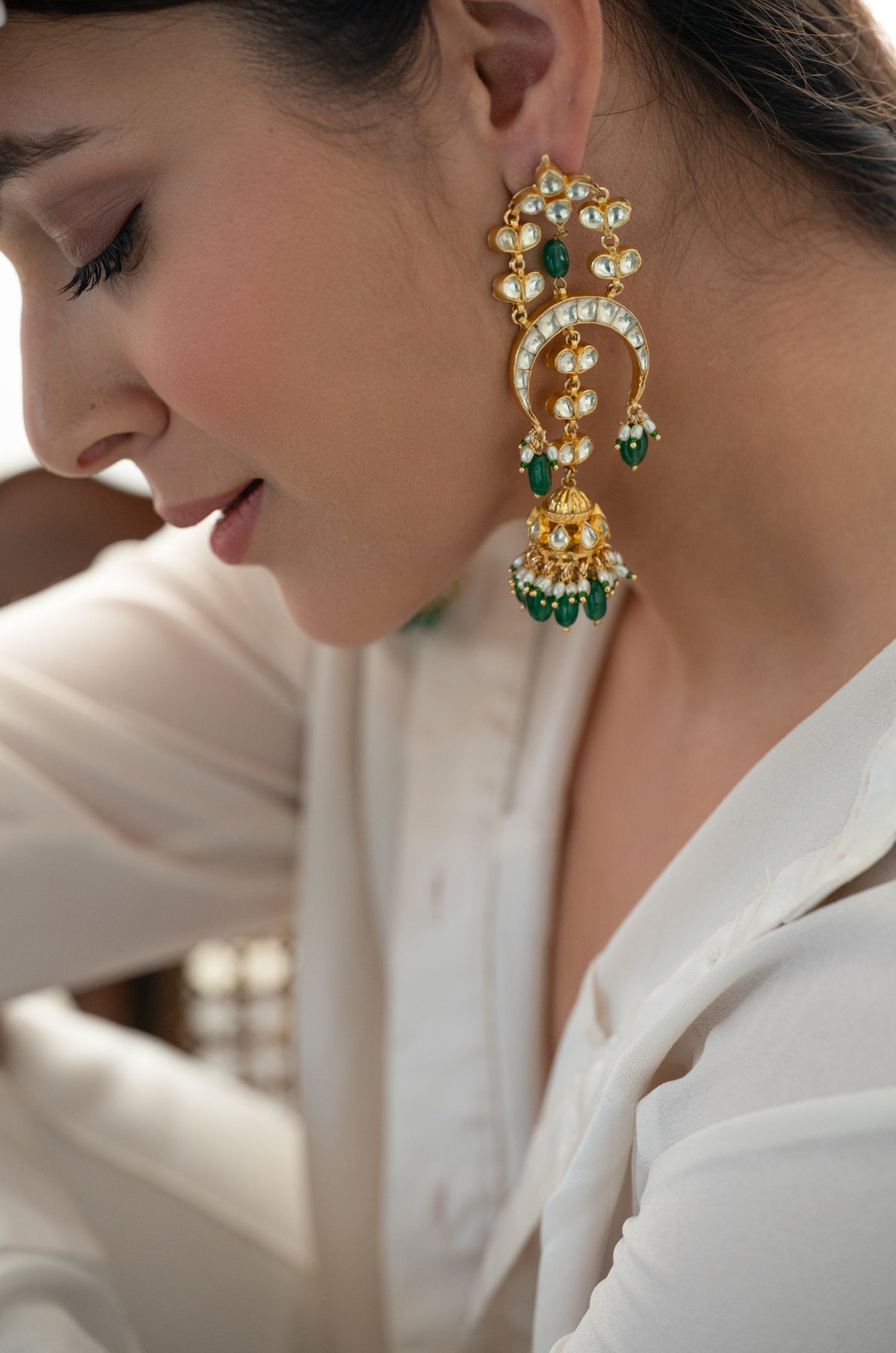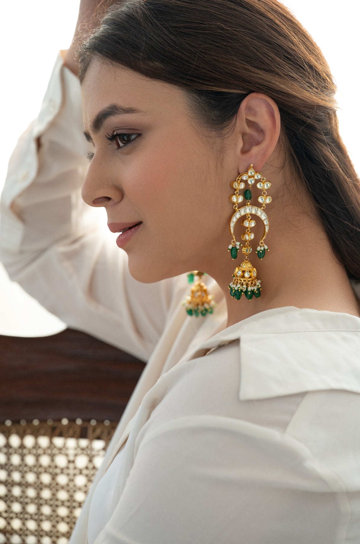 Introducing the Tahira jhumka, where timeless elegance meets a pop of natural sparkle! These stunning earrings feature intricate kundan work paired with vibrant green natural stones that catch the light beautifully. The classic jhumka silhouette swings with grace, making them perfect for celebrations, weddings, or whenever you want to add a touch of traditional charm with a modern twist. Lightweight yet impactful, these beauties are your go-to accessory for turning heads and spreading joy!