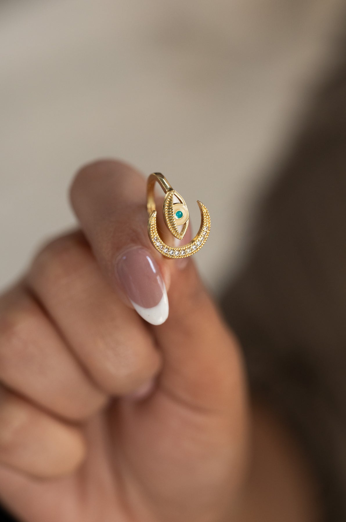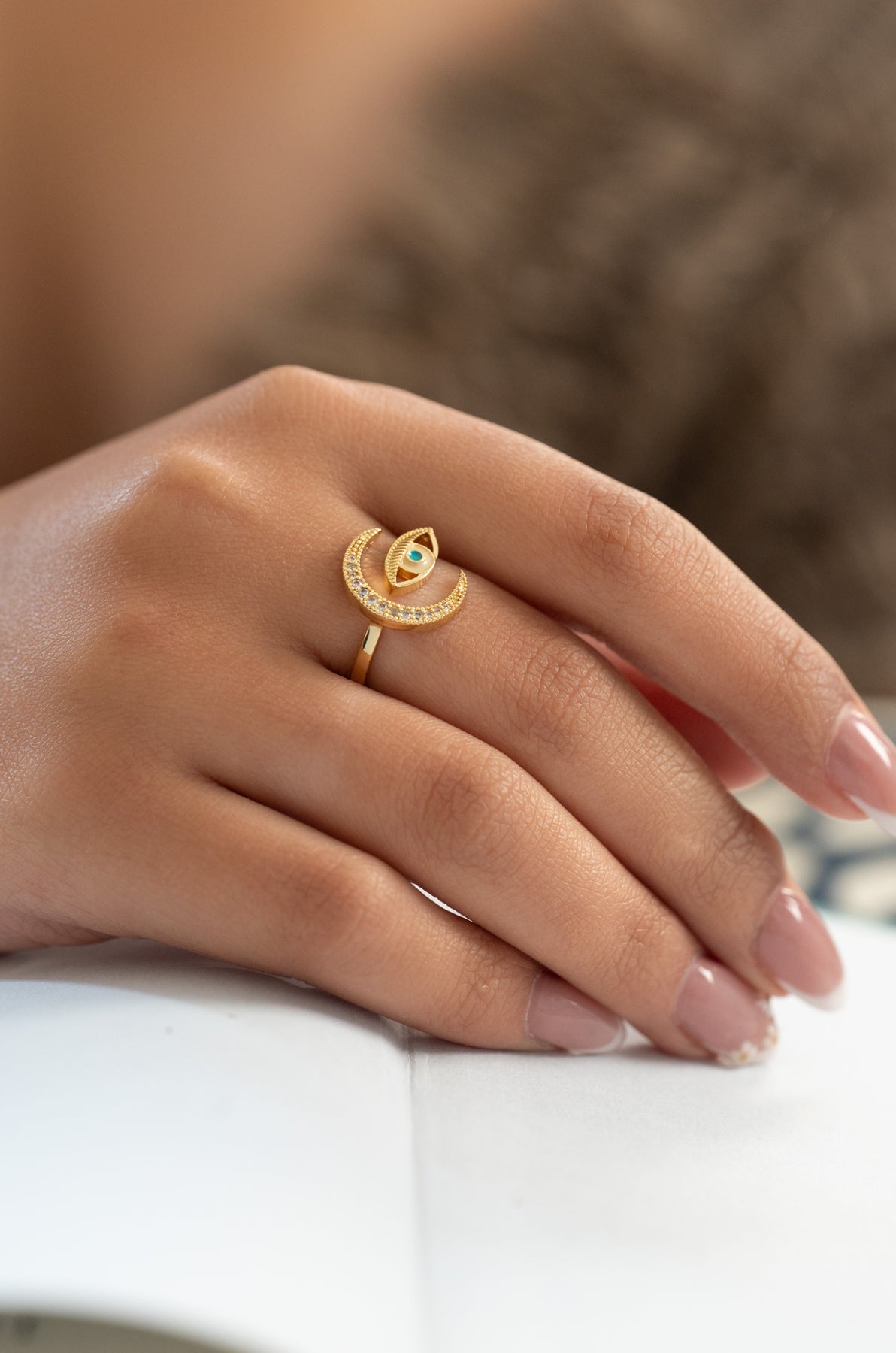 Slip on a little protection with serious style. This sleek evil eye ring keeps the good vibes flowing while the bad ones bounce right off. Minimalist design, maximum mystique. A cheeky nod to tradition that works with everything in your jewelry box.