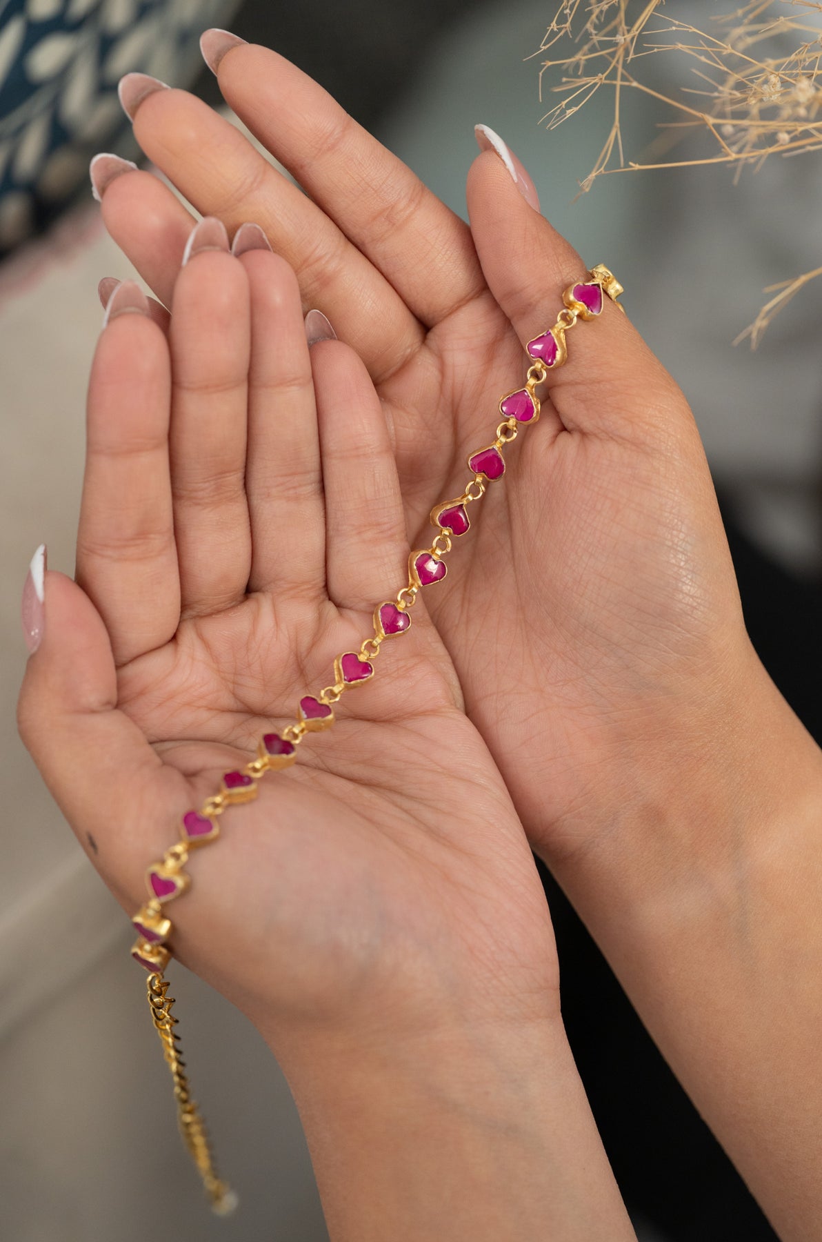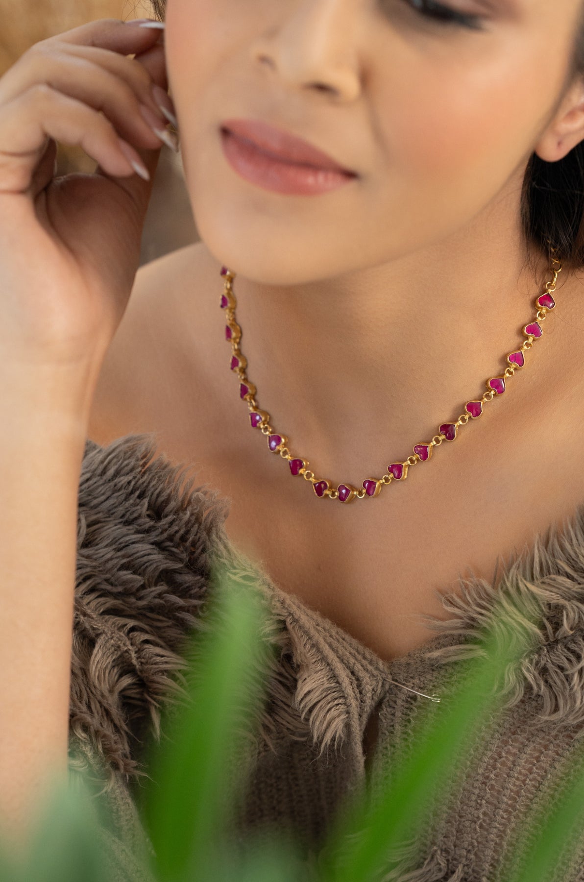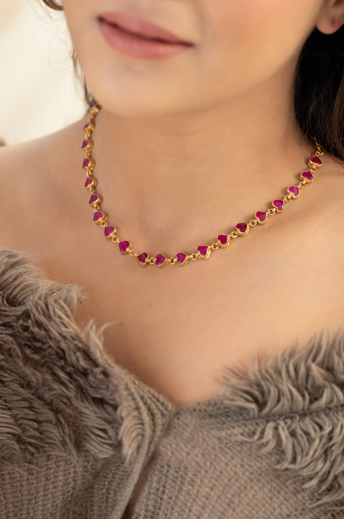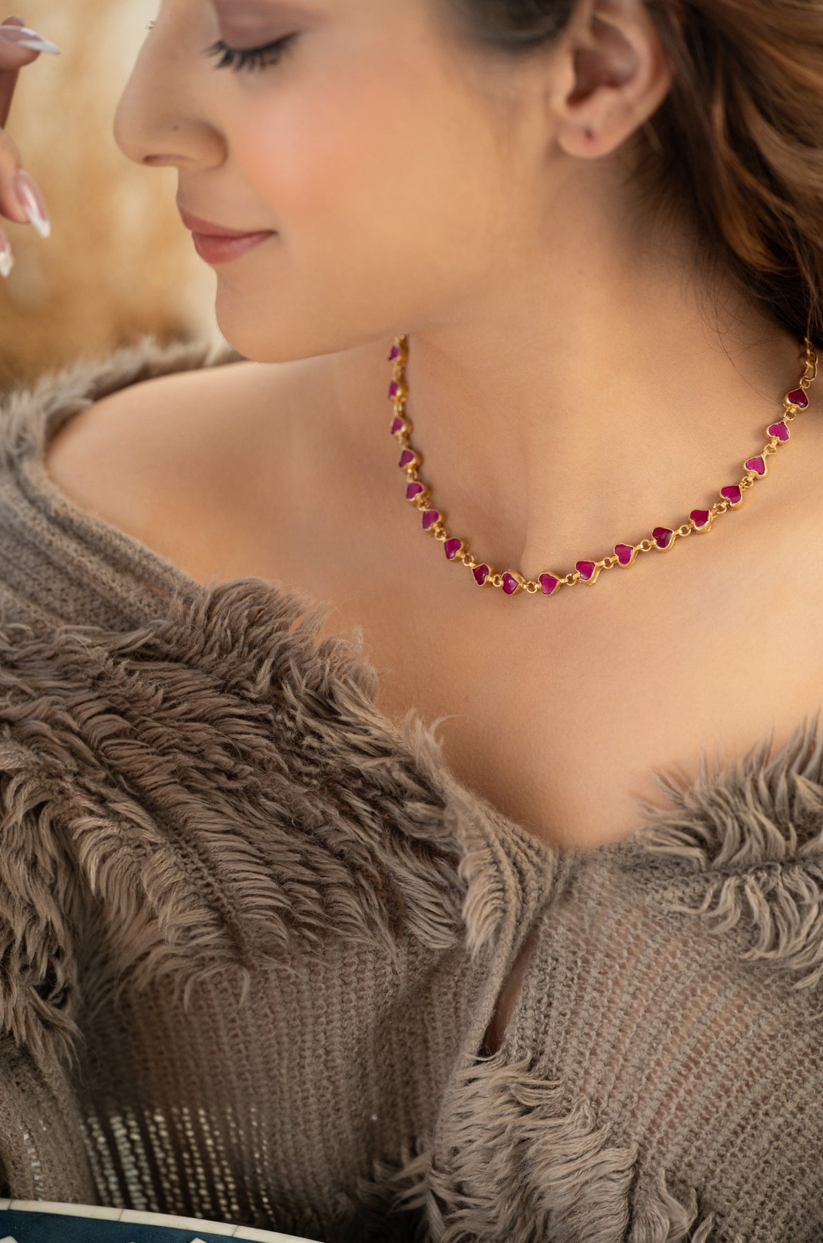 Steal hearts with the Yami necklace, where timeless craftsmanship meets romantic flair. This stunning heart-shaped units features intricate kundan work adorned in rich red hues that capture light beautifully. Perfect for celebrations, special occasions, or whenever you want to add a touch of elegance and charm to your look. A piece that speaks volumes without saying a word.