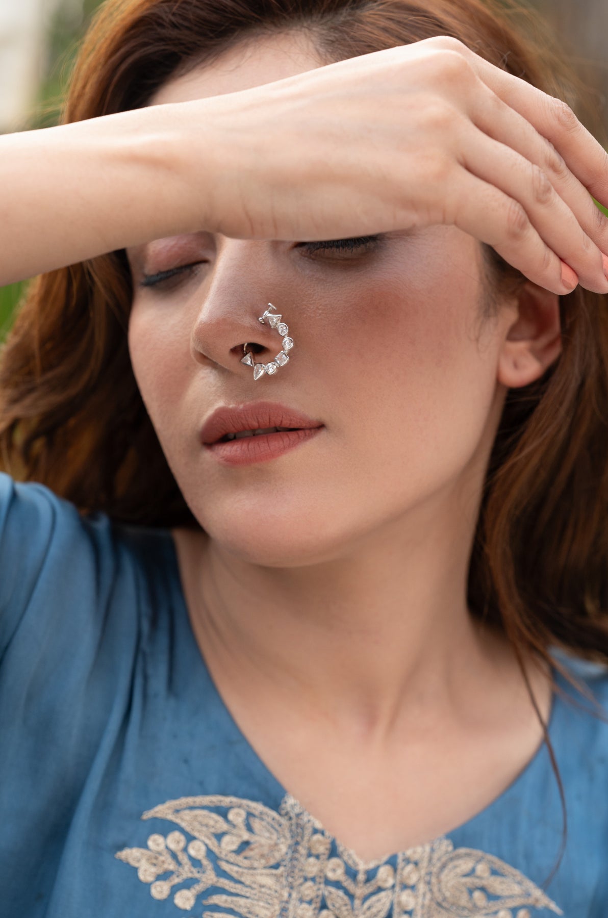 Bailey adds a touch of luxury to any traditional outfit for the upcoming festivities, effortlessly. The delicate and simplistic polki nosepin is adorned with sophistication and refinement, providing a lavish experience.