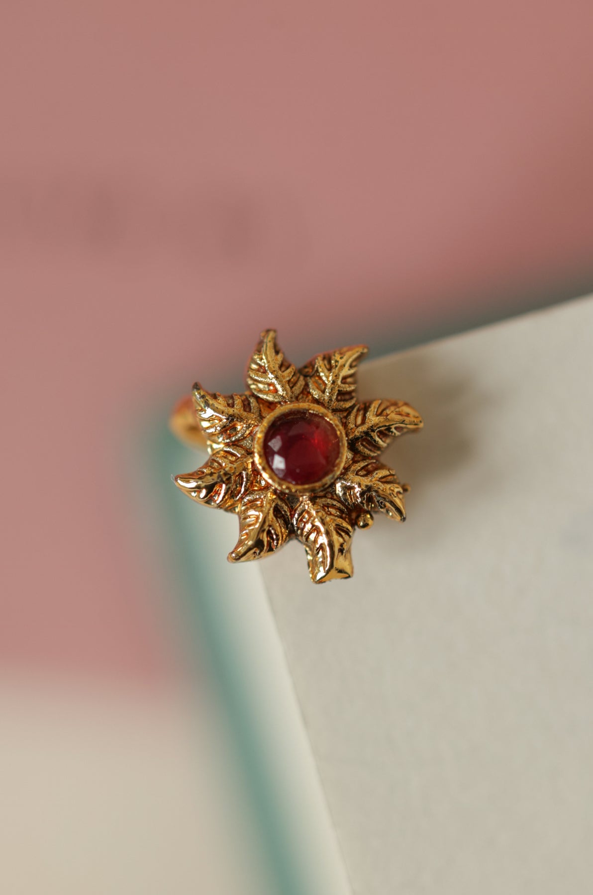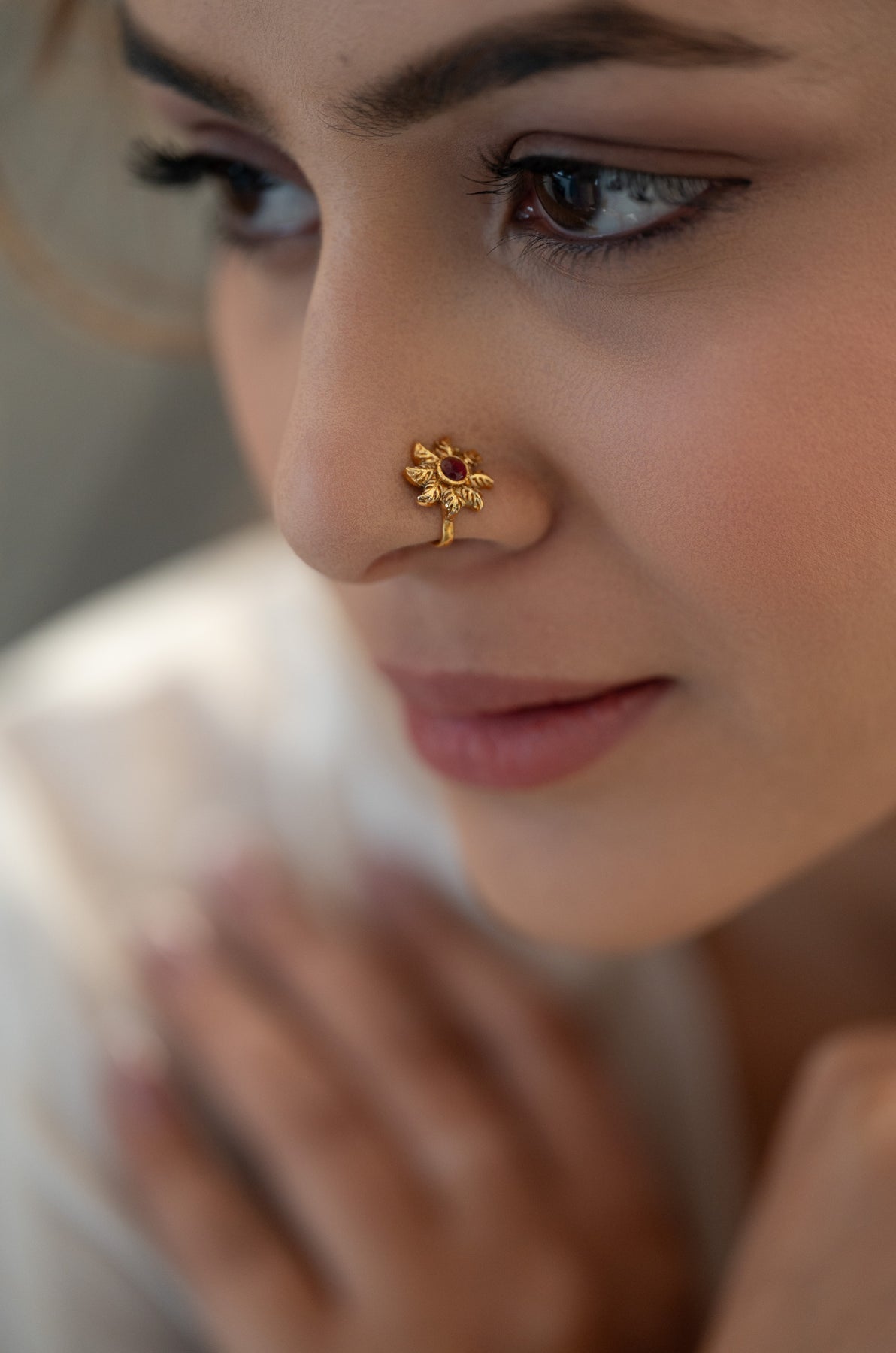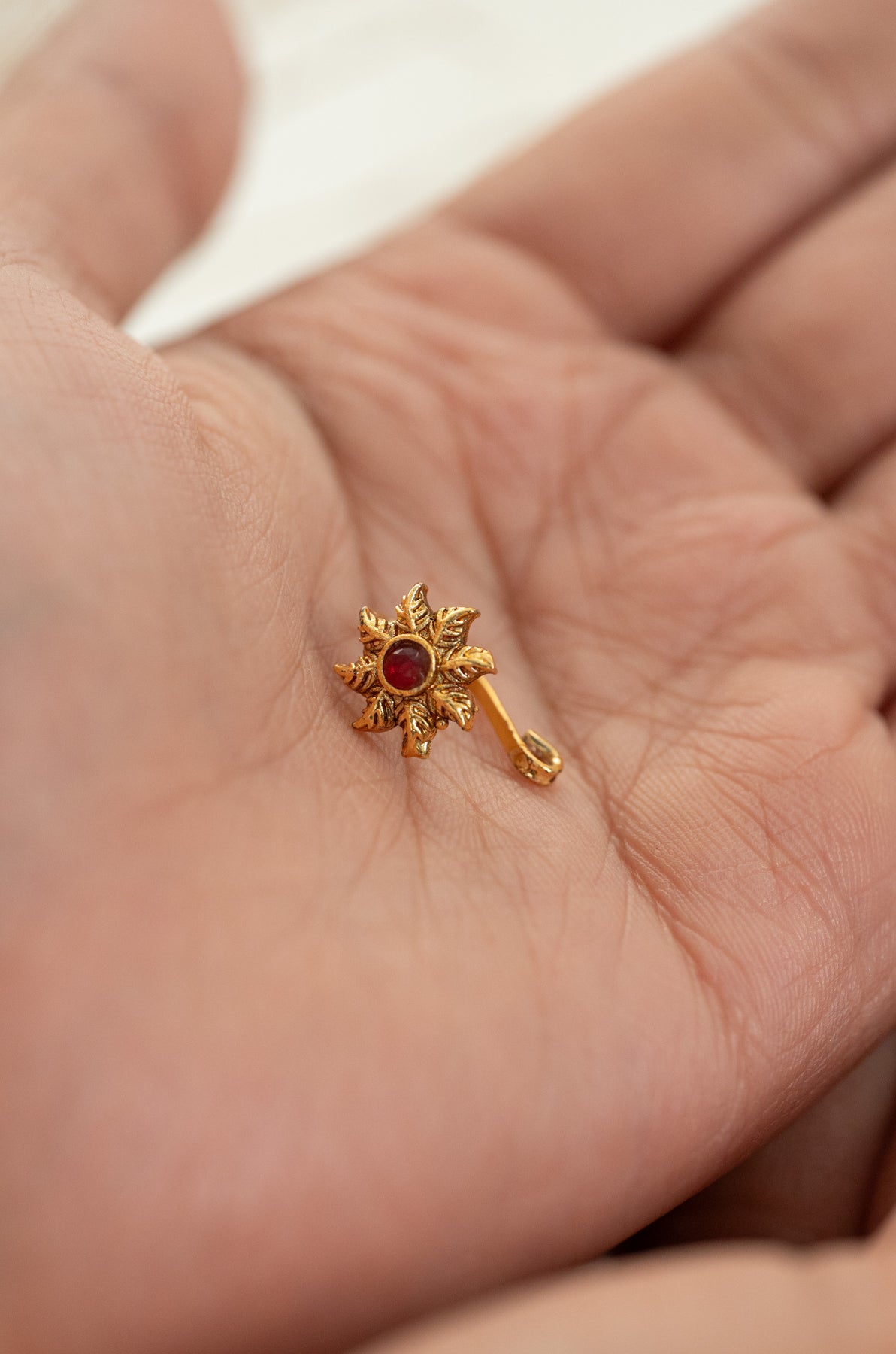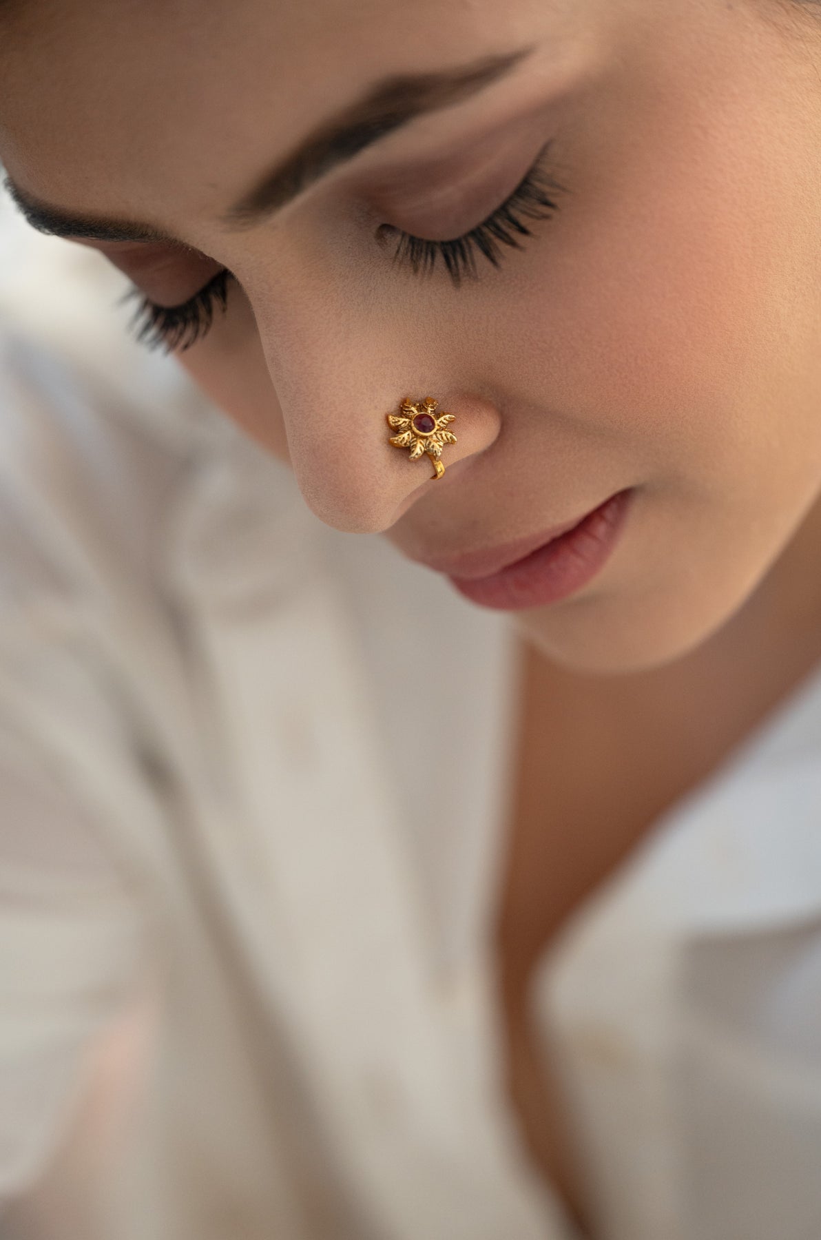 Add a touch of classic charm with the Chaya nosepin. This traditional gold-toned nosepin features a beautiful sunburst design with a central ruby-red stone. Perfect for enhancing your ethnic look with subtle elegance and a vibrant accent