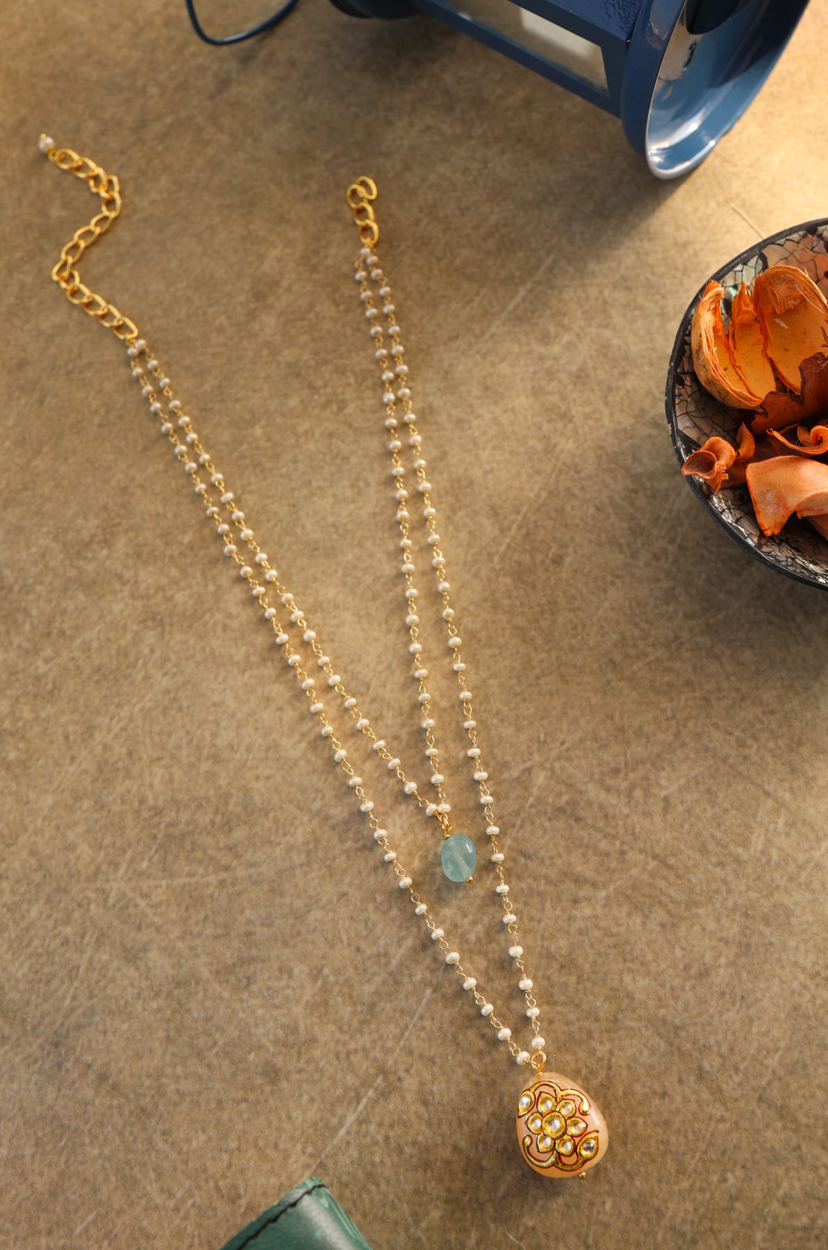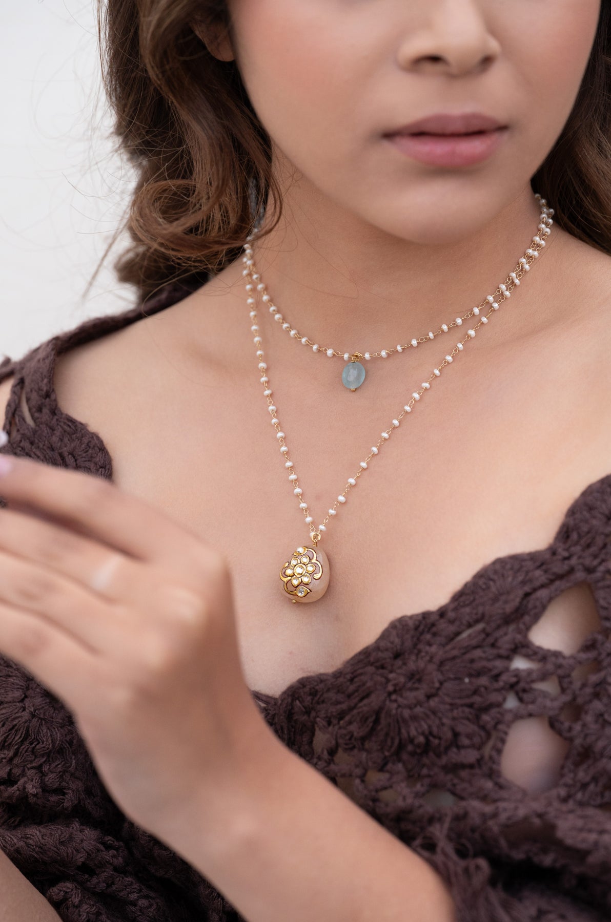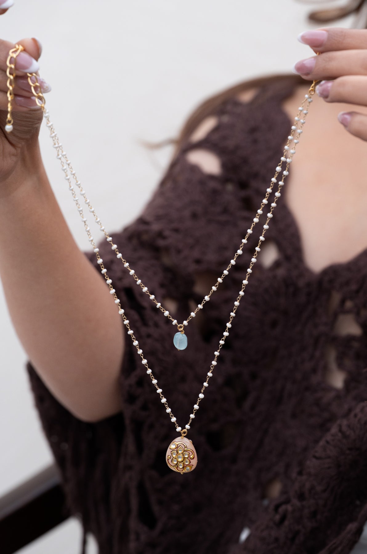Elevate your elegance with the Carina layered necklace. This exquisite necklace features layers of delicate pearl chains adorned with a stunning rose quartz pendant, accented with intricate Tanjore art. Embrace the artistry and sophistication of this one-of-a-kind piece.