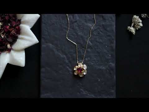 Elevate every moment with this stunning Lila necklace. Its intricate floral design features the celestial shimmer of moissanite polki and the fiery allure of ruby red stone, embodying timeless elegance for everyday wear. From delicate details to a radiant glow, this pendant will undoubtedly become an essential addition to your collection.