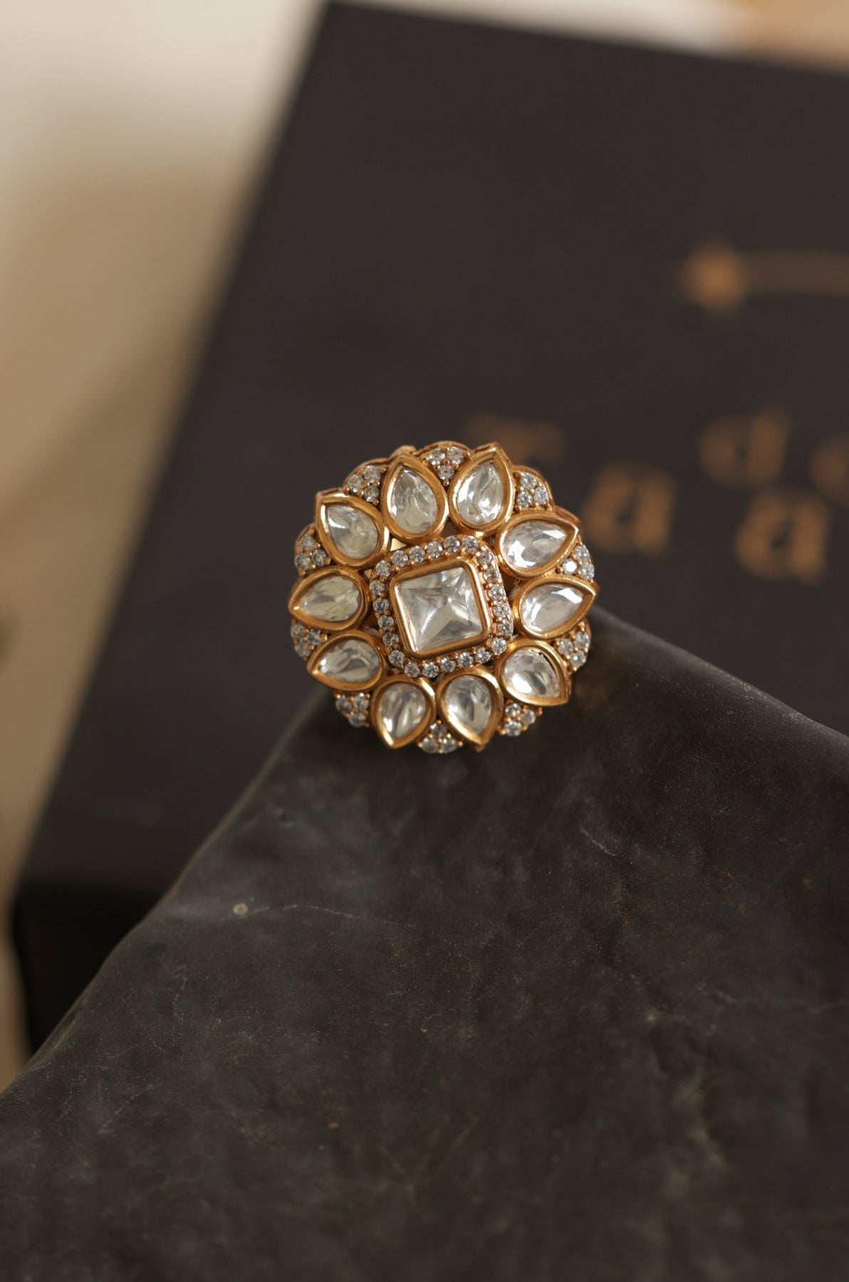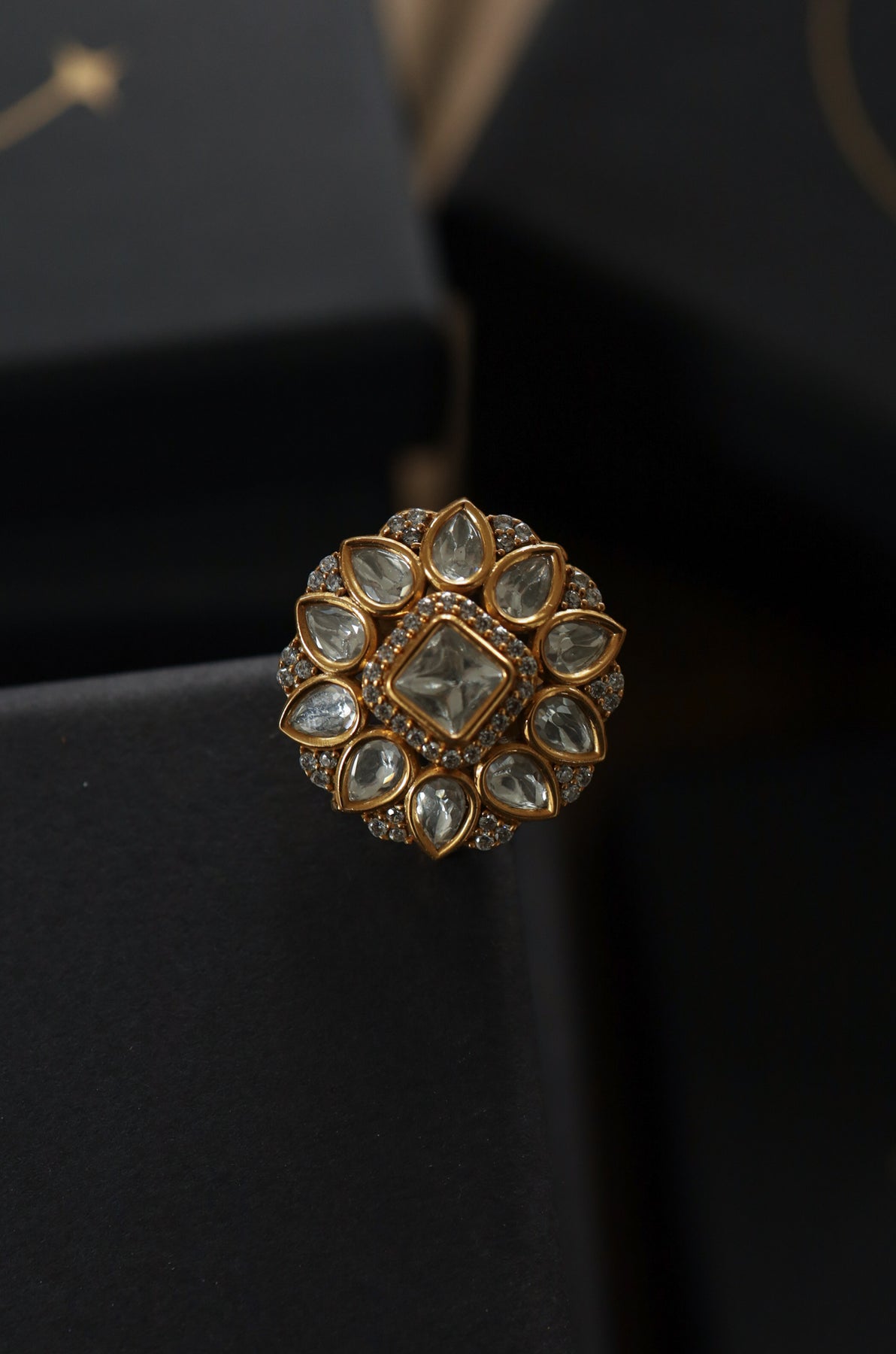 Step aside for Weshwa, the ring that shouts elegance loud and clear! Featuring a massive uncut Polki stone surrounded by sparkling gold and diamond-like accents, this dazzling piece is bold, brilliant, and royally striking. Whether you're sipping chai or toasting with champagne, Weshwa guarantees your hands steal the spotlight.