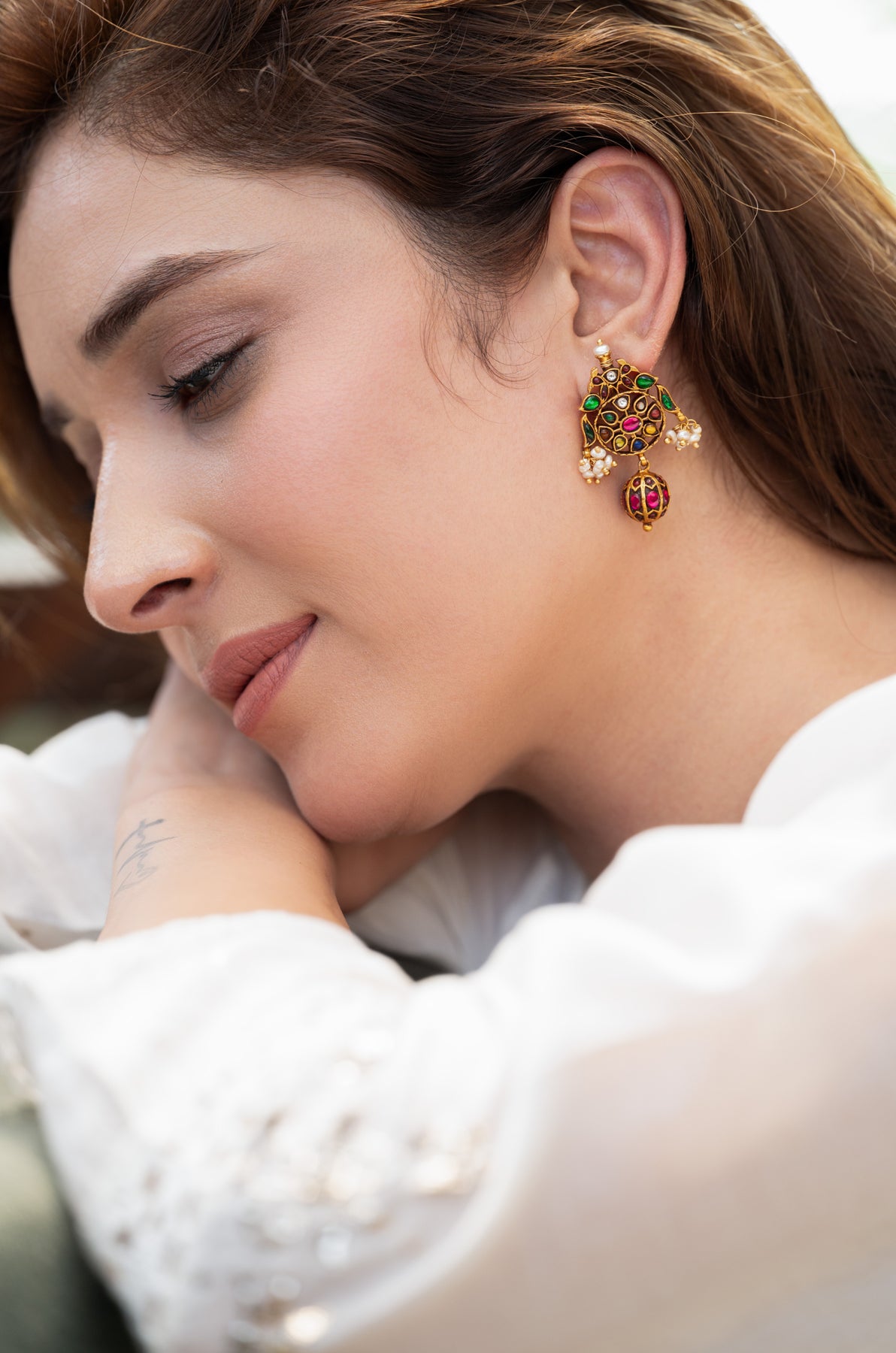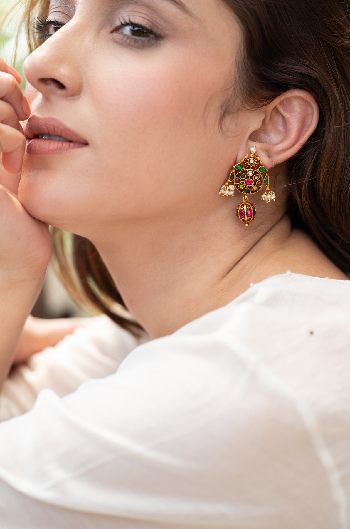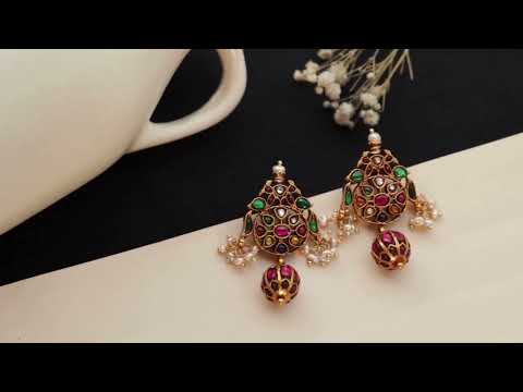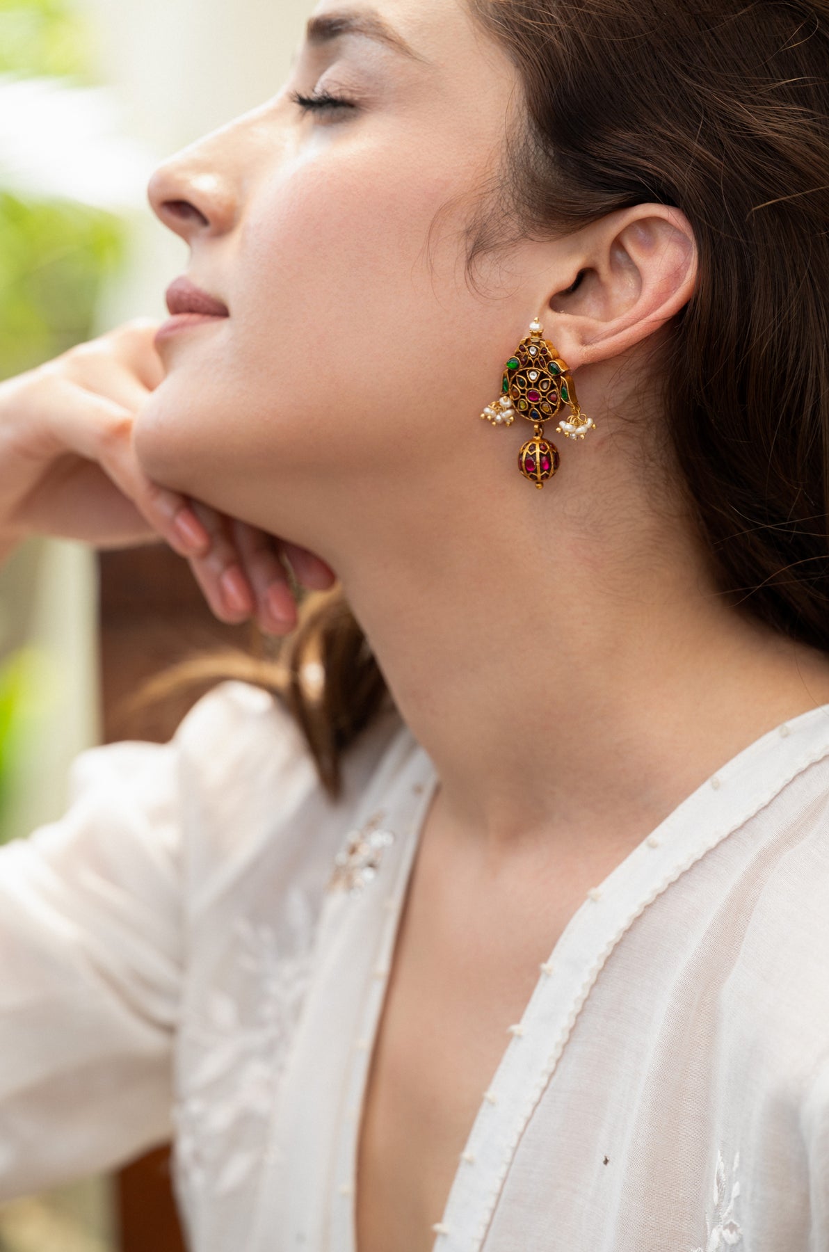 The detailed dome-shaped design is accented with delicate clusters of pearls and topped with a miniature finial, reminiscent of a regal kalash. A bejeweled globe bead hangs at the bottom, adding a subtle festive touch with every movement. Ideal for celebrations, temple visits, or whenever you want to infuse your outfit with a refined yet joyful statement.