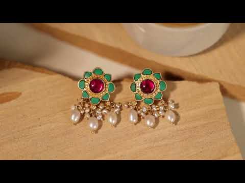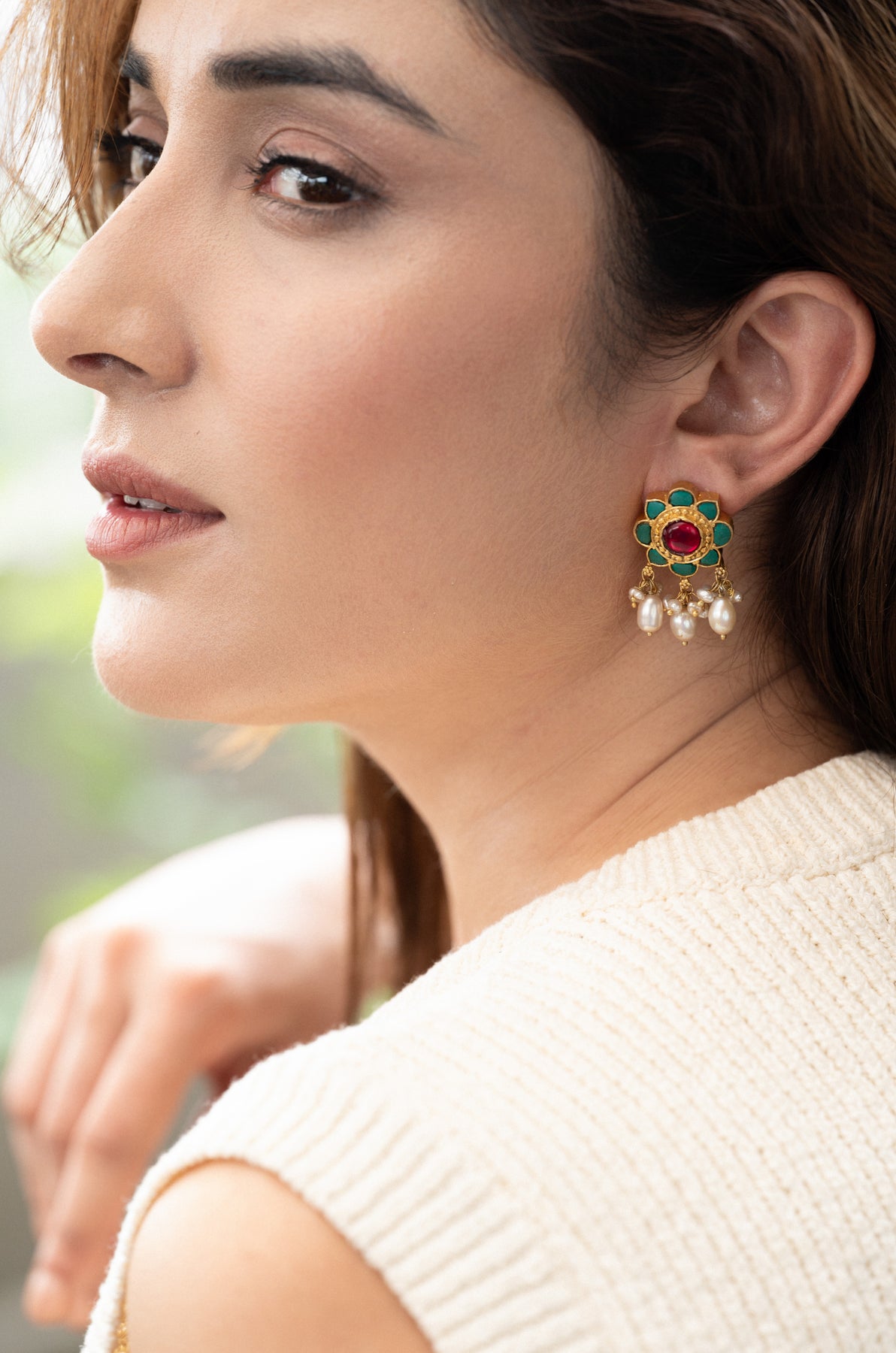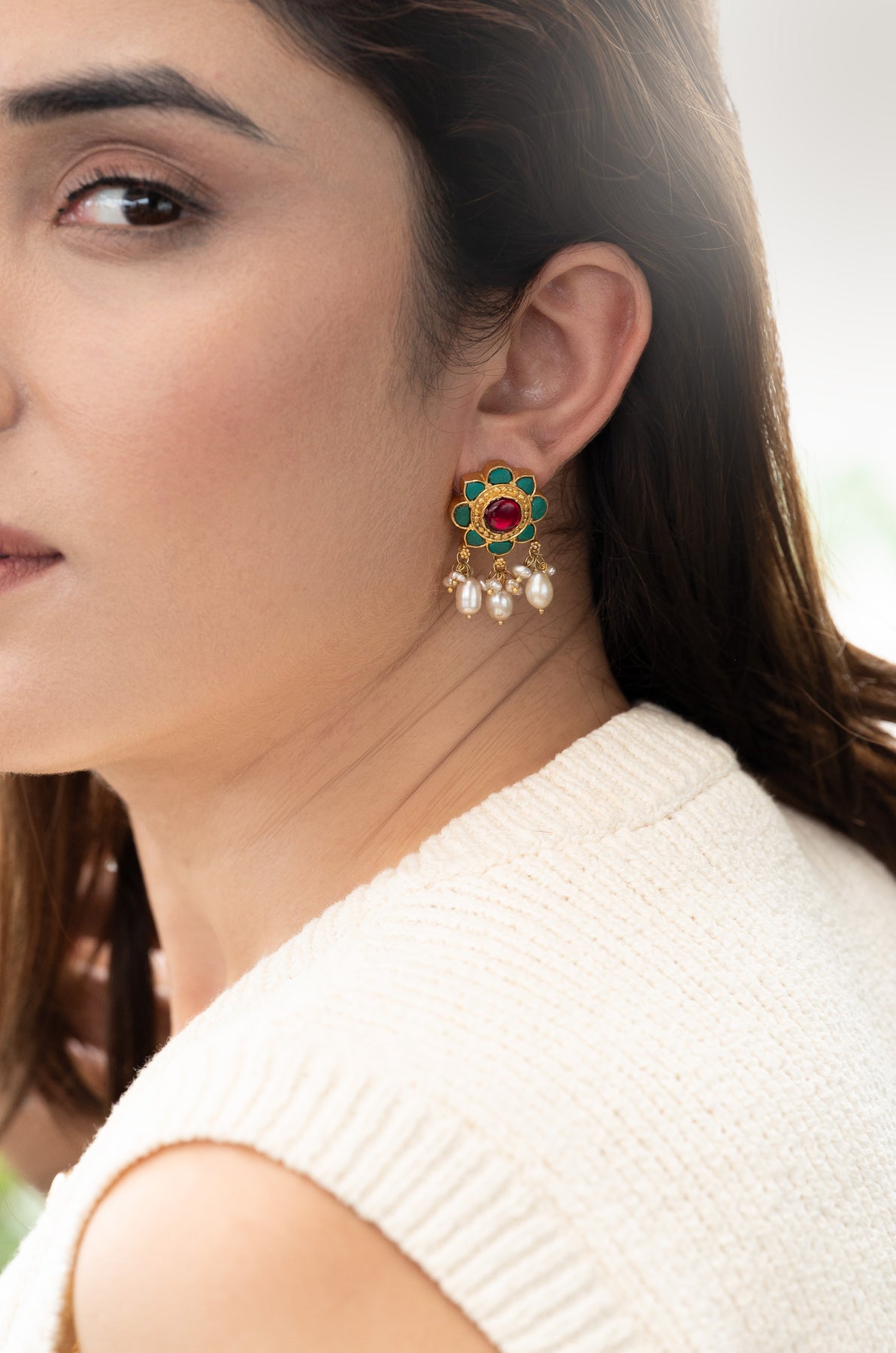 These delightful earrings are crafted from fine silver and coated with a luminous gold finish, blending playful elegance with a royal feel. Shaped like a flower, each piece centers on a striking ruby-red stone surrounded by green petals. The bottom edge features clusters of freshwater pearls in assorted shapes, adding gentle movement and sophistication. Lightweight and striking, they are ideal for festive events, traditional outfits, or enhancing any special occasion with refined charm.