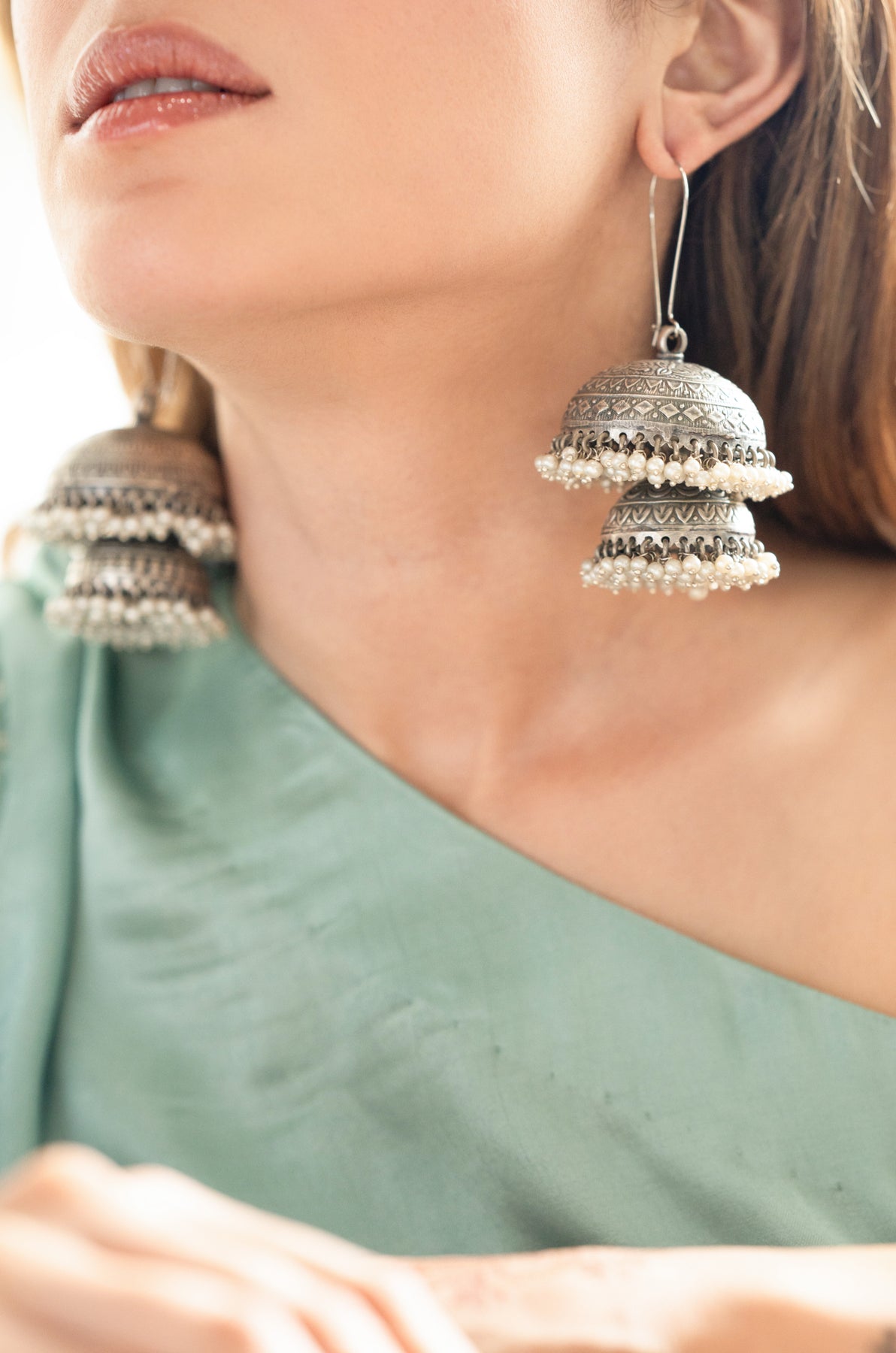 Enhance your bridal ensemble with the graceful movement of these silver jhumka earrings, perfectly complementing a classic silk saree with a majestic flair. The Hania jhumkas blend silver and pearl in a harmonious design, boldly showcasing traditional craftsmanship. Their intricately detailed dual domes, reminiscent of temple bells, reflect the artisans’ meticulous skill. More than mere adornments, these stunning earrings embody India’s rich cultural heritage and promise to become treasured heirlooms.
