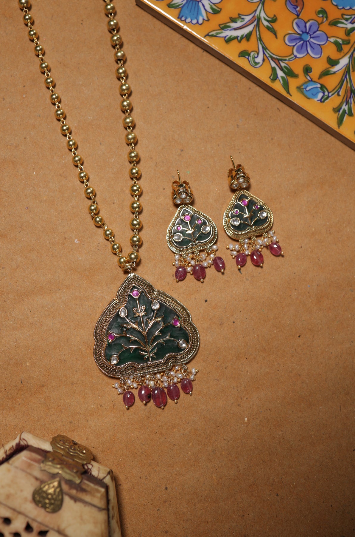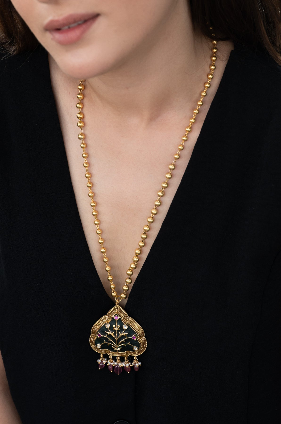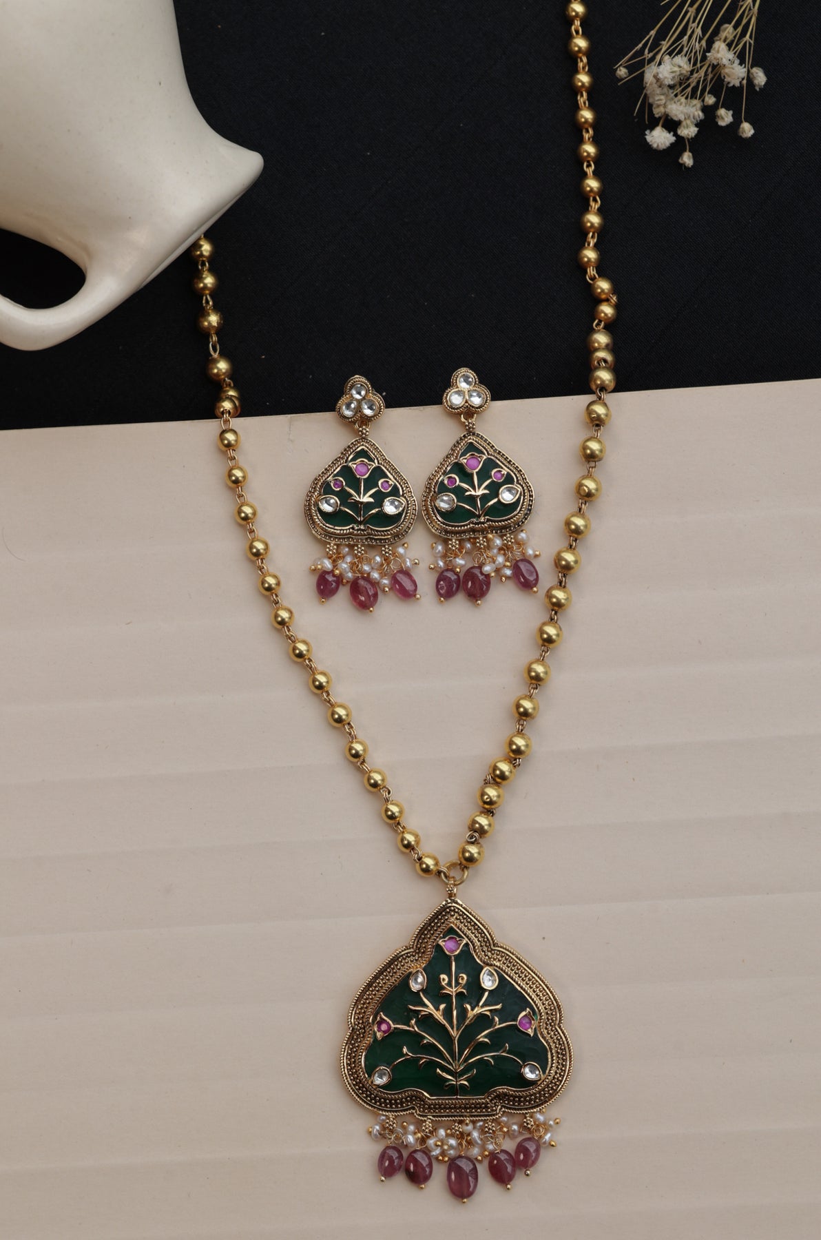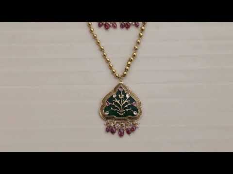 Enhance your traditional attire with this beautifully handcrafted necklace set made from fine silver. Featuring intricate Hauldali artwork, the striking green color imbues the piece with meaningful symbolism. Delicate clusters of freshwater pearls and ruby red beads create elegant movement, ideal for festive and cultural events. The necklace chain, crafted from fine silver beads with a radiant gold-tone finish, offers a classic and sophisticated appeal. This set is completed with matching earrings for a cohesive look.