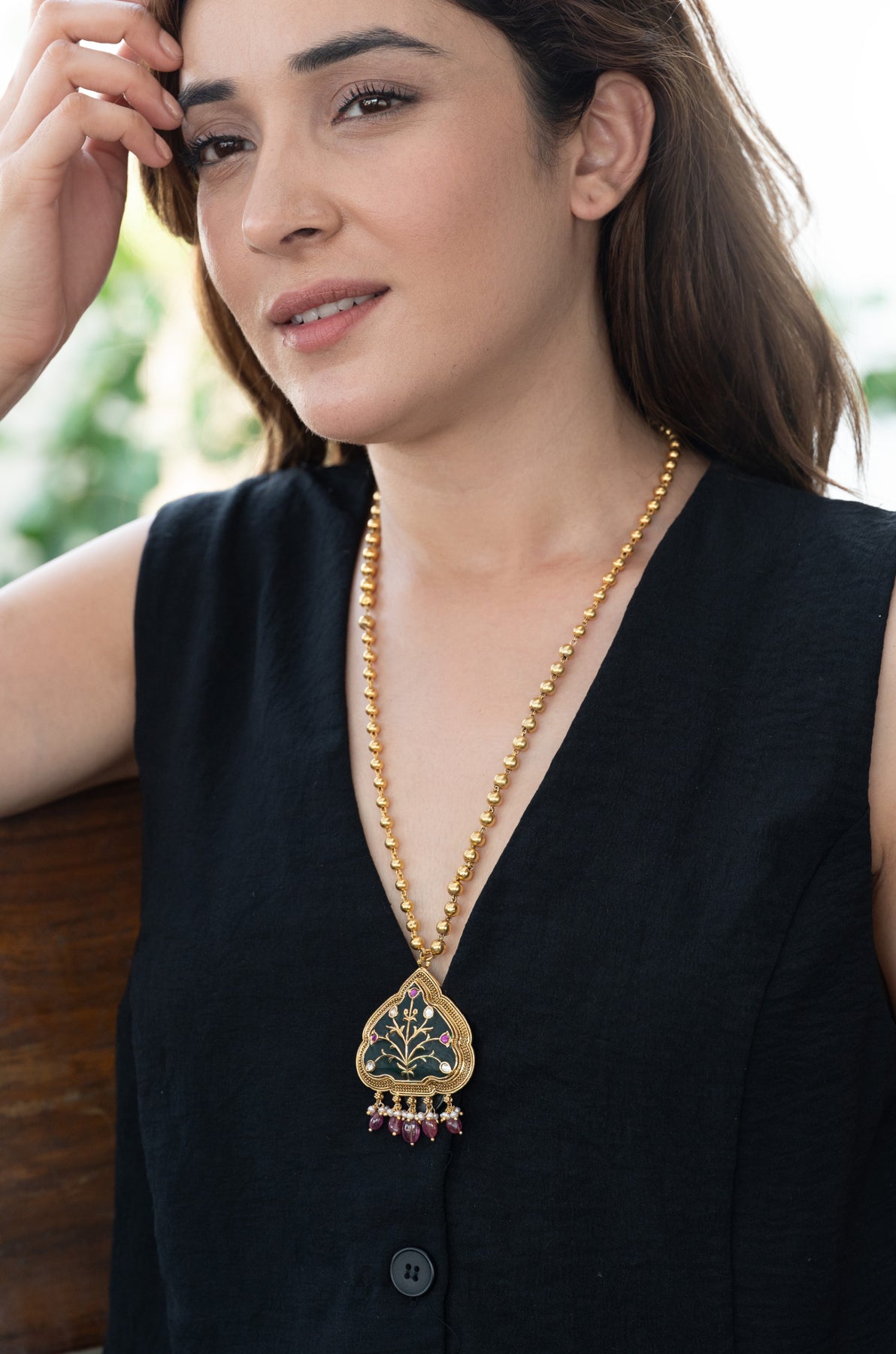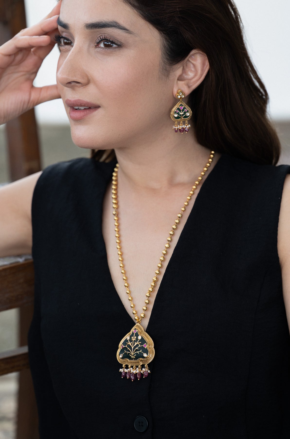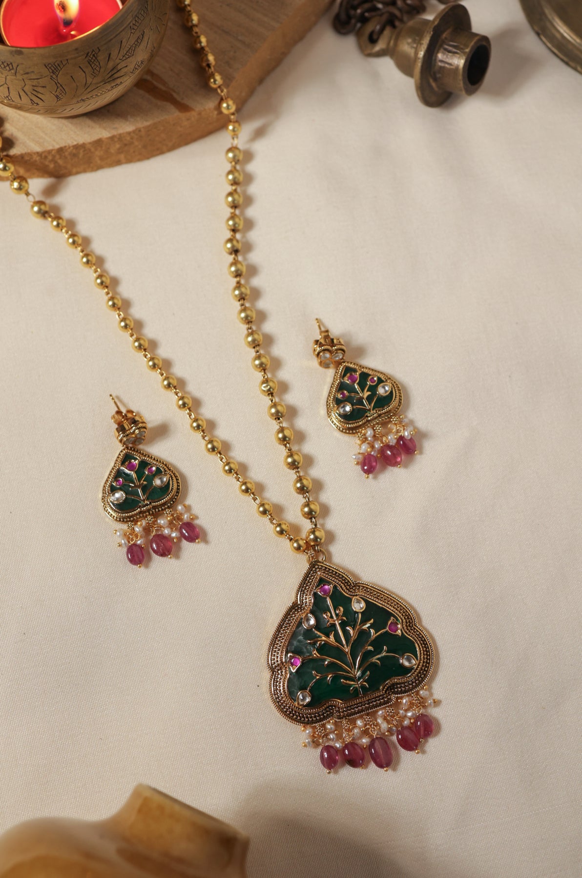 Enhance your traditional attire with this beautifully handcrafted necklace set made from fine silver. Featuring intricate Hauldali artwork, the striking green color imbues the piece with meaningful symbolism. Delicate clusters of freshwater pearls and ruby red beads create elegant movement, ideal for festive and cultural events. The necklace chain, crafted from fine silver beads with a radiant gold-tone finish, offers a classic and sophisticated appeal. This set is completed with matching earrings for a cohesive look.
