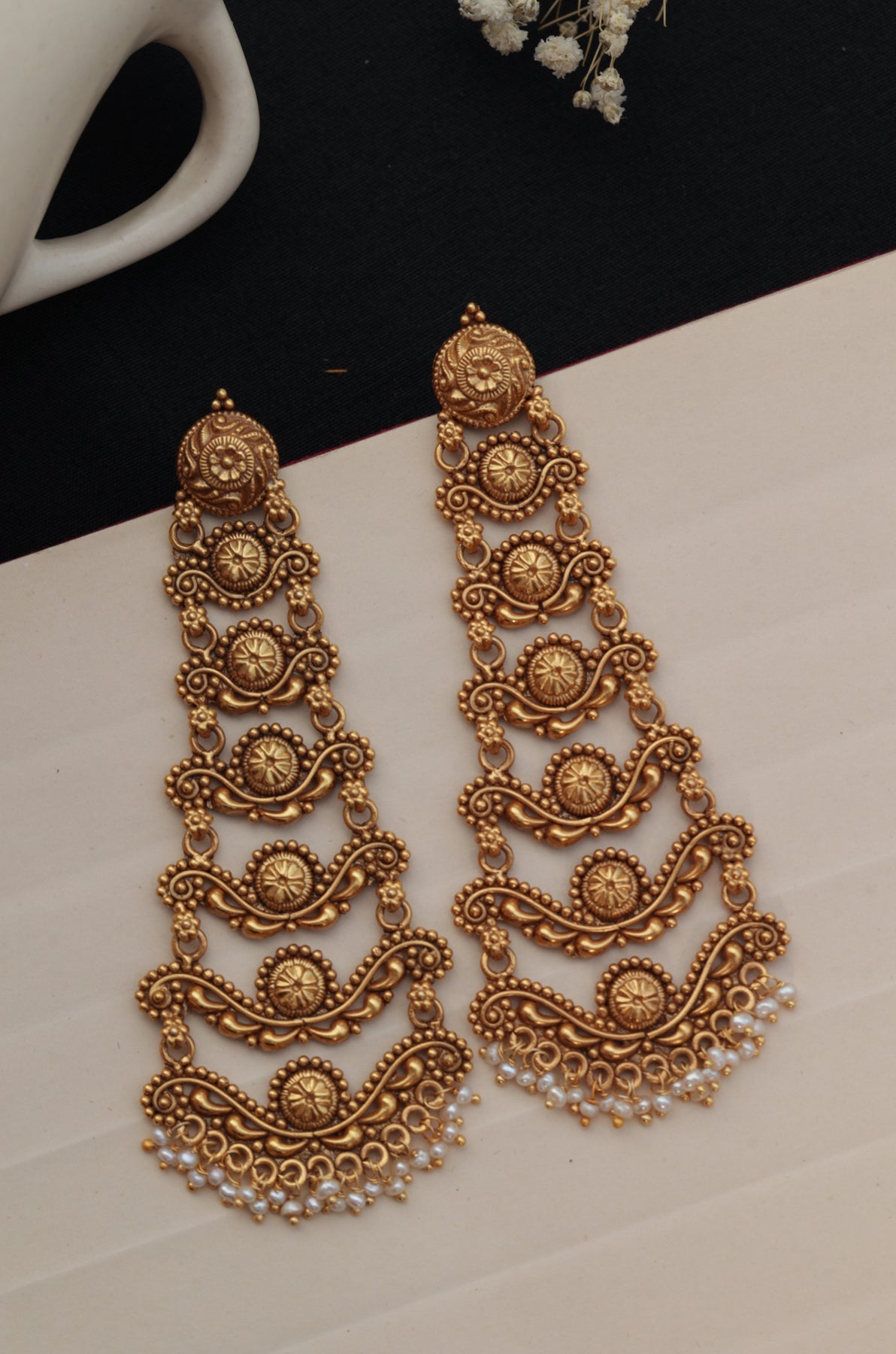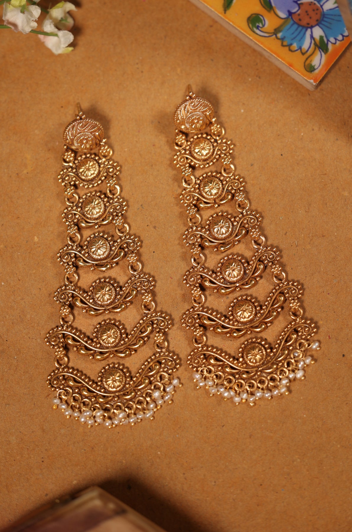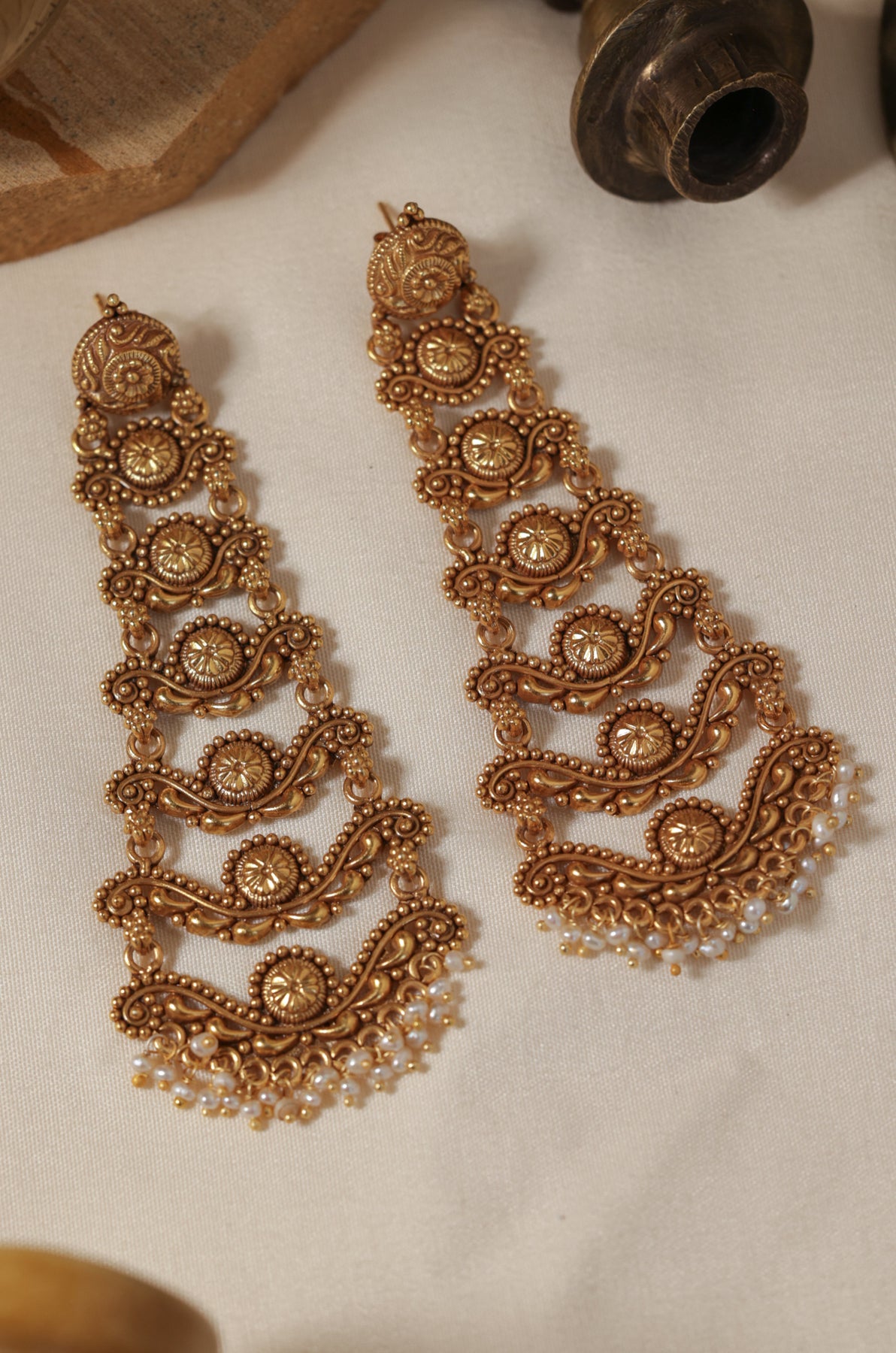 These stunning earrings are expertly fashioned from fine silver and finished with a luminous gold polish, reflecting the richness of traditional Indian artistry. Their intricate tiered design showcases detailed floral and ornamental motifs inspired by temple jewelry. The elegant cascading form tapers delicately, culminating in clusters of tiny pearl beads that lend a refined, graceful touch. Steeped in heritage and elegance, these earrings make a timeless statement, ideal for festive events and cultural ceremonies, combining majestic craftsmanship with lasting sophistication.