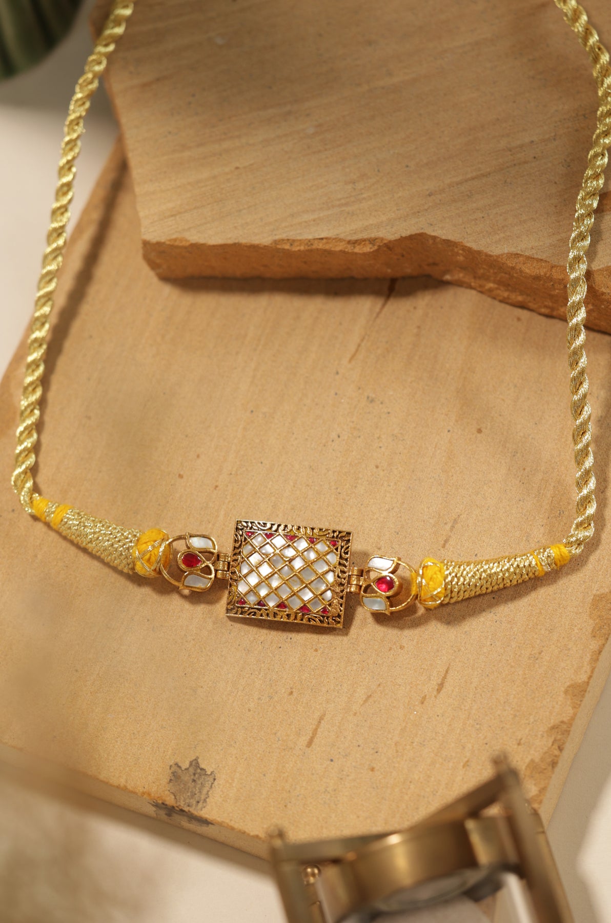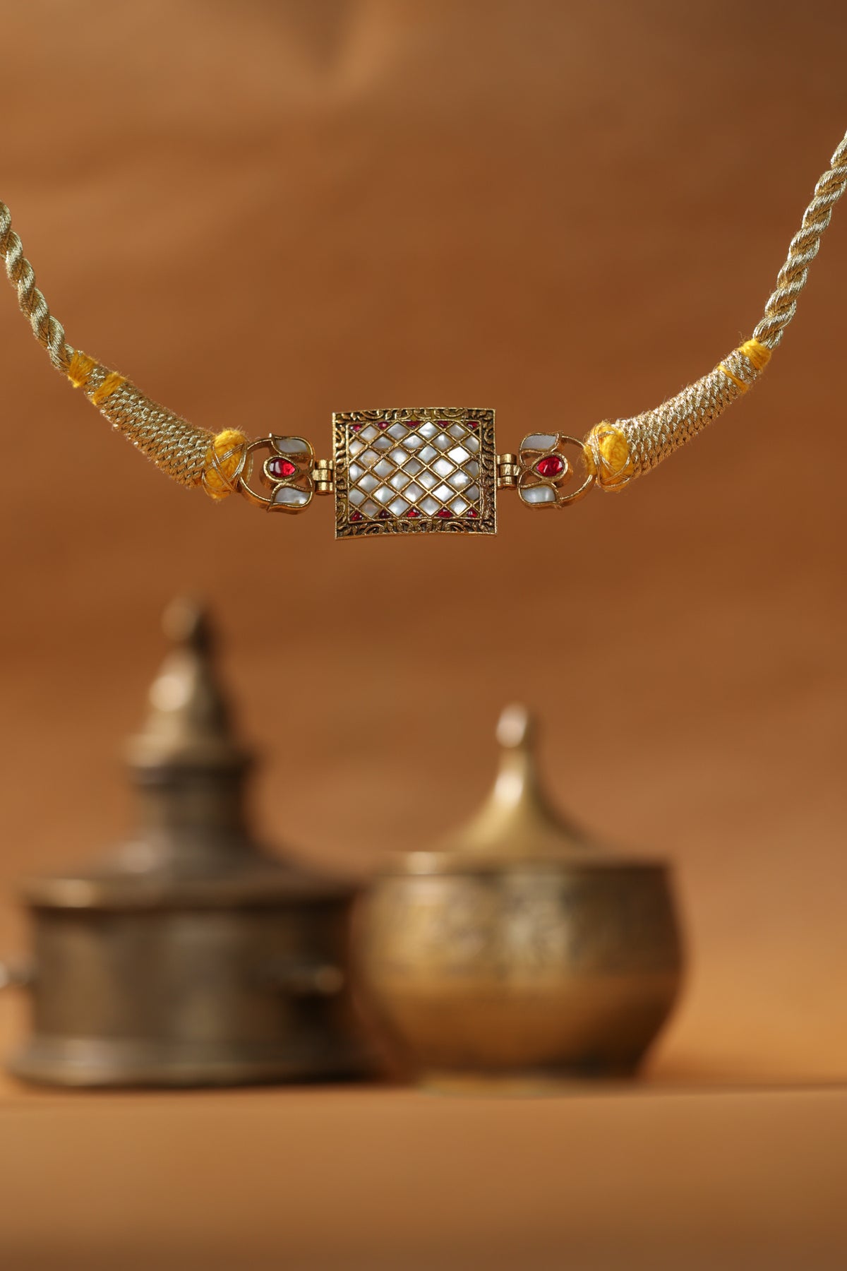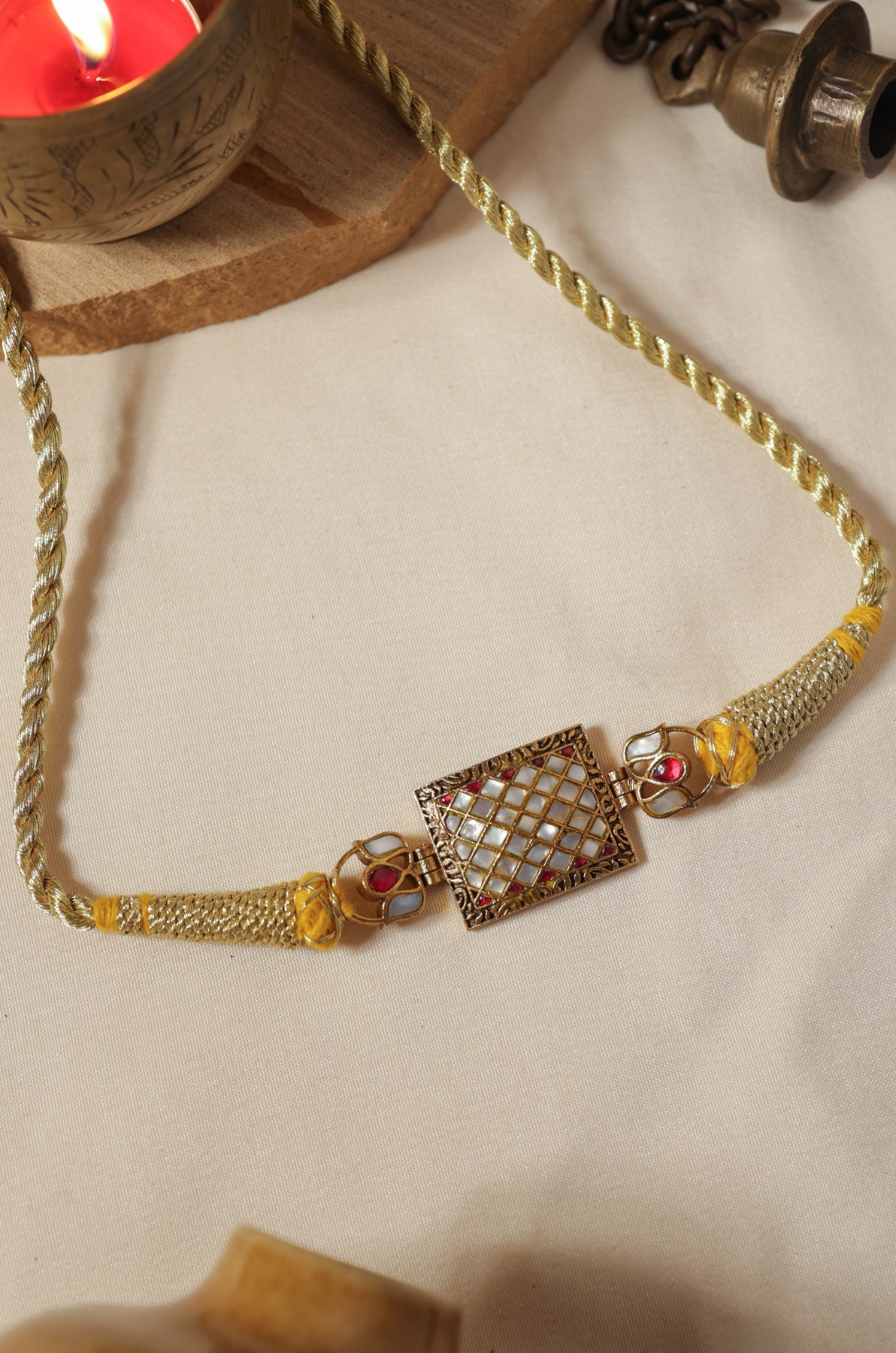 Meticulously crafted from fine silver and accented with antique gold hues, this necklace features a striking square pendant inspired by jharokha jaalis, adorned with a delicate mother of pearl grid. Enhanced by red and white meenakari floral caps, it is elegantly finished with a silk-thread braided dori, offering a refined and graceful fit.