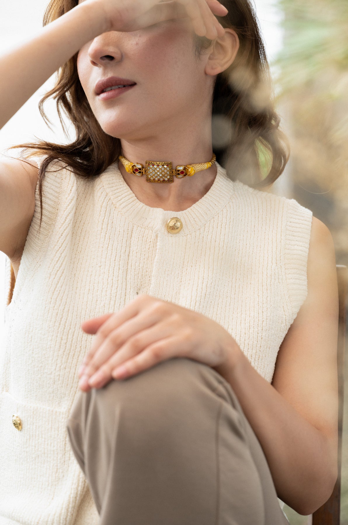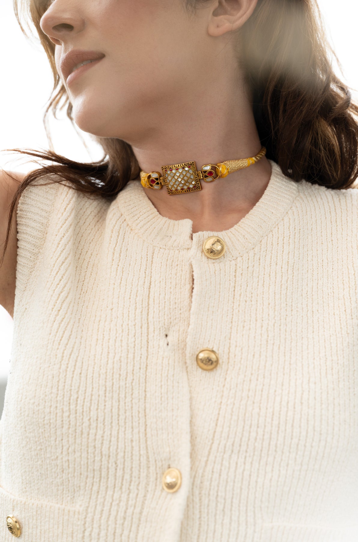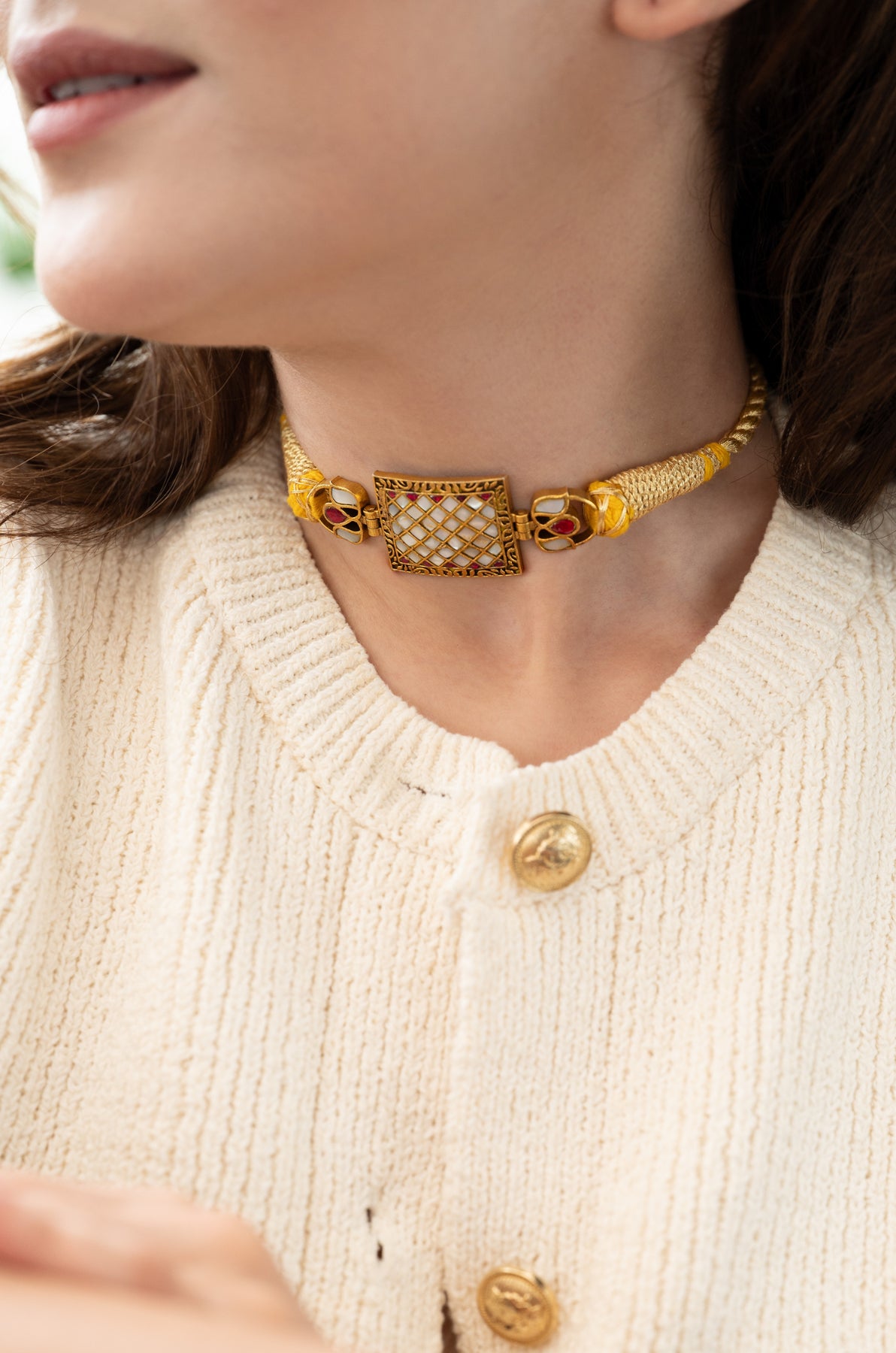 Meticulously crafted from fine silver and accented with antique gold hues, this necklace features a striking square pendant inspired by jharokha jaalis, adorned with a delicate mother of pearl grid. Enhanced by red and white meenakari floral caps, it is elegantly finished with a silk-thread braided dori, offering a refined and graceful fit.