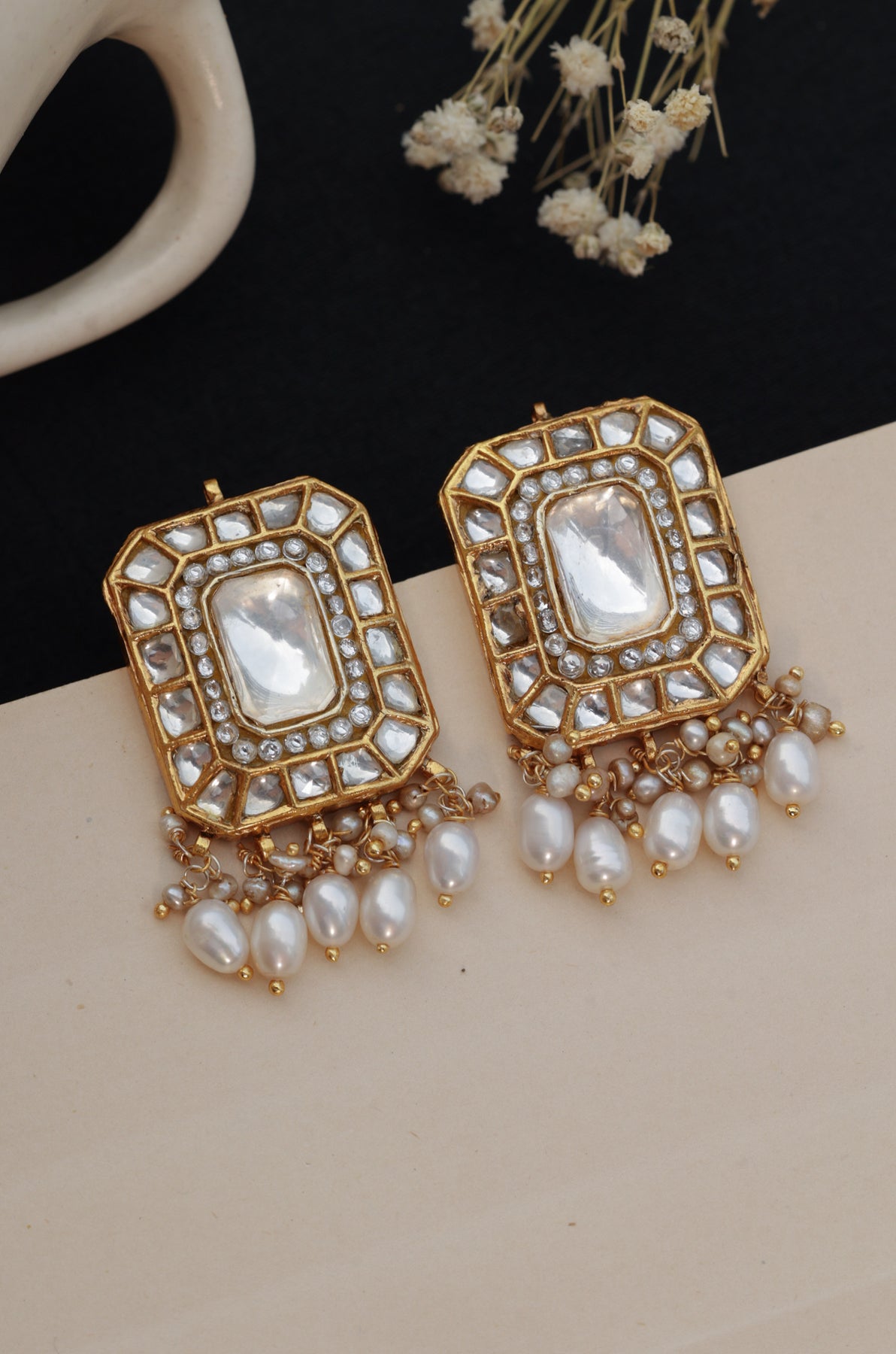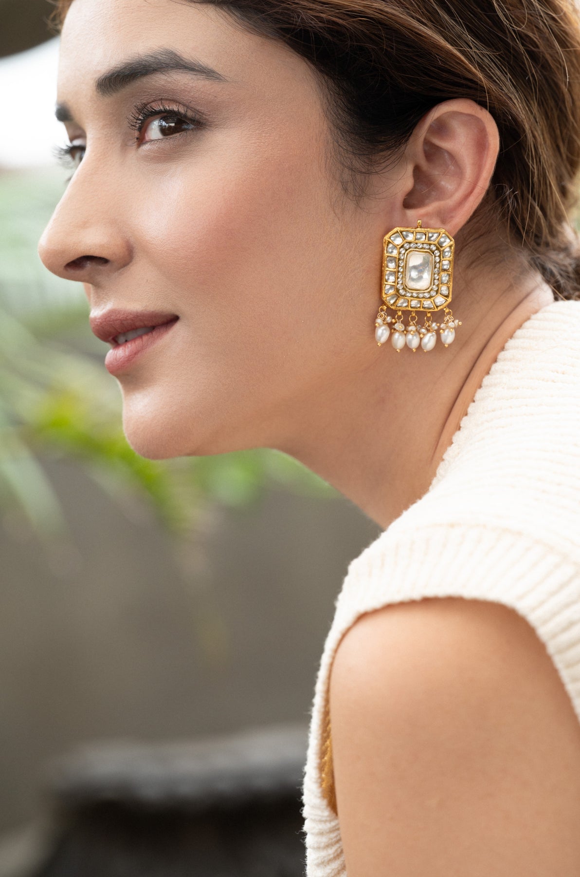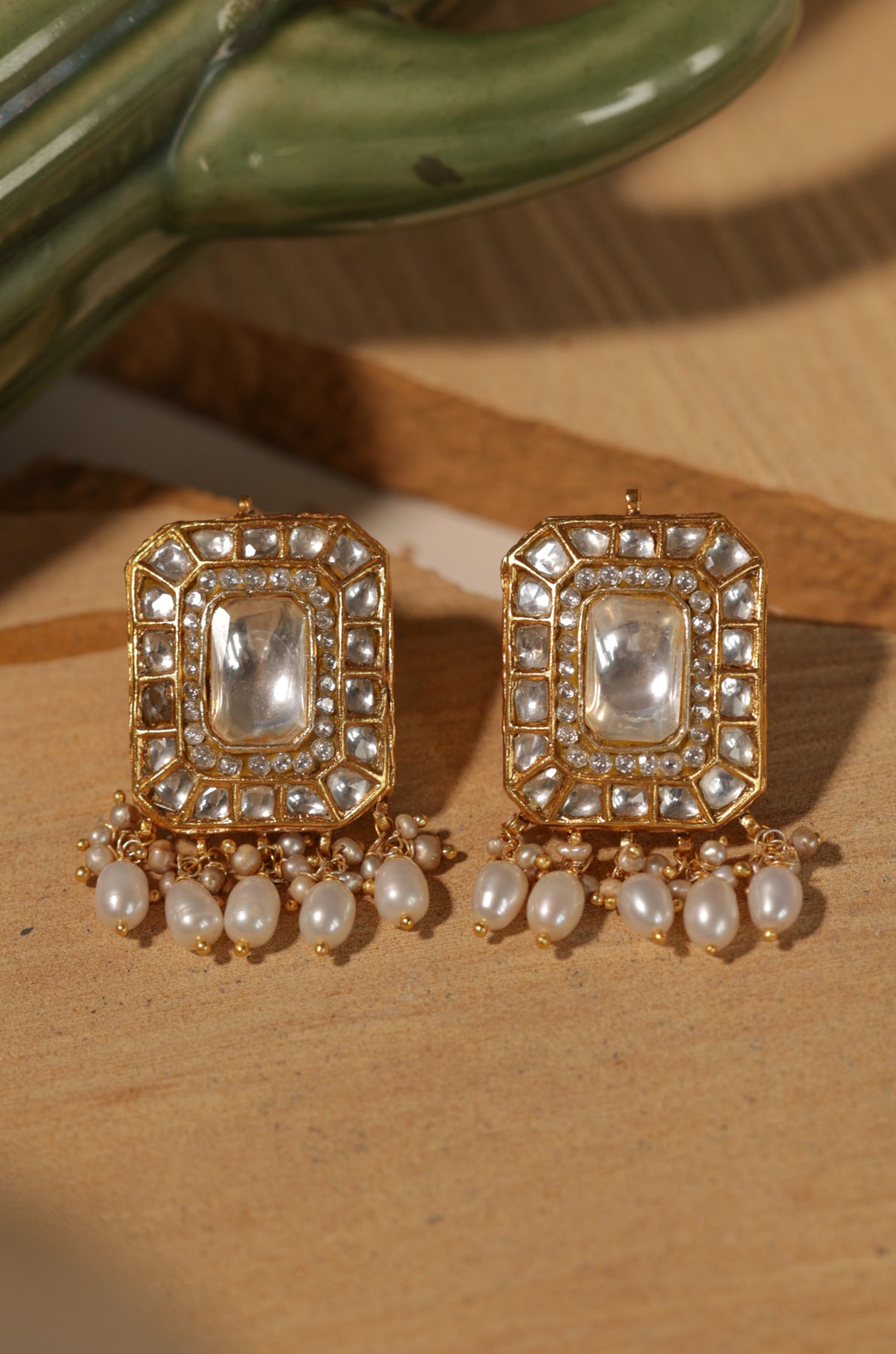 Elevate your jewelry collection with these exquisite rectangular earrings, meticulously crafted from fine silver. Drawing inspiration from classic Kundan artistry, they showcase a prominent central stone surrounded by a geometric pattern of sparkling kundan, all set on a radiant gold-plated base. Accented with clusters of delicate freshwater pearls and fine gold-toned beads, these earrings offer graceful movement and refined elegance. Perfectly suited for festive celebrations, weddings, or formal events, they bring a sophisticated and timeless charm to any ensemble.