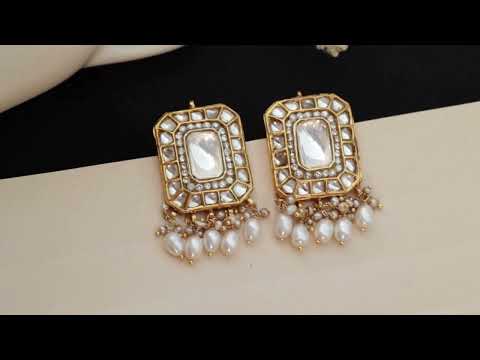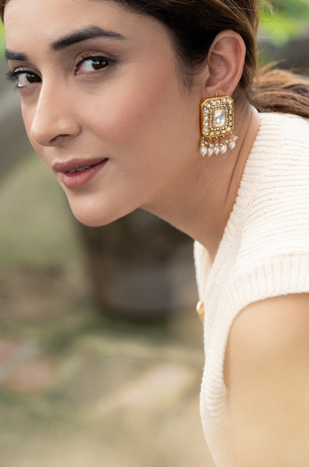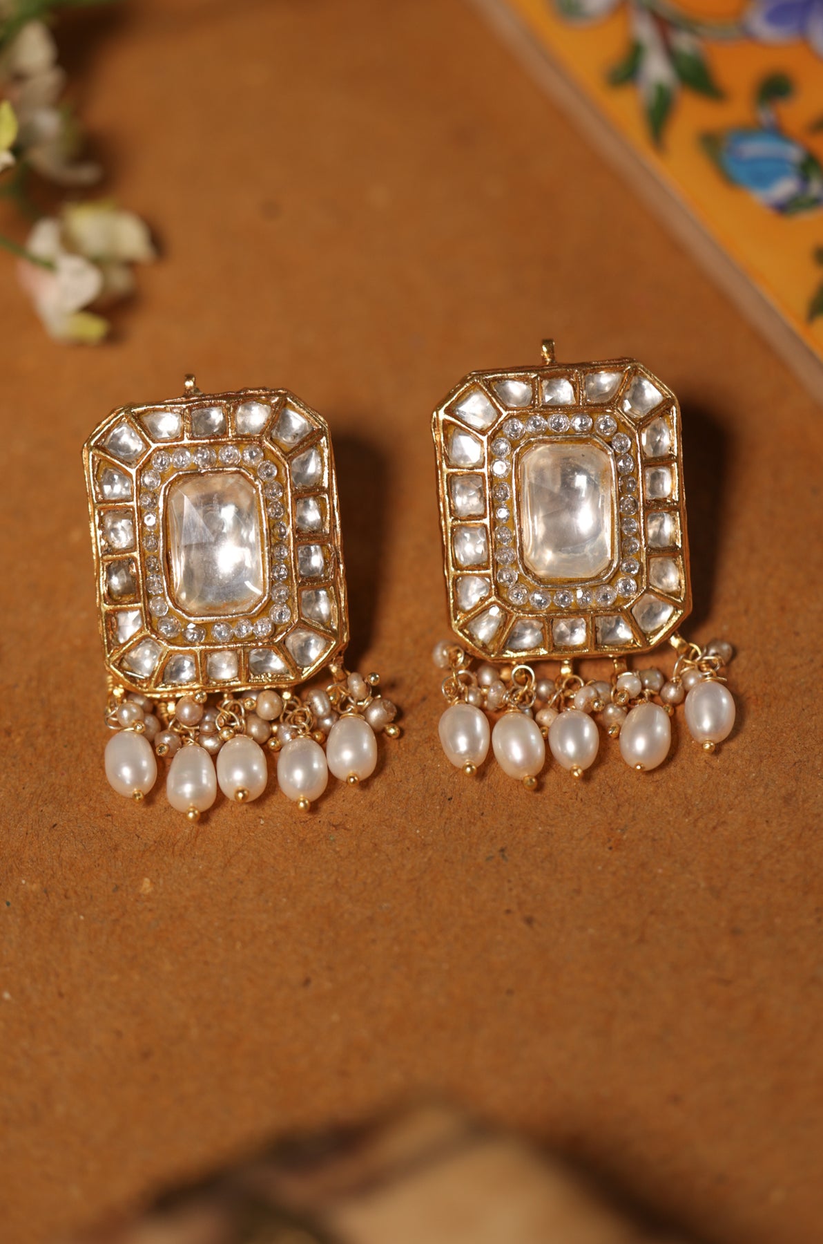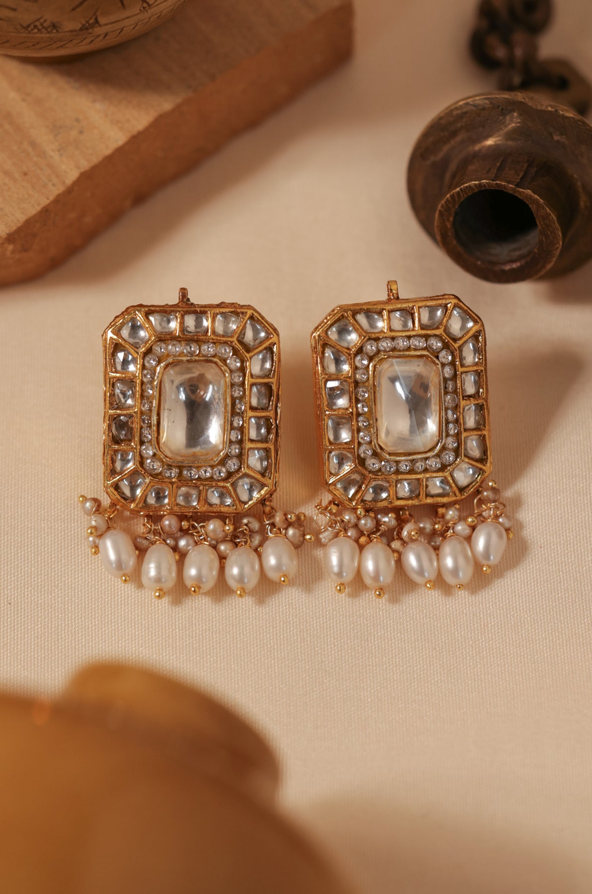 Elevate your jewelry collection with these exquisite rectangular earrings, meticulously crafted from fine silver. Drawing inspiration from classic Kundan artistry, they showcase a prominent central stone surrounded by a geometric pattern of sparkling kundan, all set on a radiant gold-plated base. Accented with clusters of delicate freshwater pearls and fine gold-toned beads, these earrings offer graceful movement and refined elegance. Perfectly suited for festive celebrations, weddings, or formal events, they bring a sophisticated and timeless charm to any ensemble.