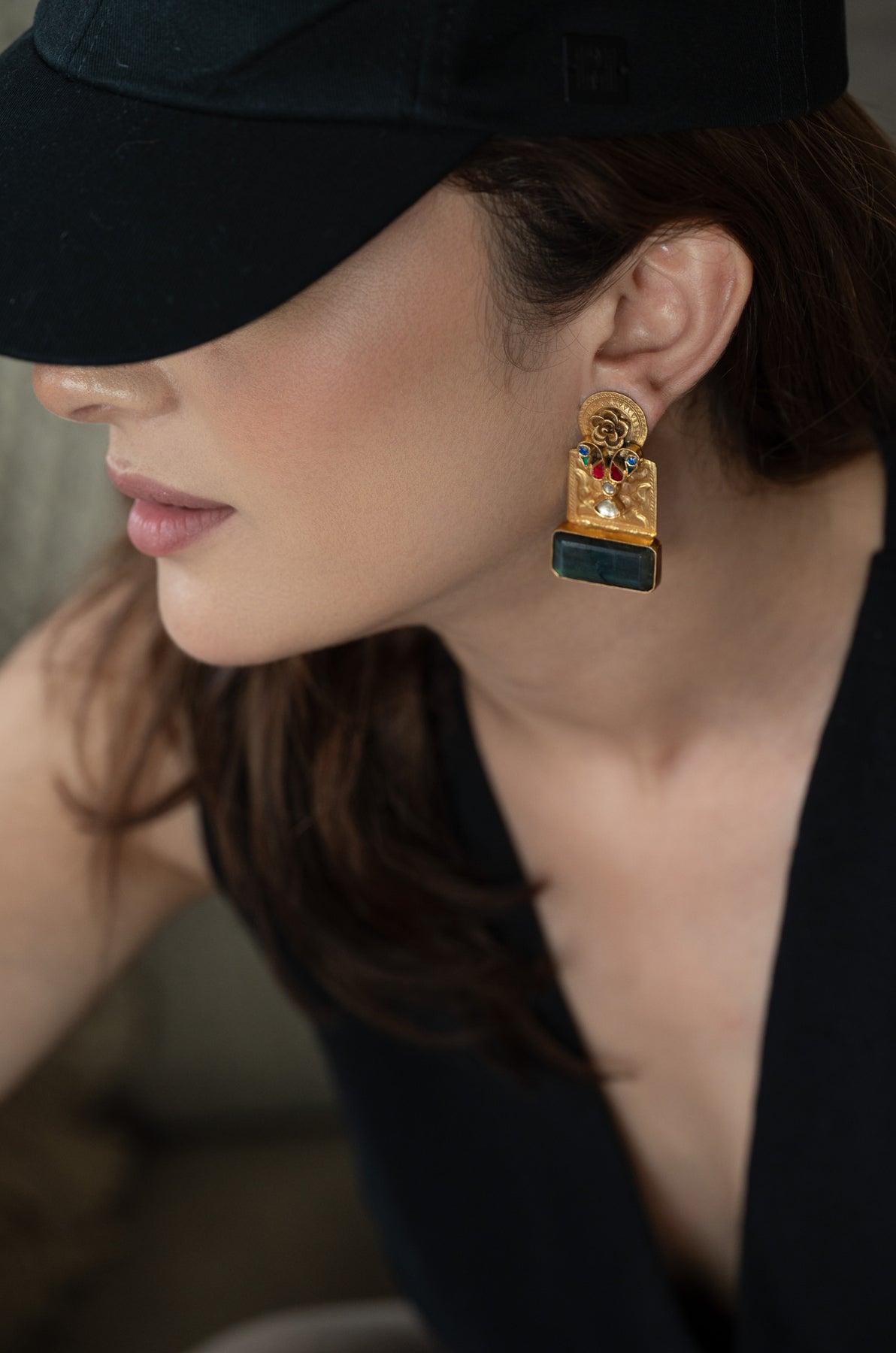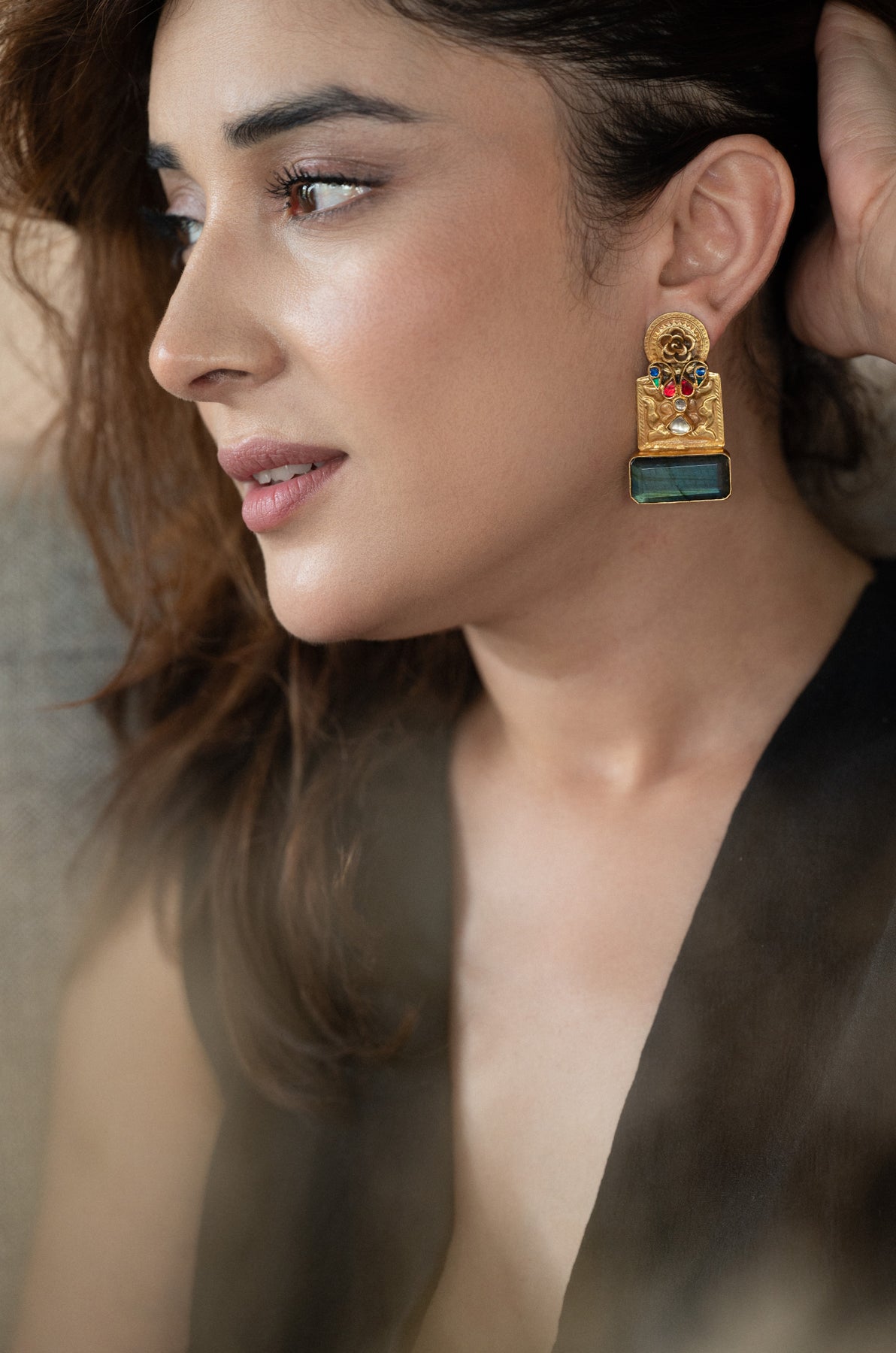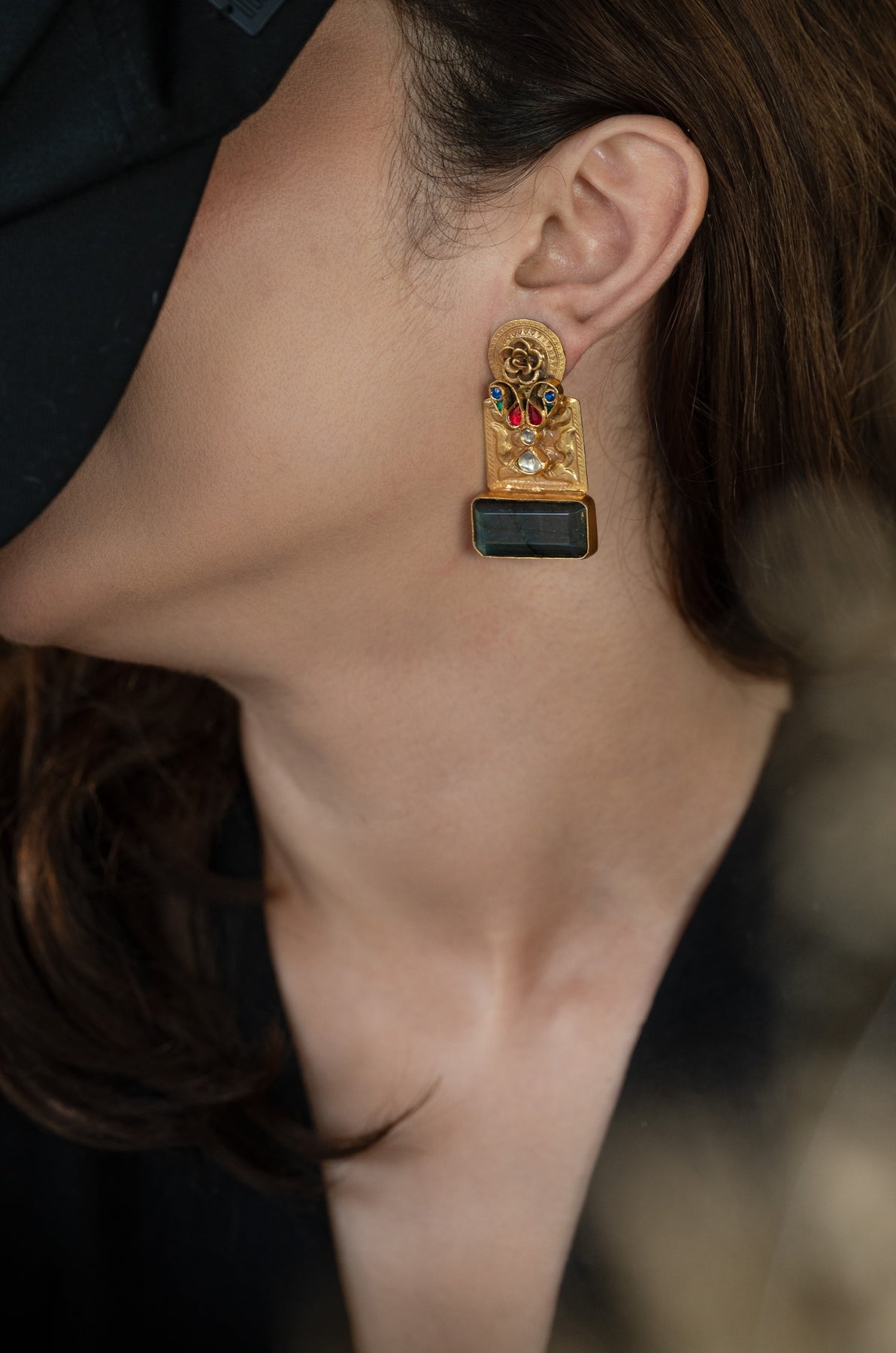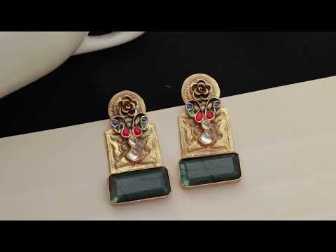 Introducing the nagma earrings, a striking blend of tradition, craftsmanship, and bold elegance. Crafted in fine silver, they showcase intricate hand-etched patterns, a blossoming floral crown, and vibrant meenakari droplets adding a touch of color. Anchoring the design is a captivating deep green carved stone, rich and mesmerizing, completing this statement piece with timeless allure.