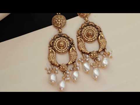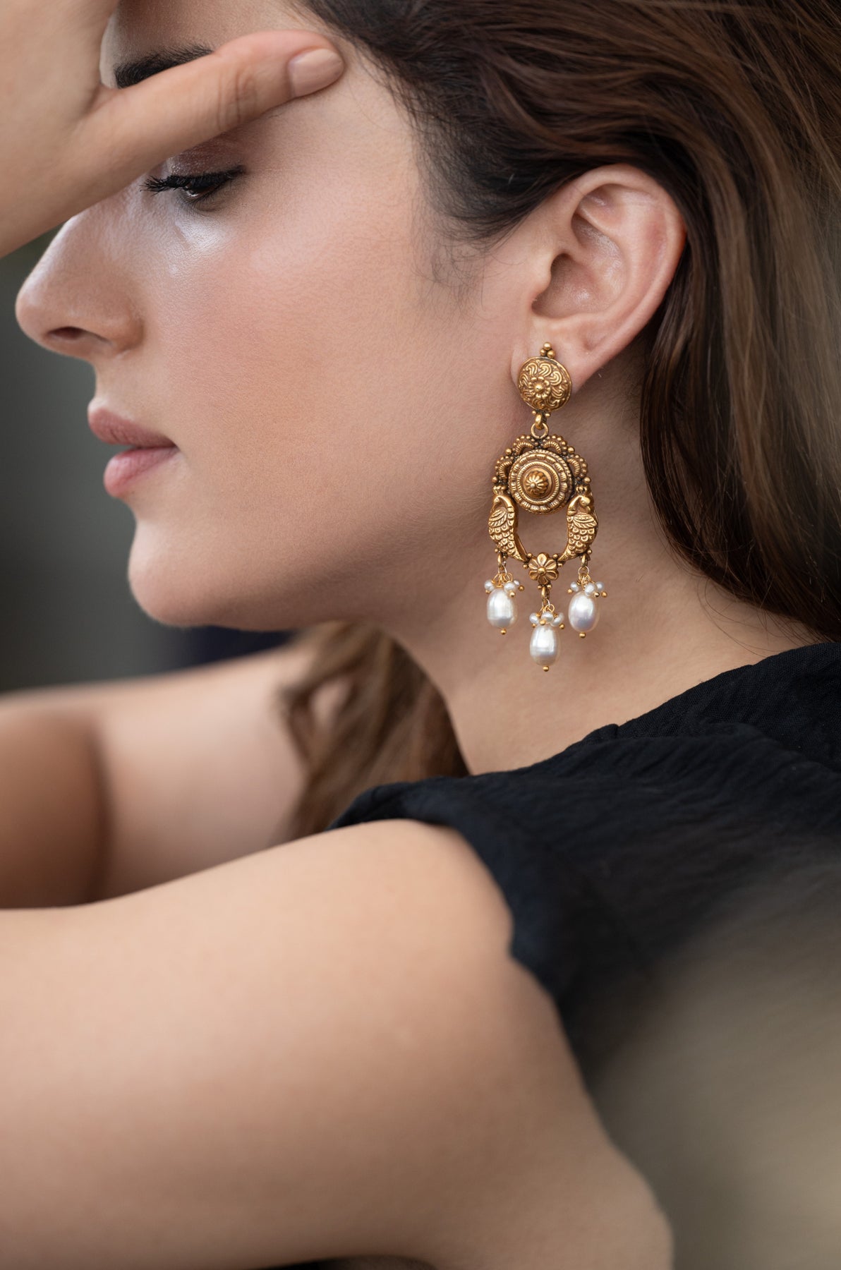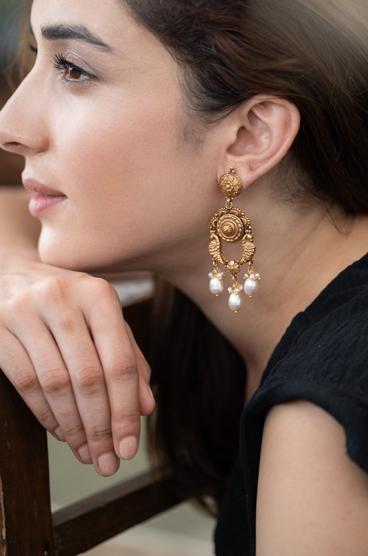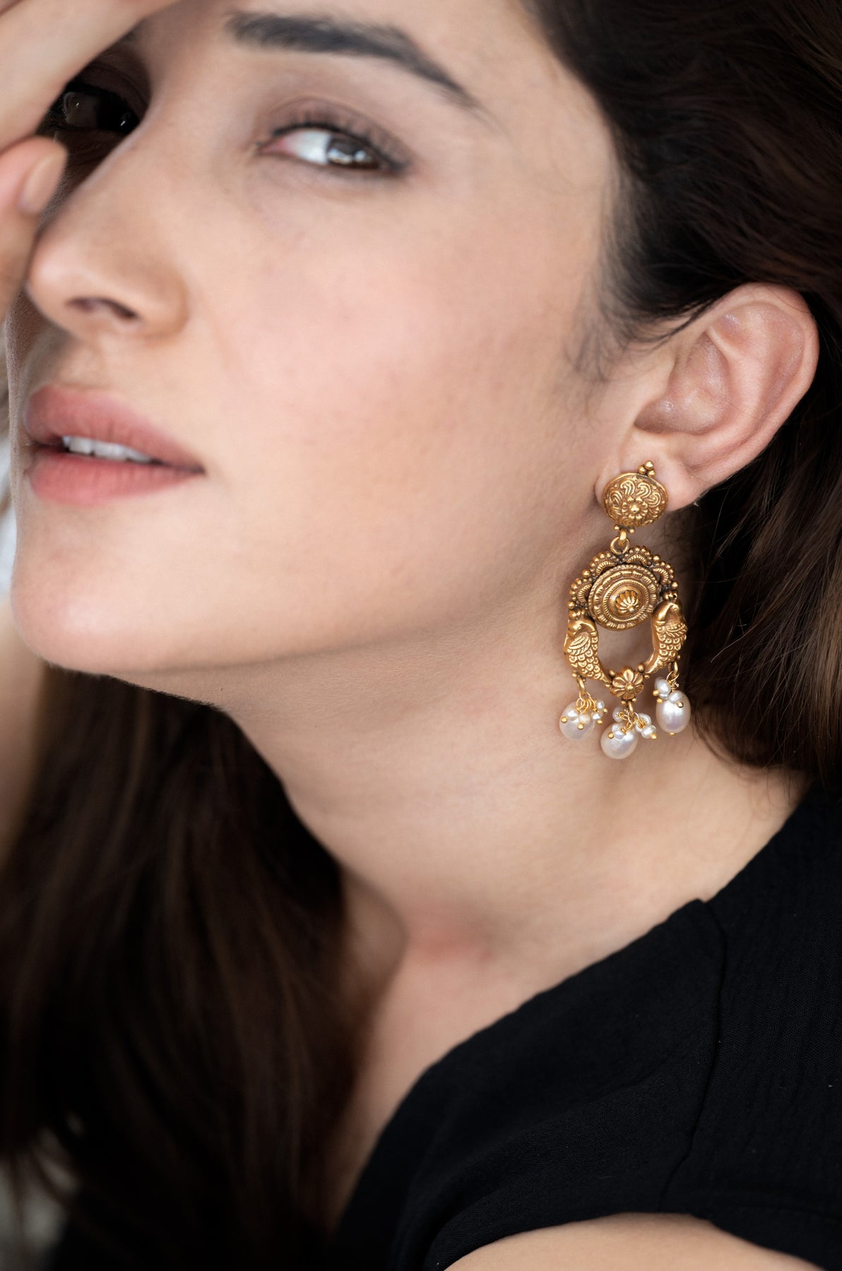 Imagine earrings that have drifted straight from a royal fairy tale. Crafted in fine silver with an antique gold finish, they feature twin fish motifs nestled within a floral medallion. Gentle pearl drops shimmer and sway like moonlight dancing on still waters. Beautifully intricate yet delightfully bold, these earrings are made for twirls, secret glances, and all the enchanting moments in between.