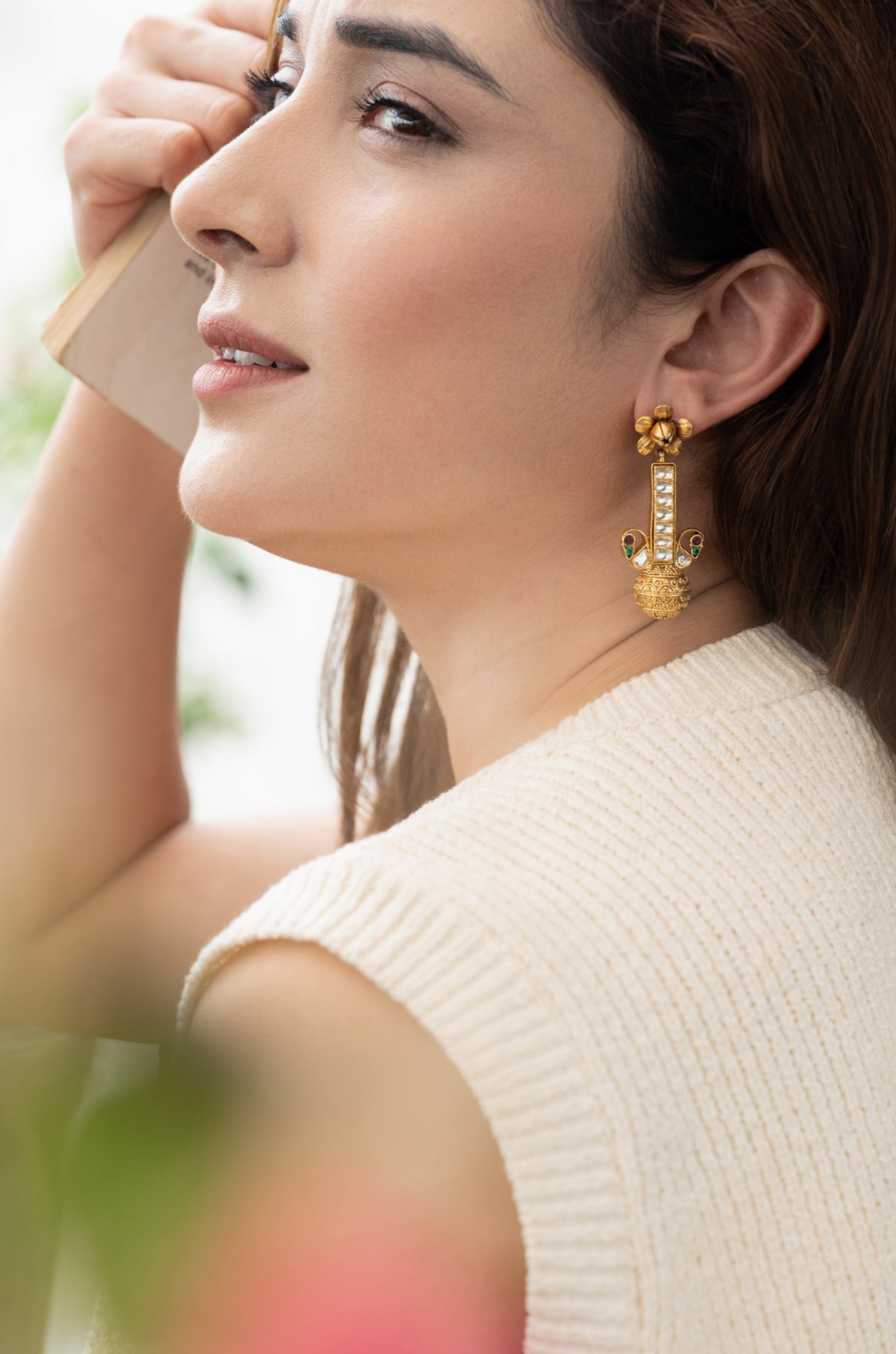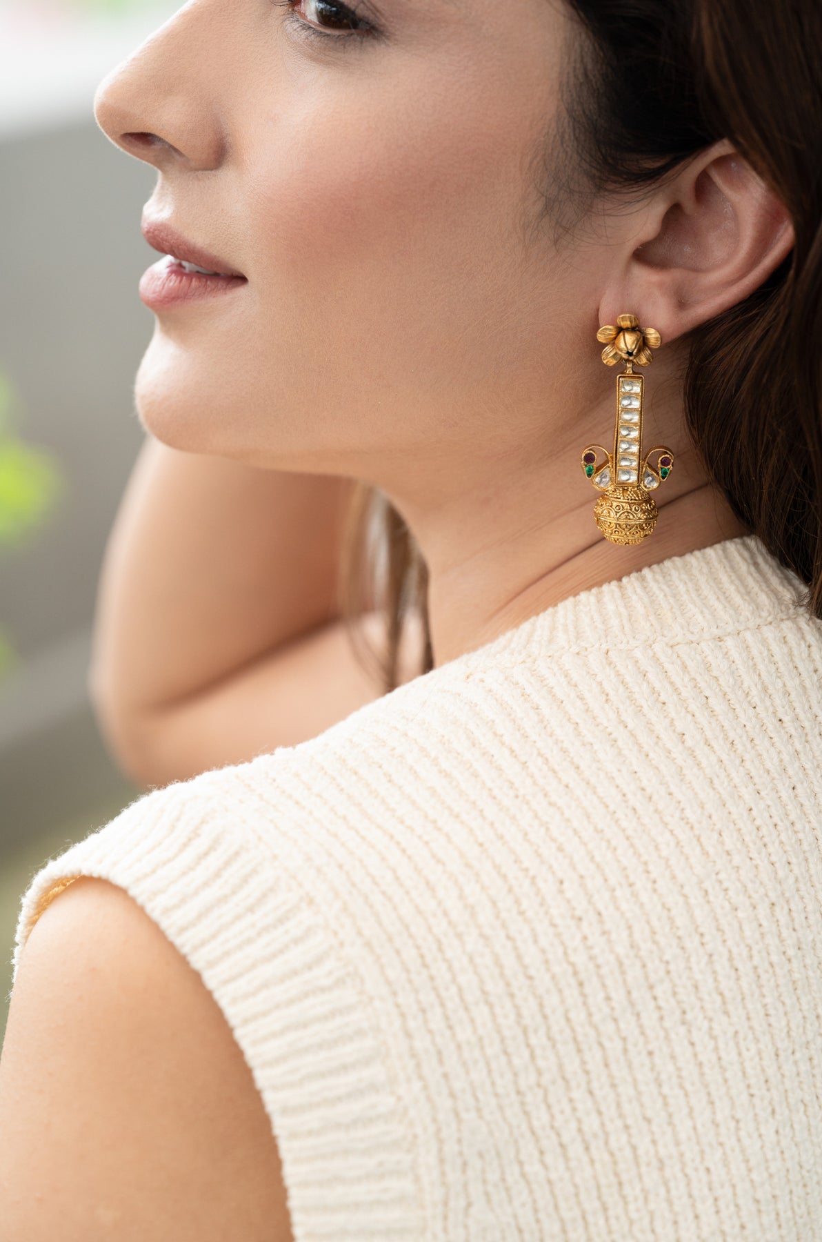 The Rasika earrings pay homage to temple artistry and regal heirlooms. Crafted from fine silver with a rich antique gold finish, these danglers showcase a delicate floral stud that draws attention to a vertical line of sparkling kundan polkis. The highlight lies in the peacock-inspired side curls adorned with vibrant ruby and emerald enamel, all culminating in an intricately carved spherical drop.