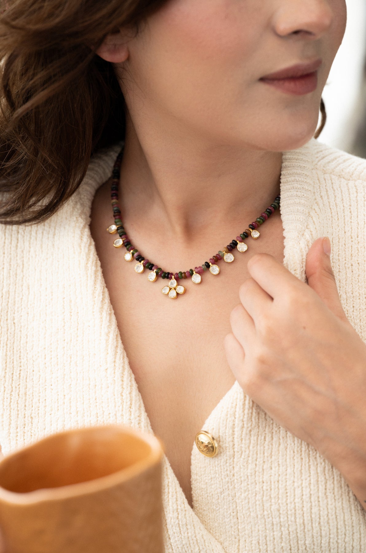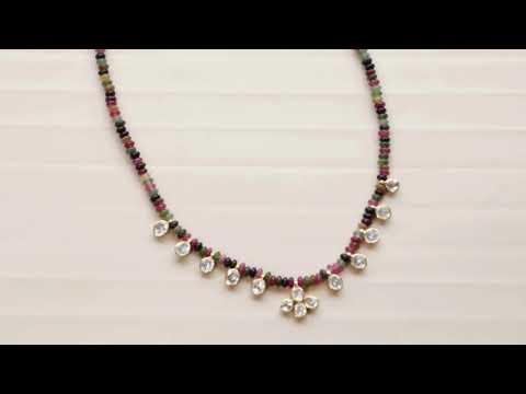 This handcrafted silver necklace features multicolored gemstone beads arranged in a smooth gradient of green, pink, and burgundy. It is accented with shimmering moissanite polki stones and a floral centerpiece of five radiant stones. The gold-toned adjustable clasp ensures comfort and versatility, making it suitable for both festive occasions and daily wear.