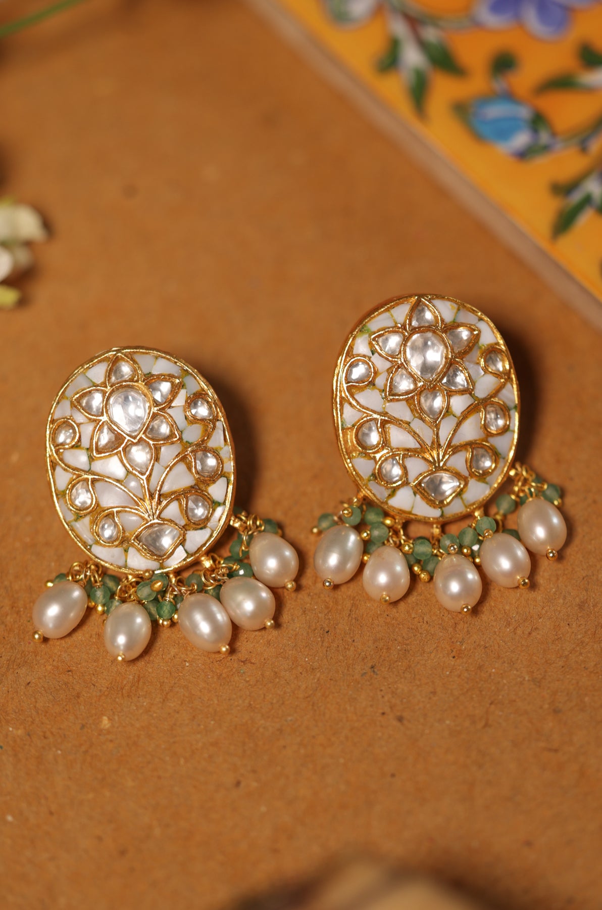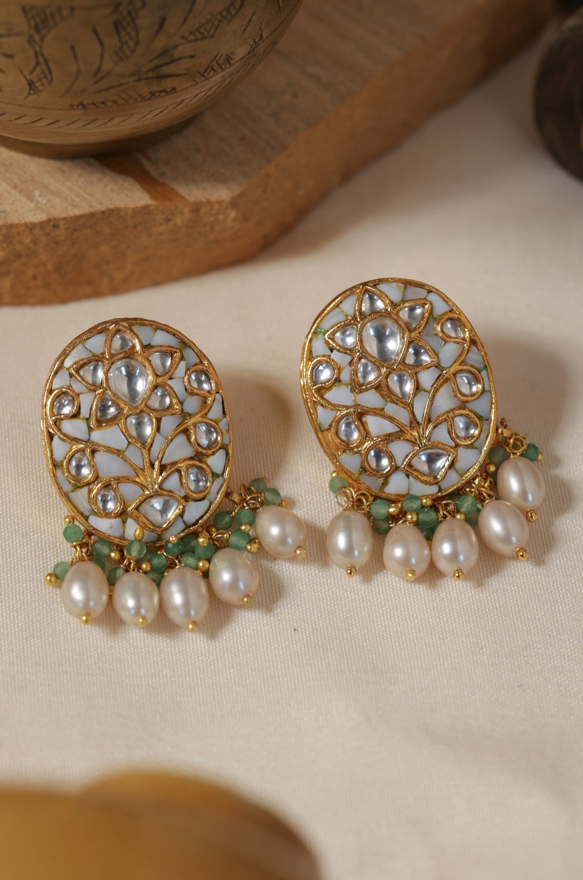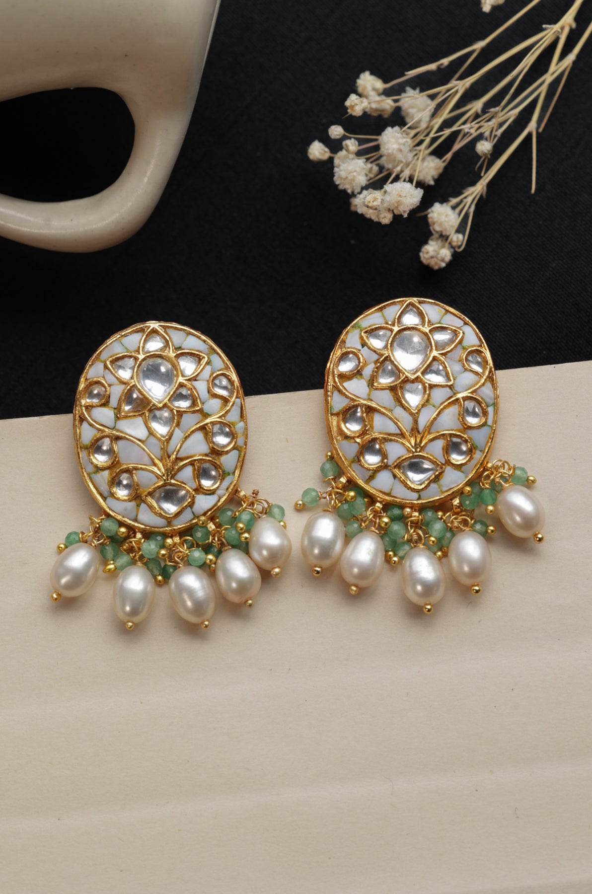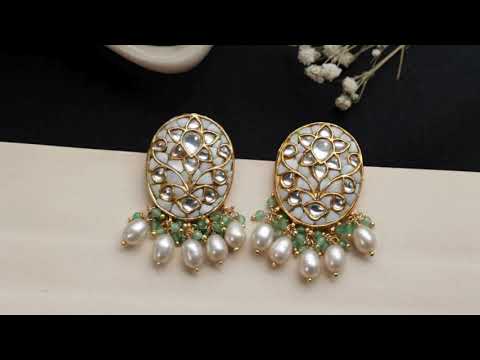 Meticulously crafted from fine silver, the Shubhra Studs feature immaculate white meenakari, shimmering kundan accents, and gentle pearl drops that move with graceful elegance. The oval-shaped studs present a refined canvas adorned with hand-set kundan floral patterns, delicately bordered in gold. Beneath, a charming arrangement of green stone clusters and dewdrop pearls adds a subtle yet sophisticated royal allure.