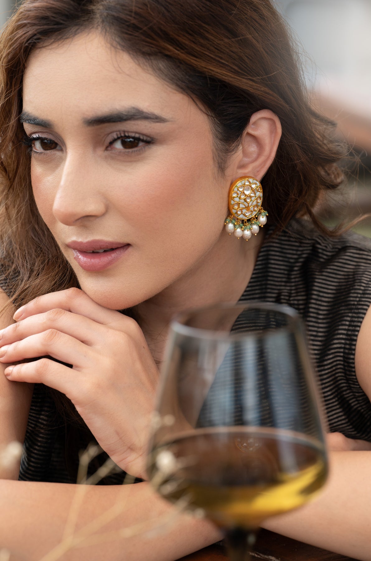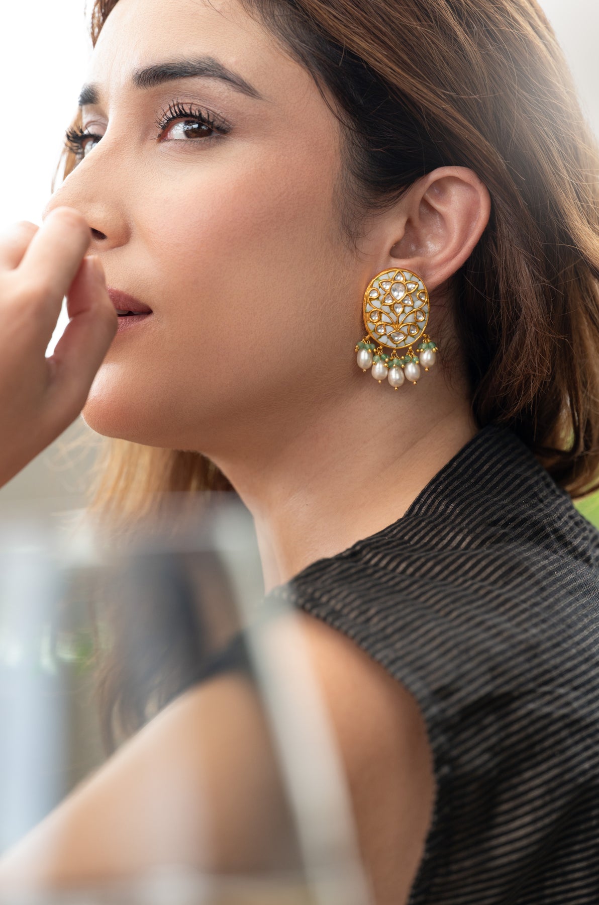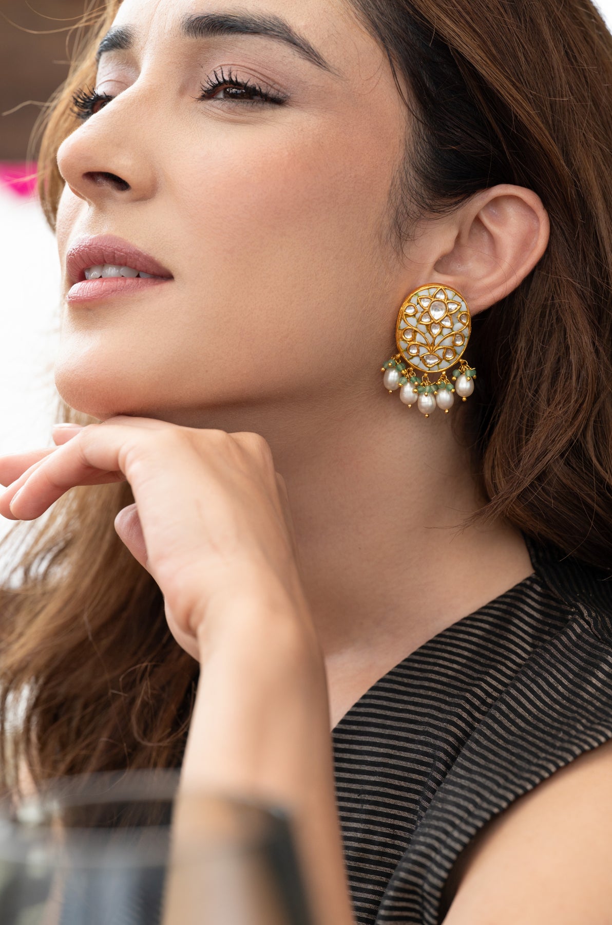 Meticulously crafted from fine silver, the Shubhra Studs feature immaculate white meenakari, shimmering kundan accents, and gentle pearl drops that move with graceful elegance. The oval-shaped studs present a refined canvas adorned with hand-set kundan floral patterns, delicately bordered in gold. Beneath, a charming arrangement of green stone clusters and dewdrop pearls adds a subtle yet sophisticated royal allure.