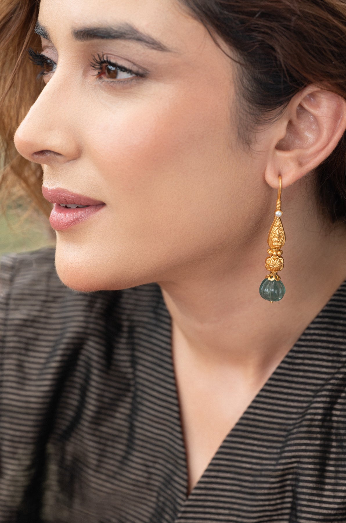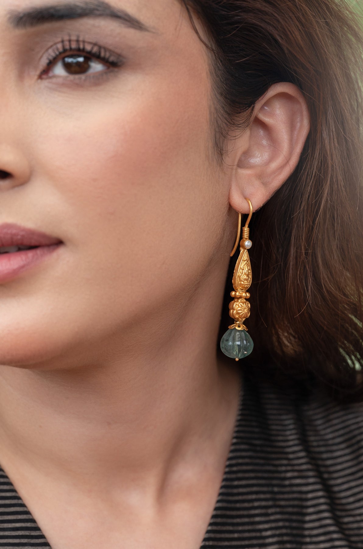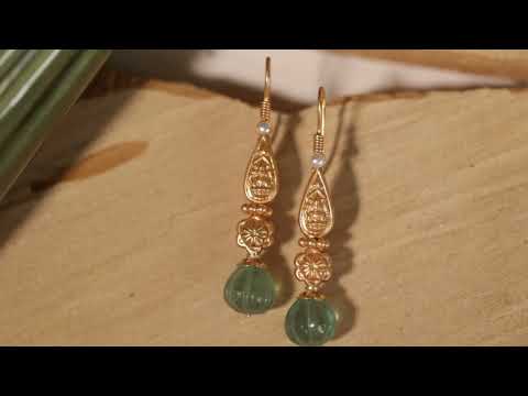 These Subha earrings showcase exquisite traditional craftsmanship inspired by temple art. Featuring delicate fluorite drops, they blend cultural heritage with natural elegance. Perfect for those who appreciate refined artistry and timeless design.