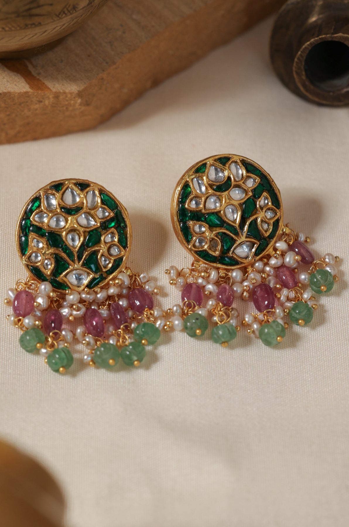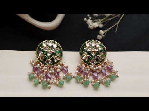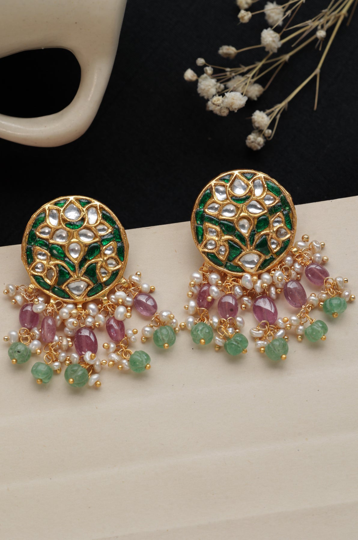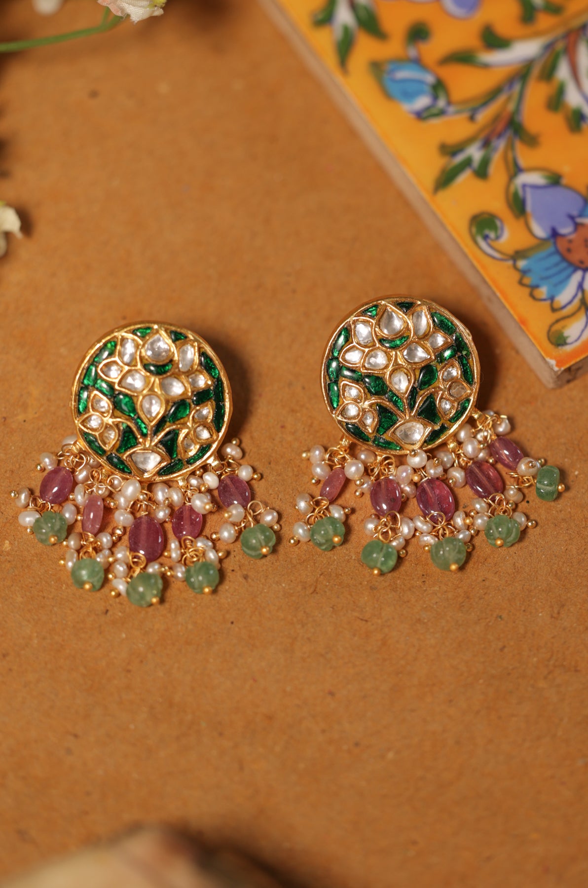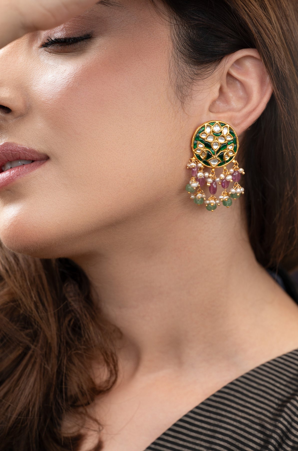 Delightfully whimsical and elegantly delicate, the Vanya studs are crafted from fine silver to capture timeless charm. These round earrings feature intricate hand-enameled green meena and radiant kundan arranged like a blossoming spring garden. From their base hangs a lively fringe of freshwater pearls, amethyst beads, and mint green drops that gently sway with every movement, adding a graceful touch to your ensemble.