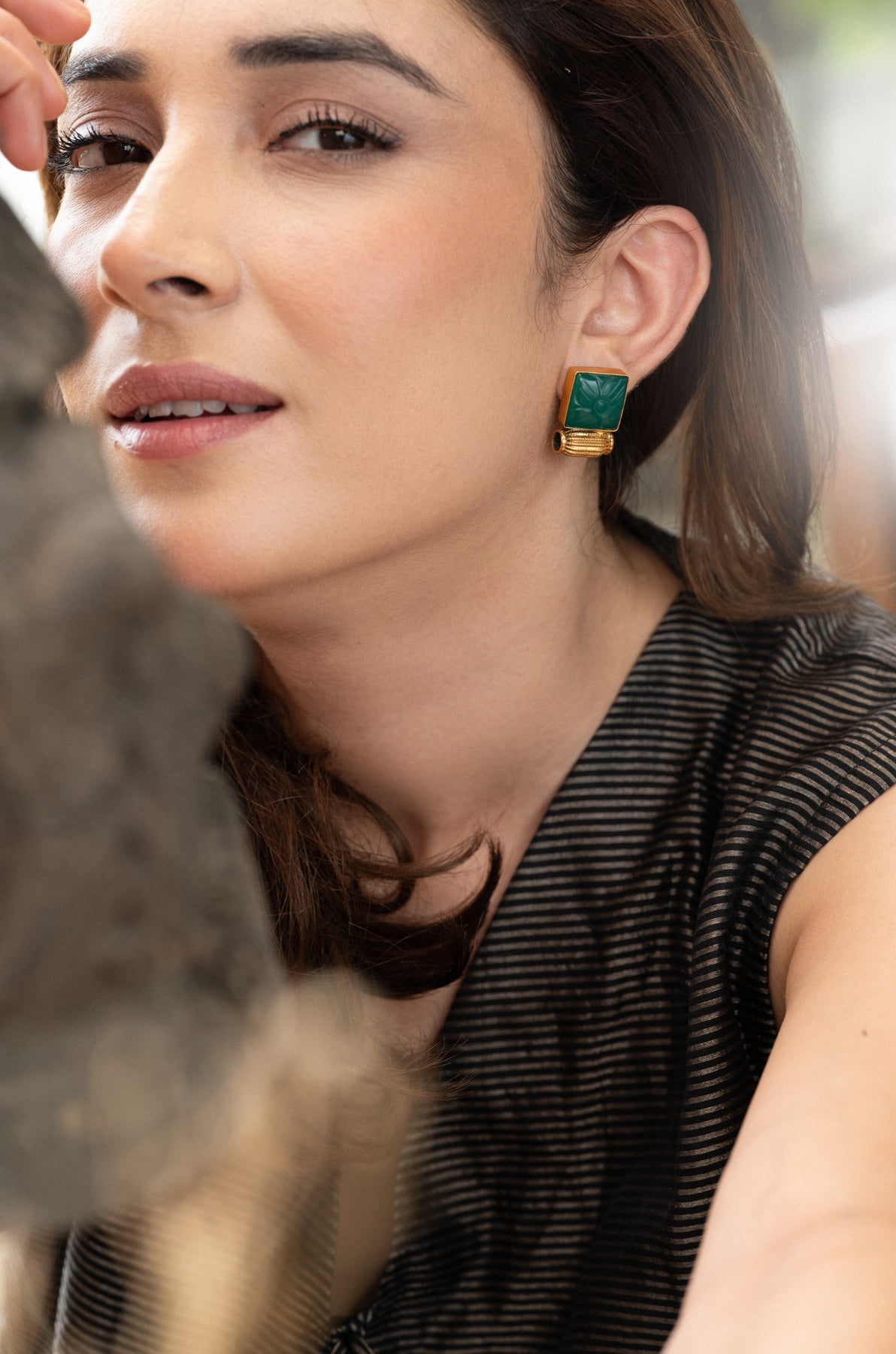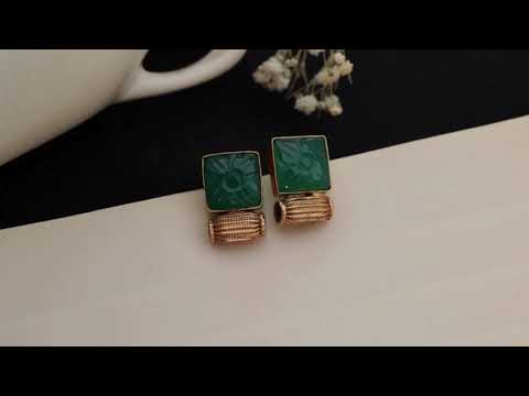 These sophisticated earrings combine expert craftsmanship with timeless elegance. Each piece is handcrafted, showcasing a square-cut green stone intricately engraved with a floral design that represents grace and renewal. The stone is set within a polished gold-plated bezel, positioned above a textured cylindrical base that introduces a refined architectural element. Offering a vibrant splash of color and distinctive form, these studs seamlessly complement both traditional and contemporary wardrobes.