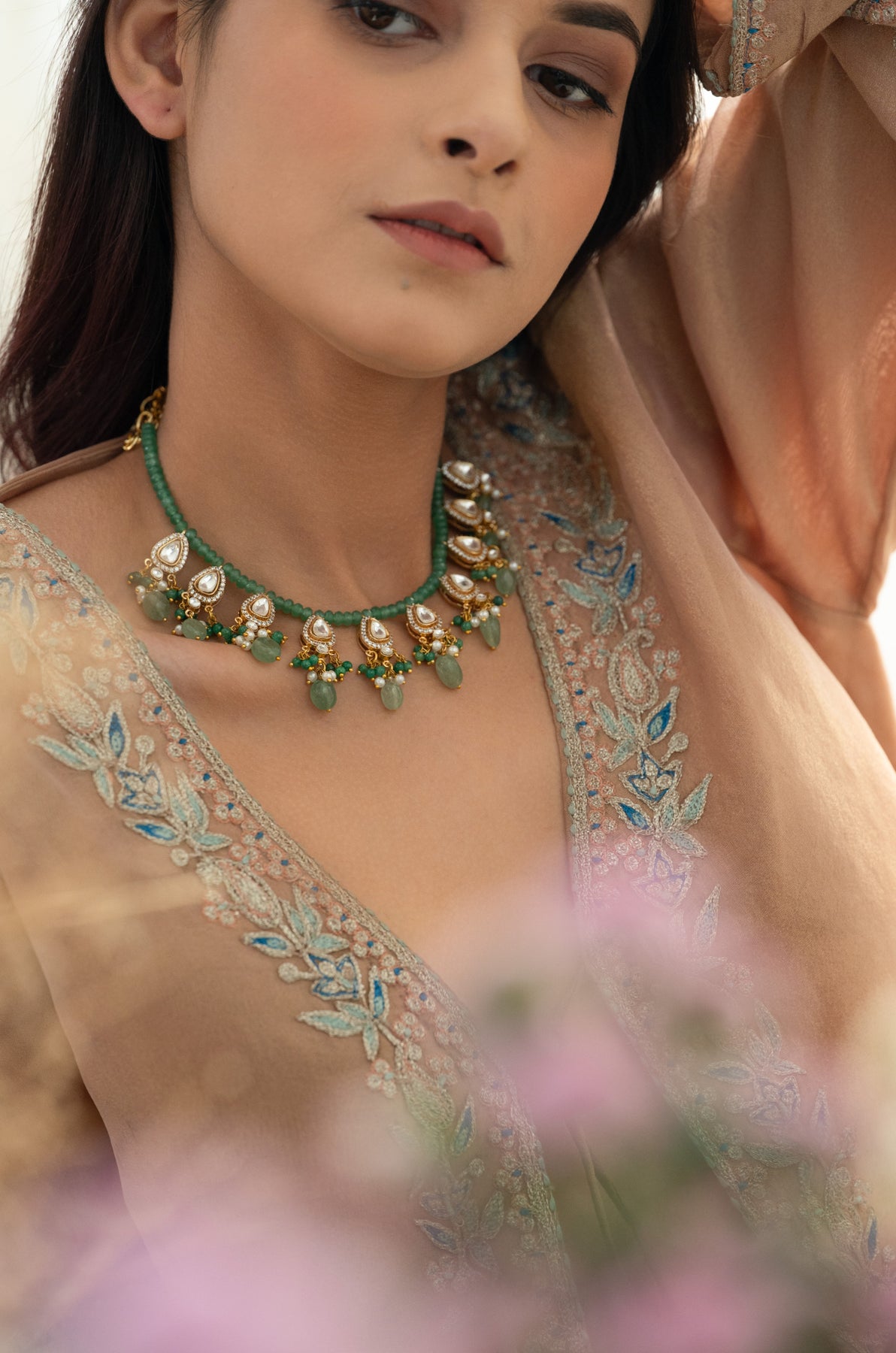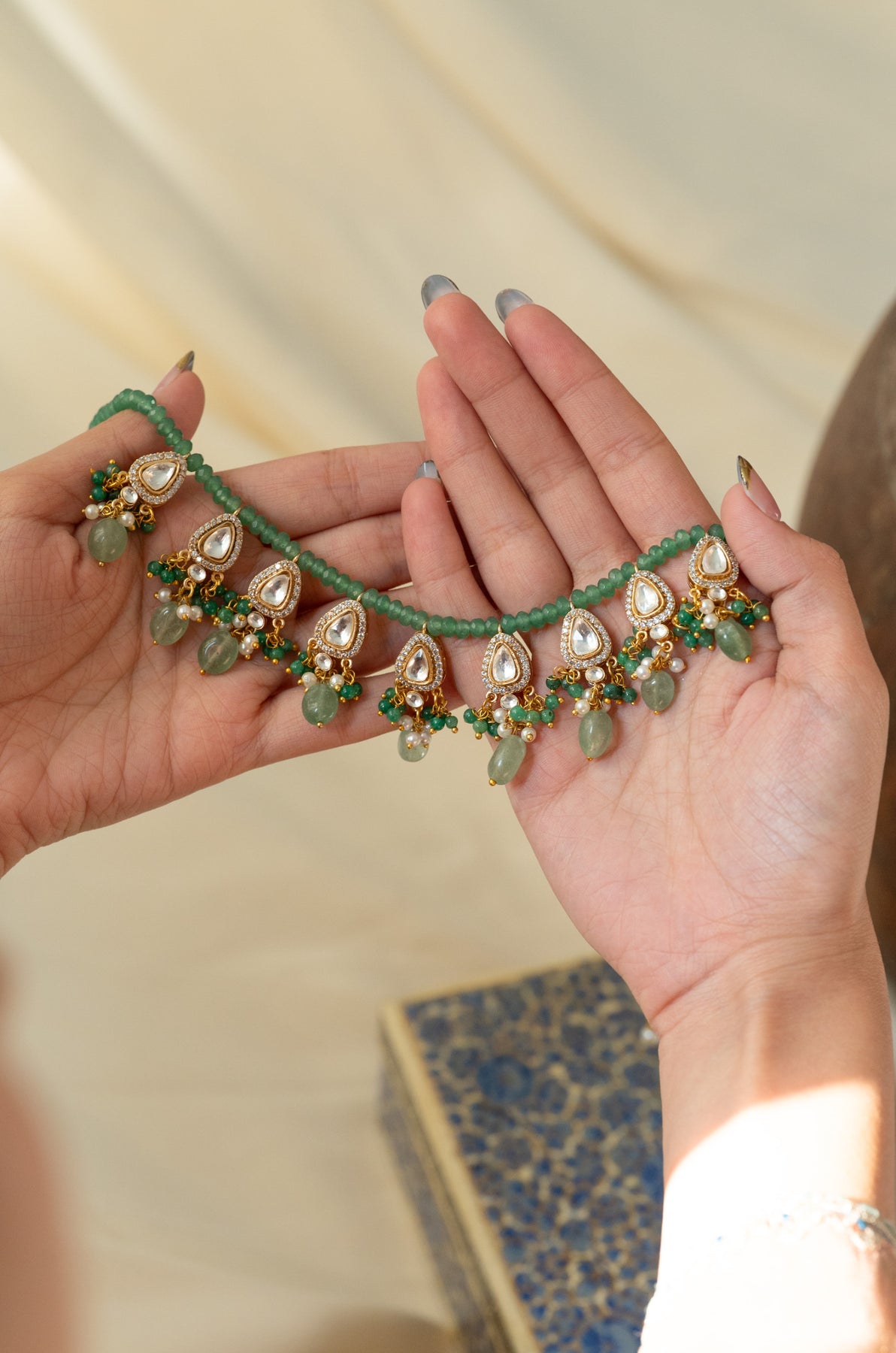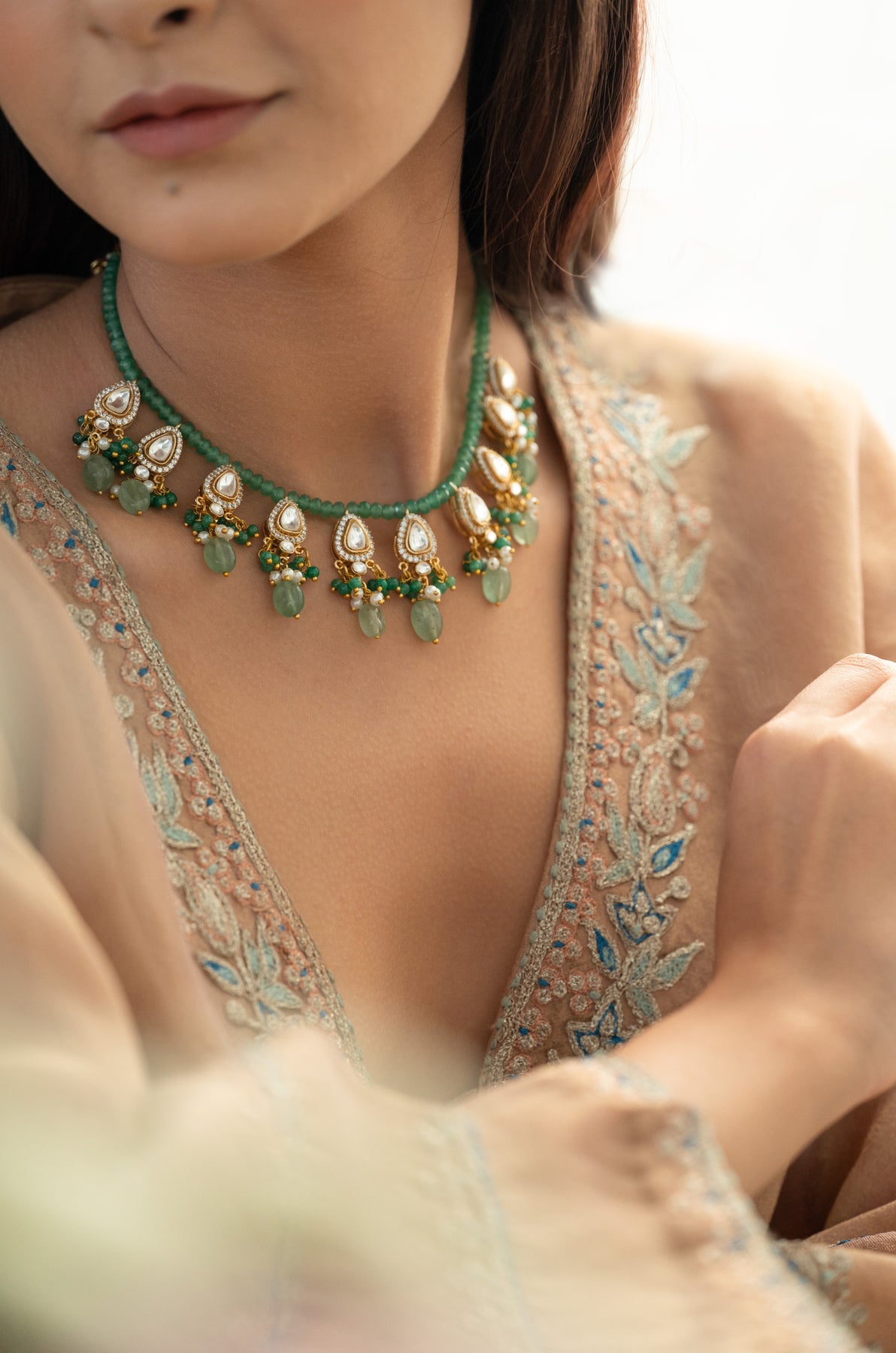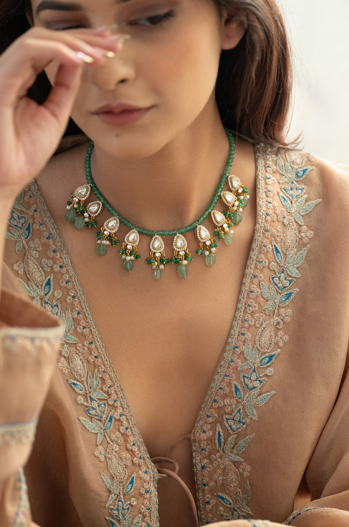 Strewn with lustrous polki drops against a sleek onyx canvas, the Anya Necklace bridges timeless craftsmanship with modern flair. Each faceted stone catches light with playful brilliance, while the contemporary design keeps things fresh and unexpected. Perfect for those who crave vintage glamour without the stuffiness, wear it to elevate everyday moments or steal the spotlight at special occasions.