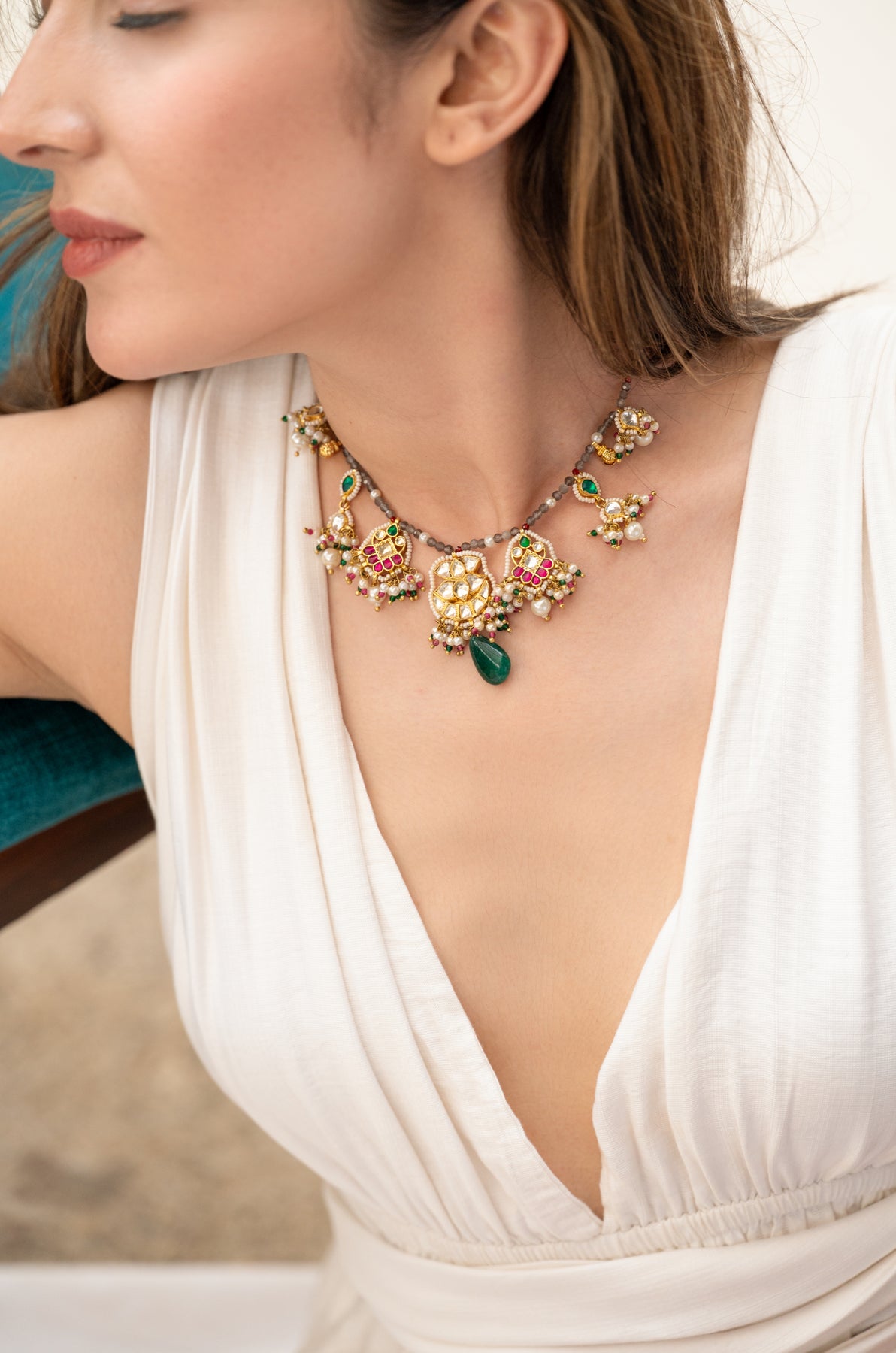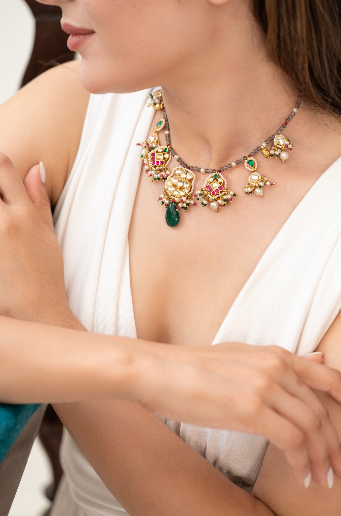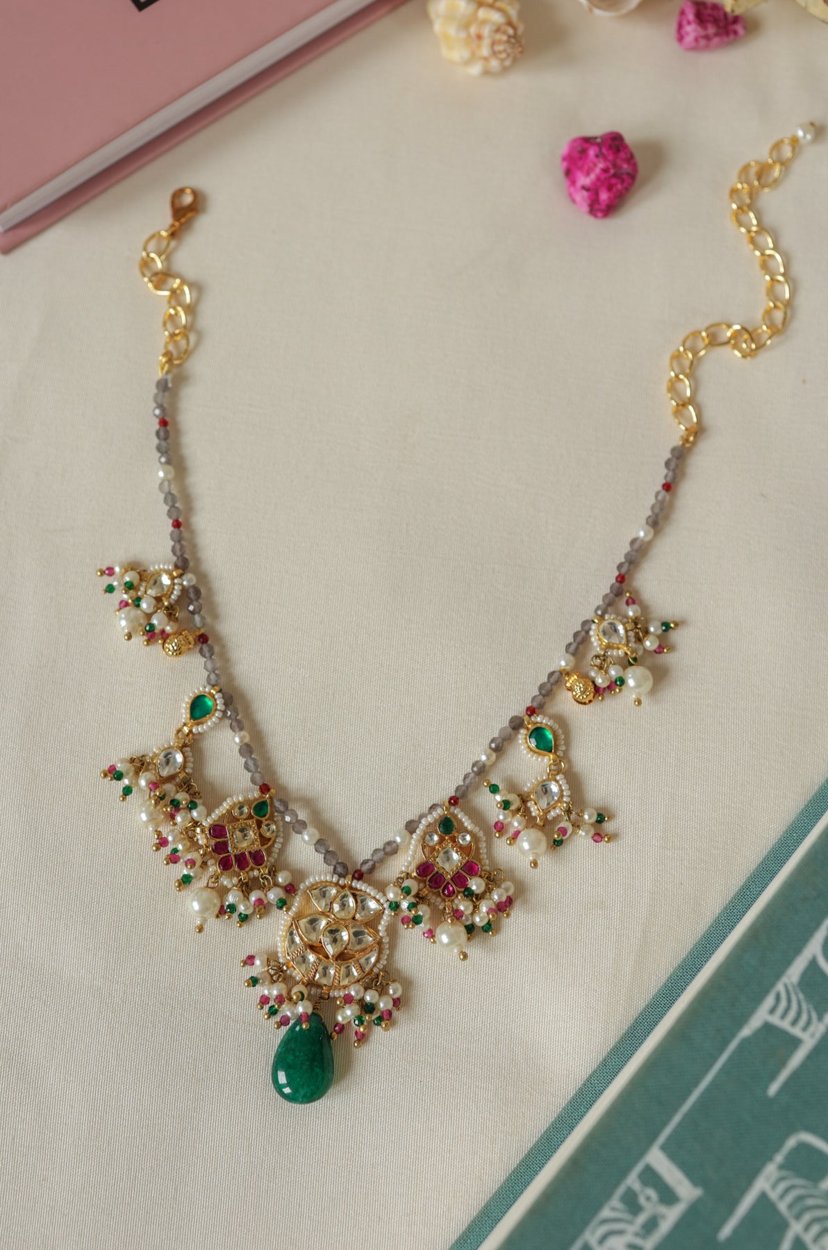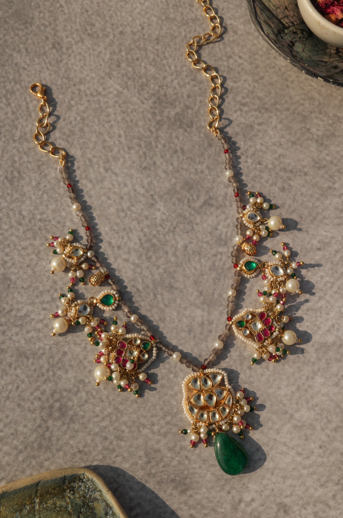 Prepare to make a statement with the Asher multicolored kundan necklace. This exquisite piece showcases a stunning floral pendant adorned with kundan stones, complemented by lustrous pearls and vibrant jade green stone. The perfect fusion of tradition and modernity, this necklace embodies the sophistication and exclusivity of our brand.