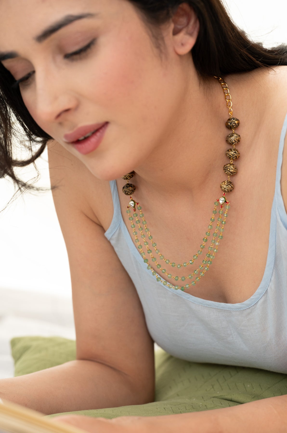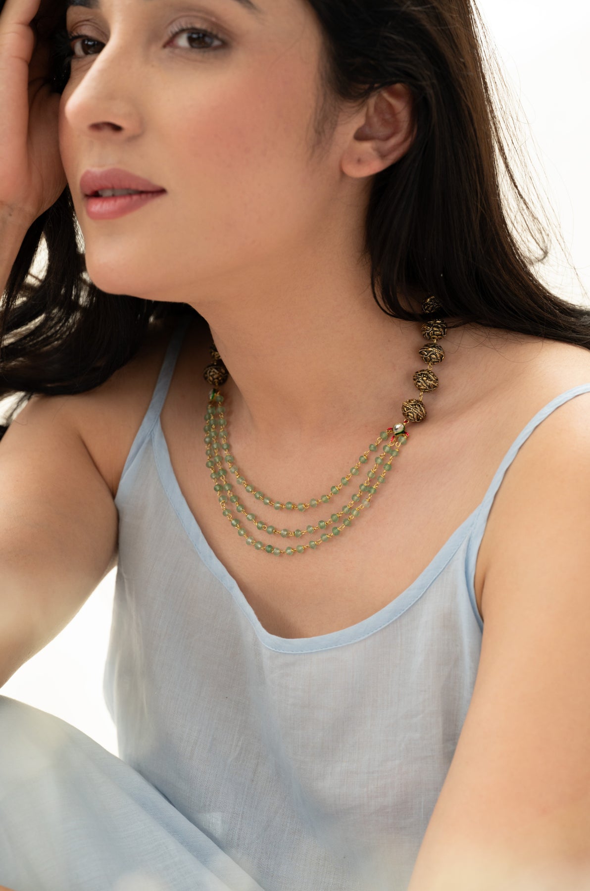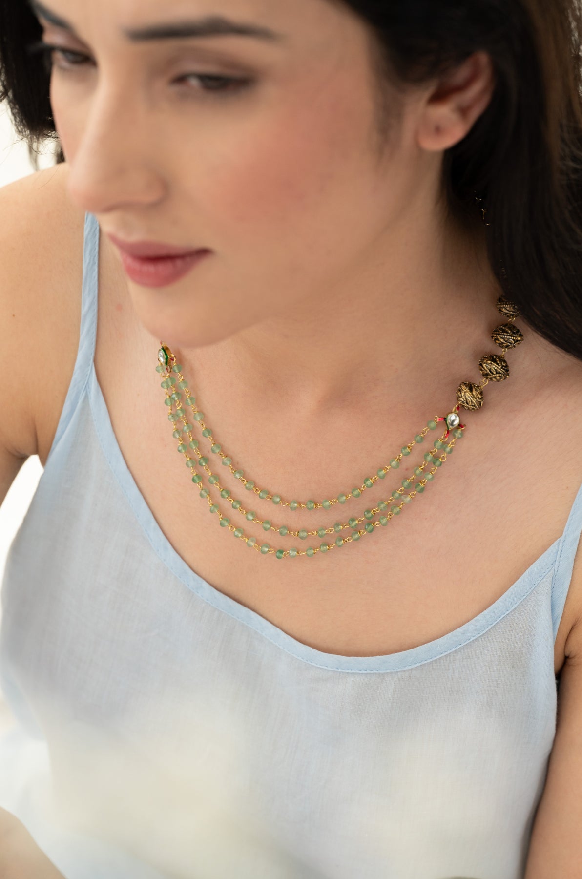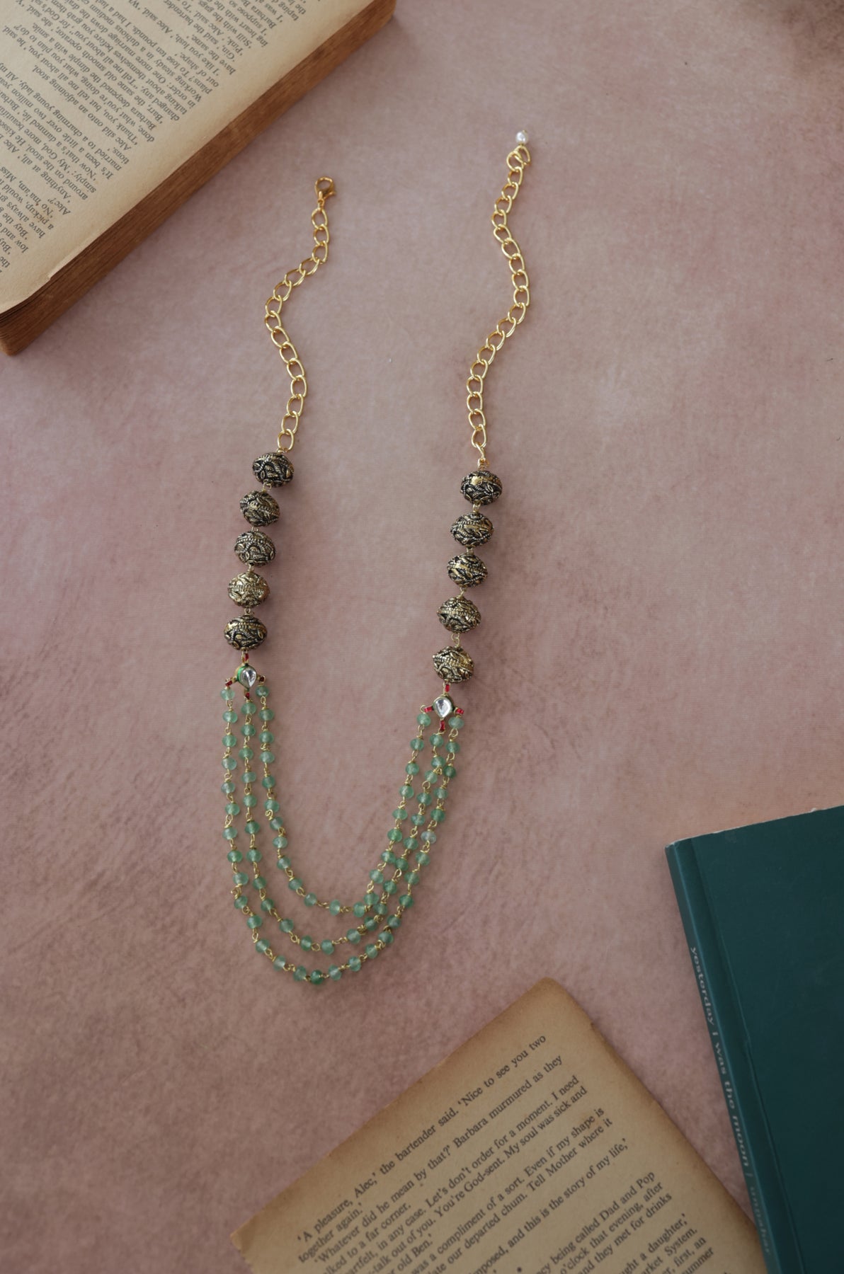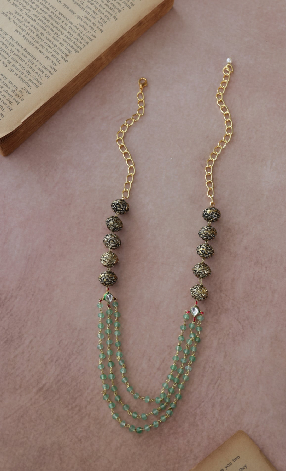 Indulge in the luxurious elegance of this antique gold necklace adorned with embossed golden balls and layers of mint onyx for a modern twist. The intricate kundan details add a touch of sophistication, making this necklace the perfect accessory for any outfit. Elevate your style with this stunning piece.