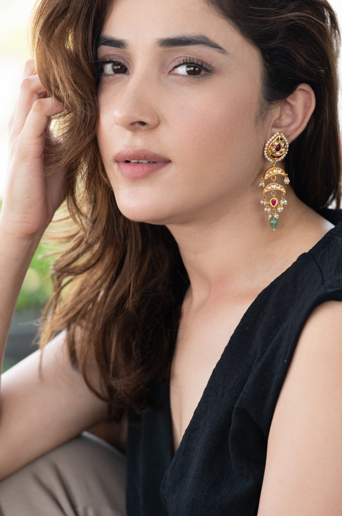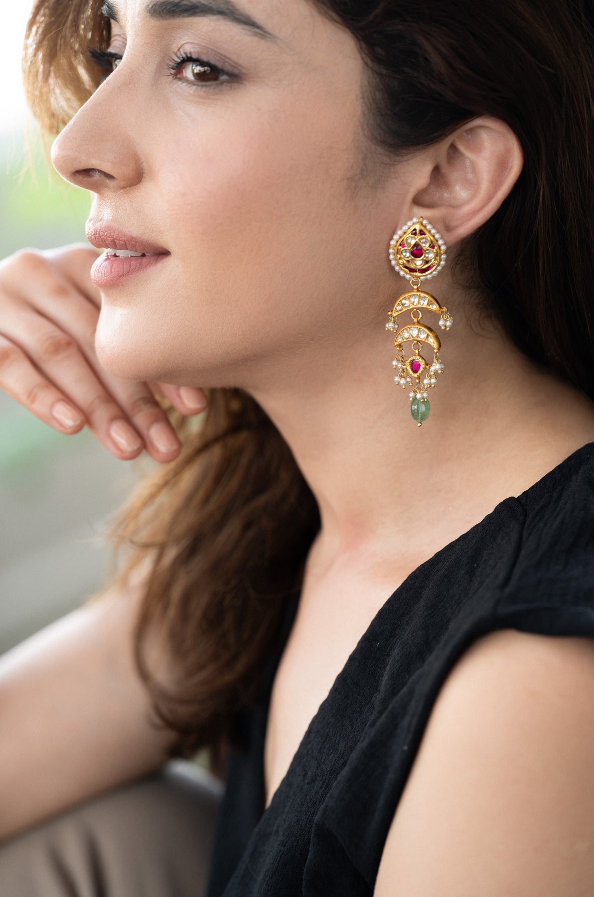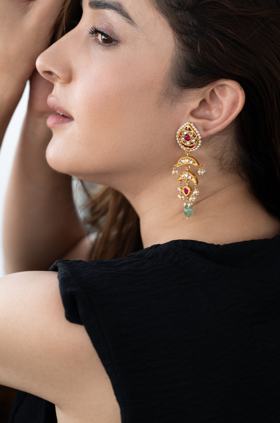 Embrace timeless sophistication with these handcrafted long drop earrings. The pear-shaped stud showcases intricate kundan-style polki work, highlighted by rich ruby-toned stones and a delicate seed pearl trim. Graceful crescent motifs adorned with kundan stones cascade below, complemented by charming pearl clusters. A striking ruby-red centerpiece and a green stone bead drop introduce vibrant color, enhancing the design’s depth and allure. Ideal for weddings, celebrations, or heritage-inspired events, these earrings exude regal elegance and refined craftsmanship.