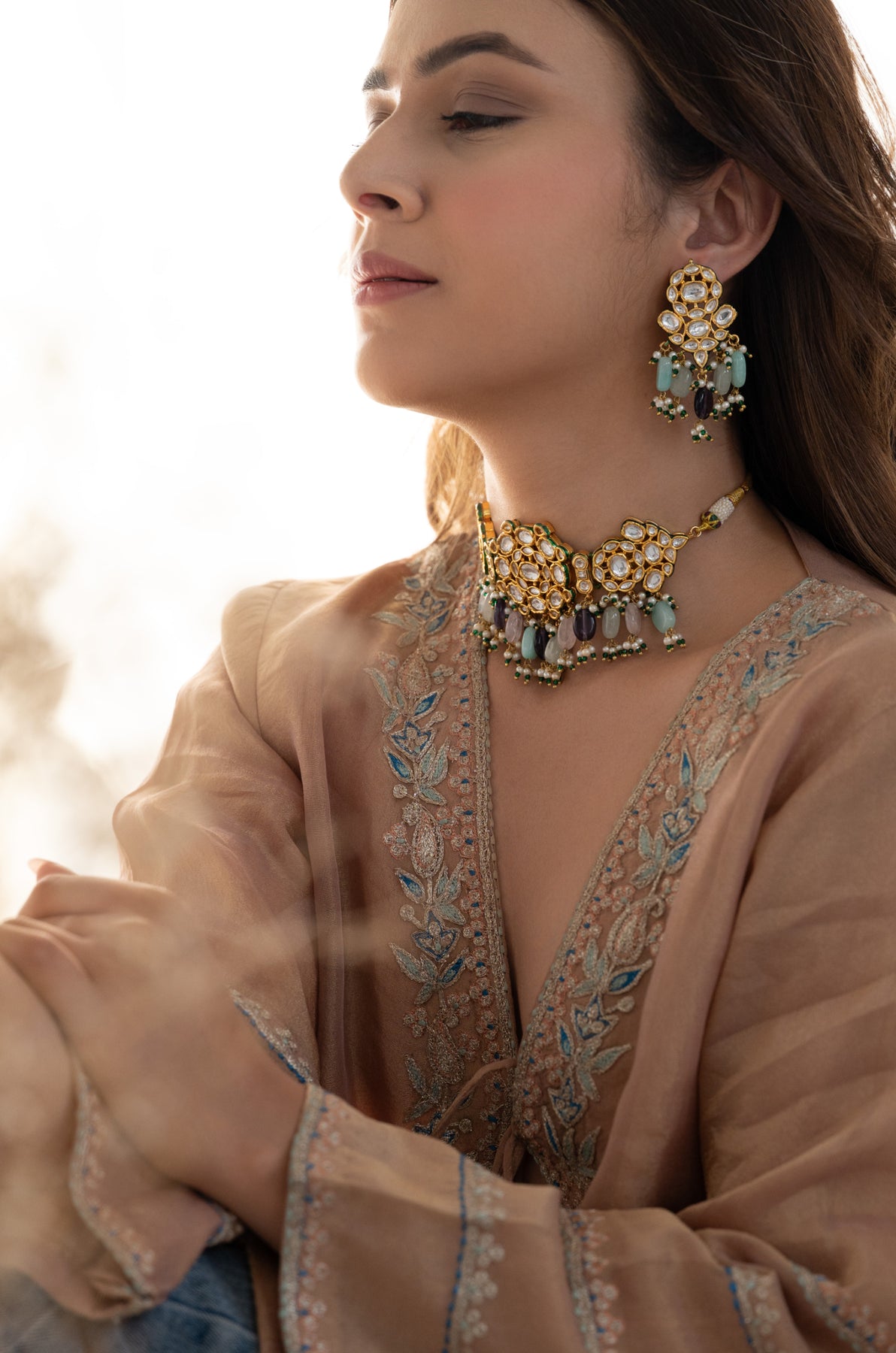 This Lyca multicolored necklace set is the epitome of elegance and luxury. The classic floral motif and pastel multicolor hangings add a touch of sophistication to any outfit. The sparkling kundan beautifully blends with the soft pastel tones, making it the perfect fusion accessory for any occasion.