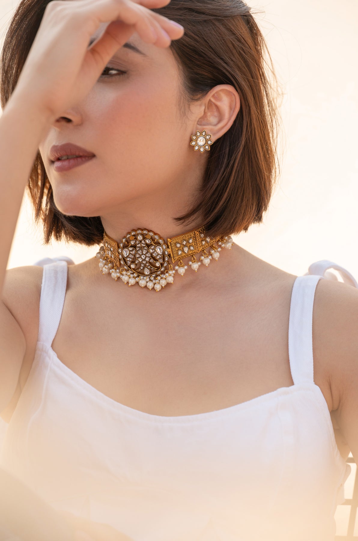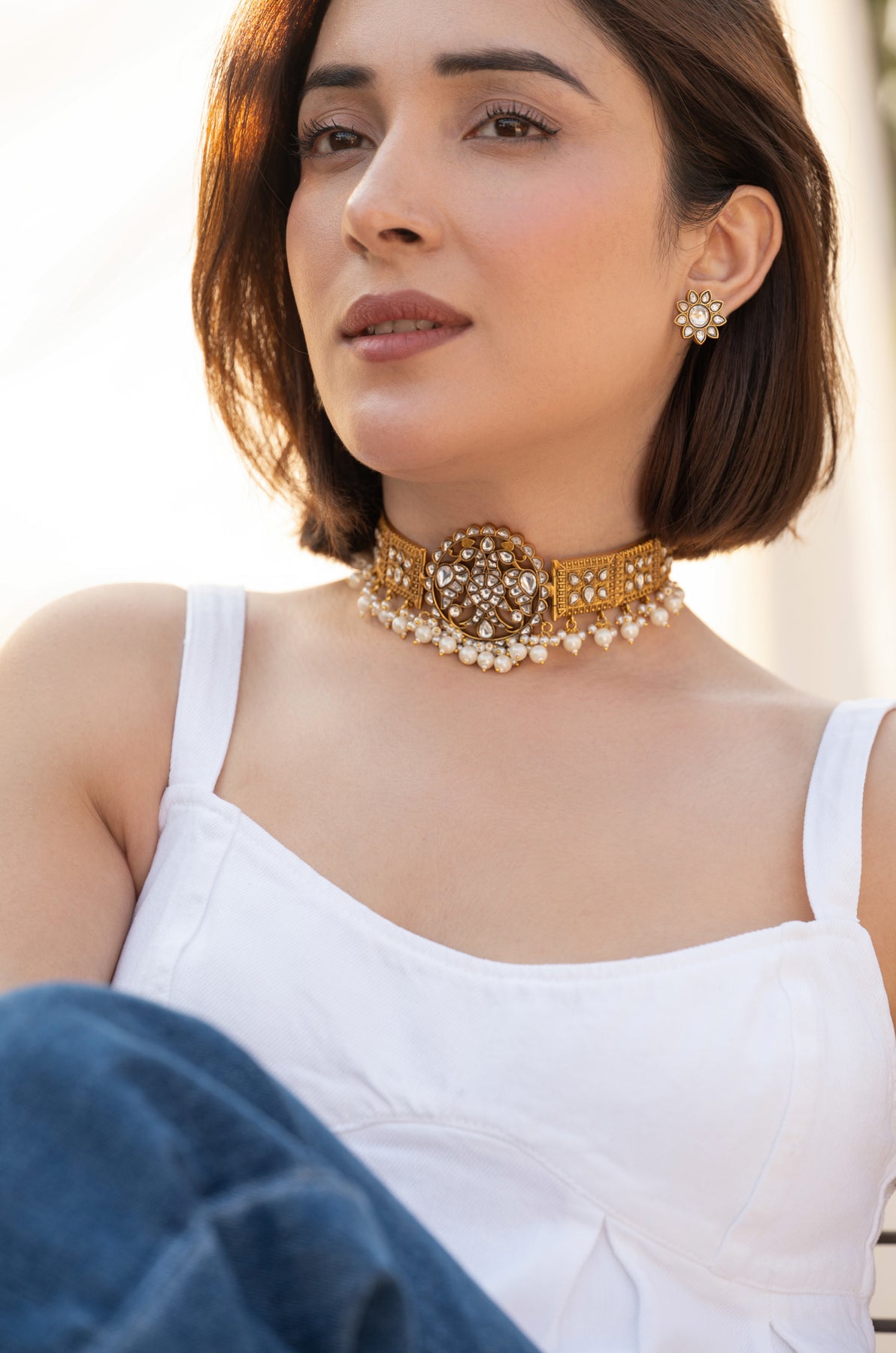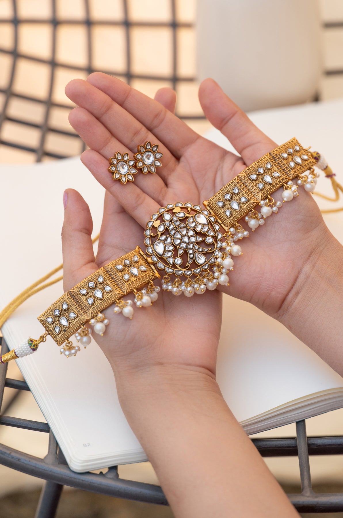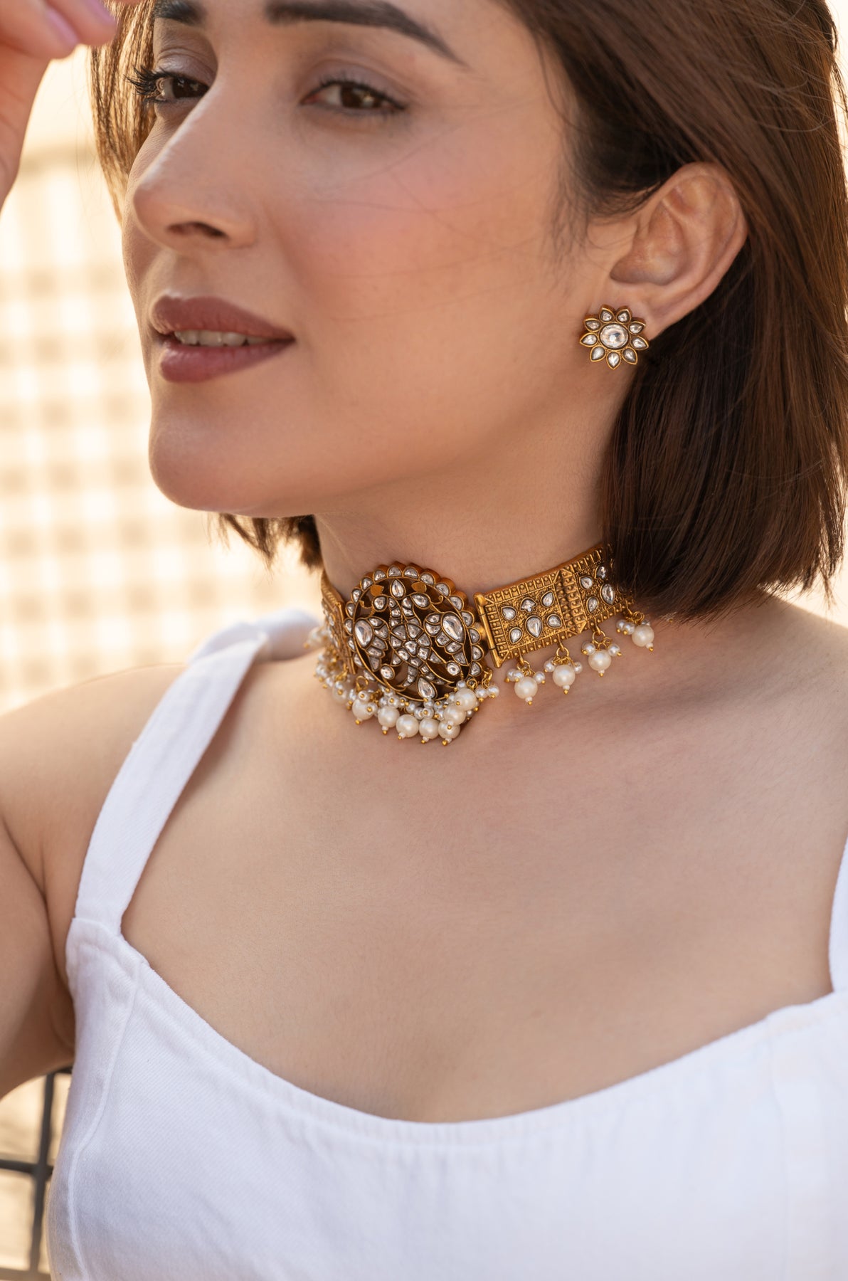 The necklace features a structured gold-toned choker design adorned with carefully set kundan stones, arranged in symmetrical patterns that reflect traditional royal aesthetics. At the center sits an ornate circular motif showcasing intricate kundan work, creating a striking focal point that adds depth and richness to the piece. The sides of the choker are decorated with finely detailed geometric panels that enhance the architectural elegance of the design. A delicate row of tiny pearl drops lines the lower edge of the choker, adding softness and gentle movement while enhancing the traditional charm of the piece. The pearls create a graceful contrast against the warm gold finish and the brilliance of the kundan stones. The set is complemented by matching floral stud earrings, featuring a central stone surrounded by petal-shaped kundan settings, echoing the necklace’s refined craftsmanship.