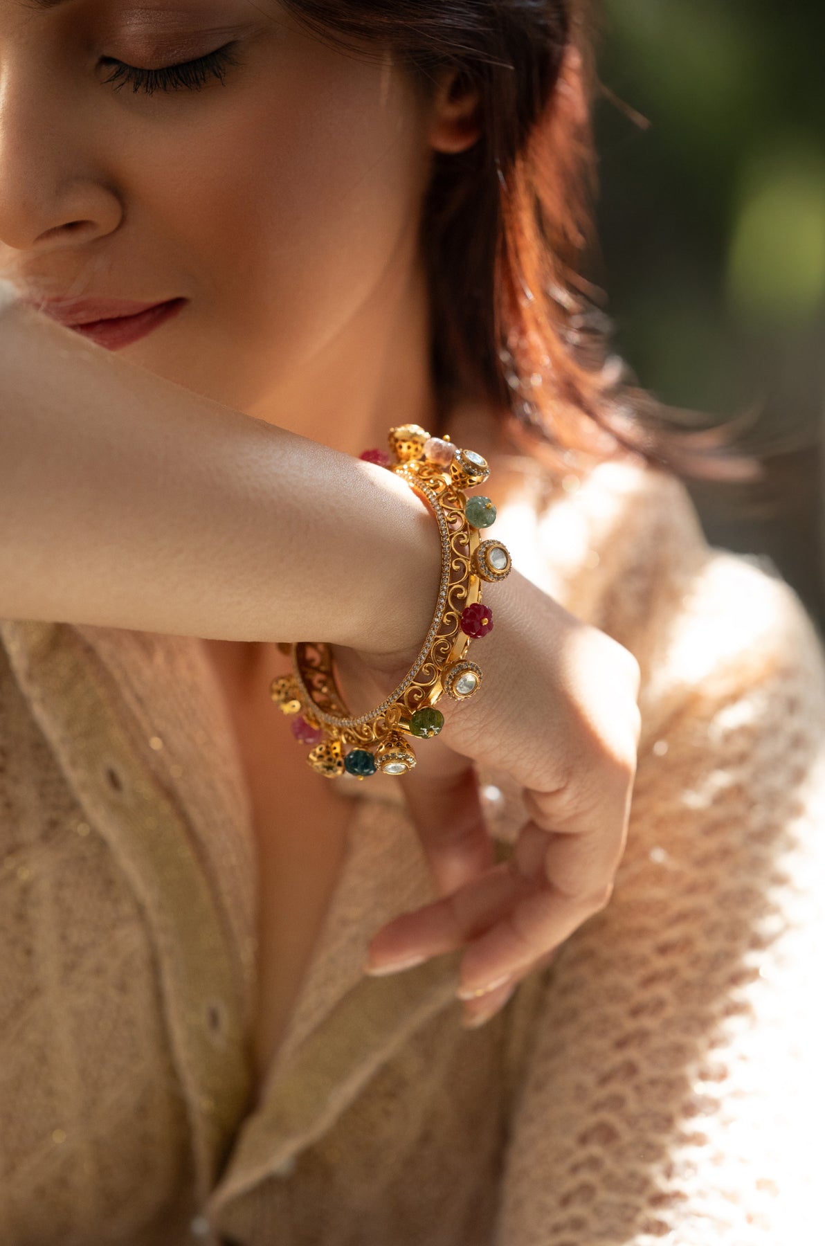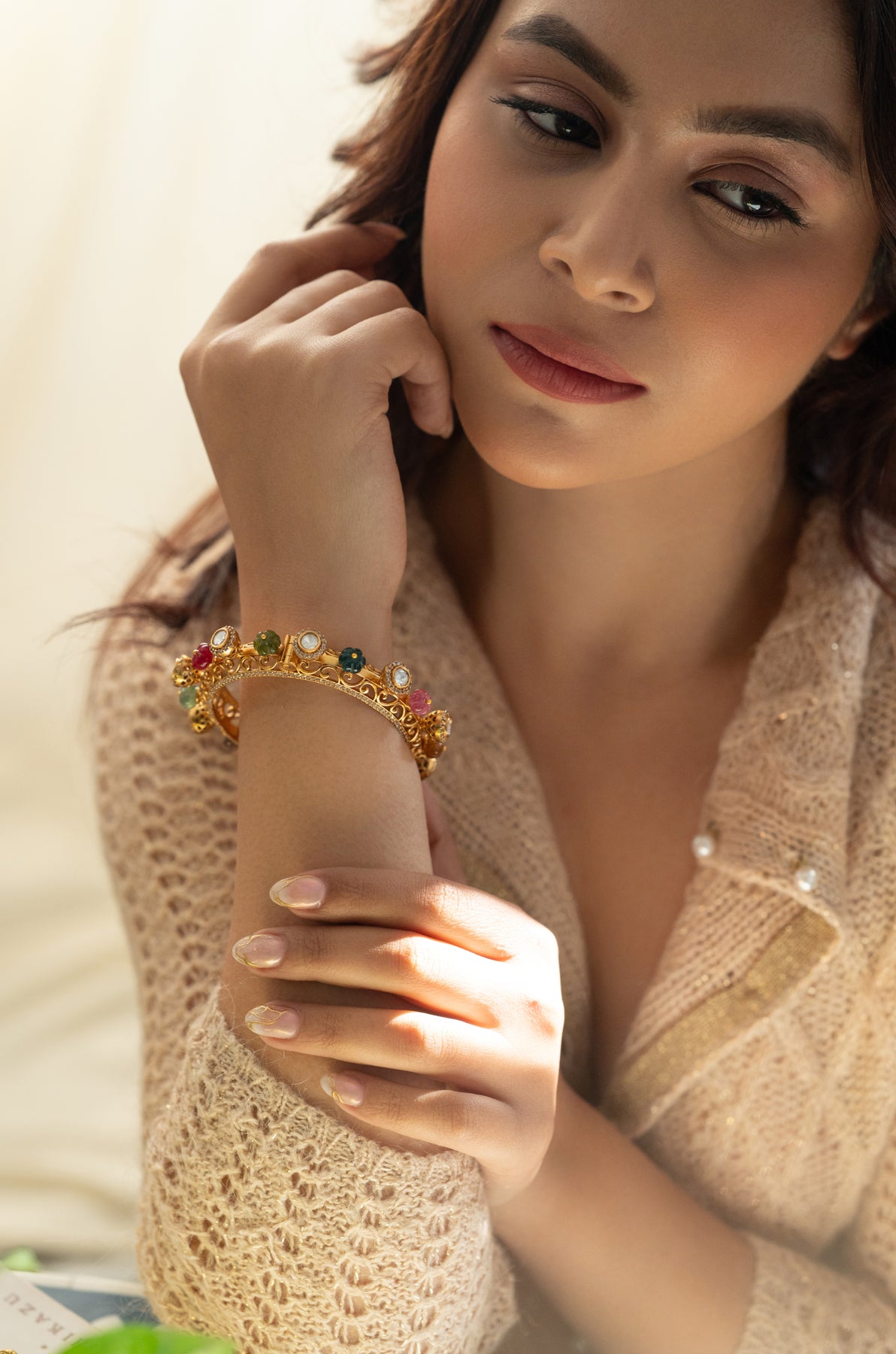 Elevate your wrist with the Prachi bangle, where traditional craftsmanship meets modern elegance. This contemporary piece features lustrous polki stones in a vibrant spectrum of hues, creating a striking visual impact that complements both casual and formal ensembles. The intricate design showcases the timeless artistry of polki work while maintaining a fresh, contemporary aesthetic. Perfect for those who appreciate jewelry that seamlessly blends heritage with current style, this bangle is a versatile addition to any collection.