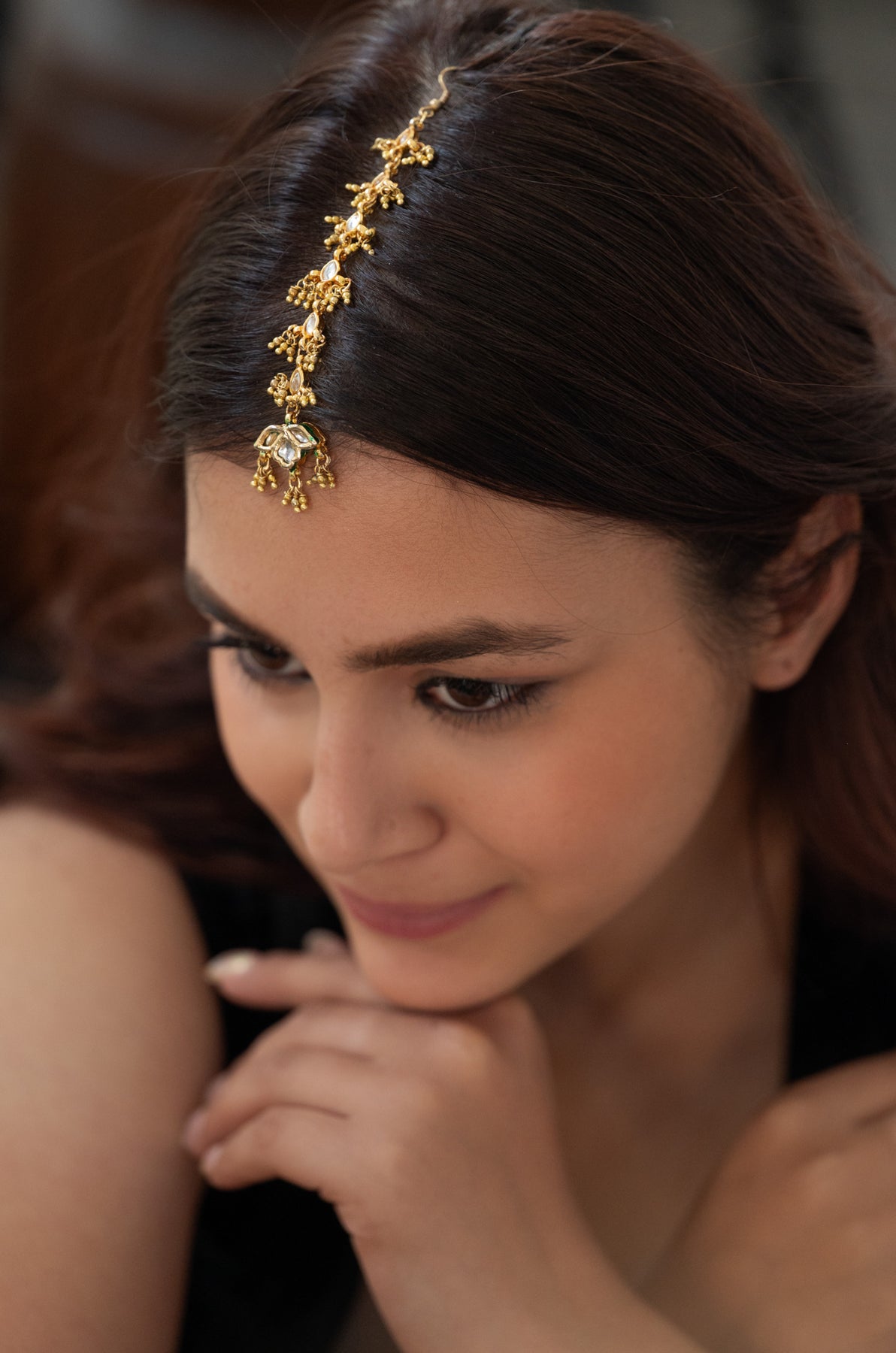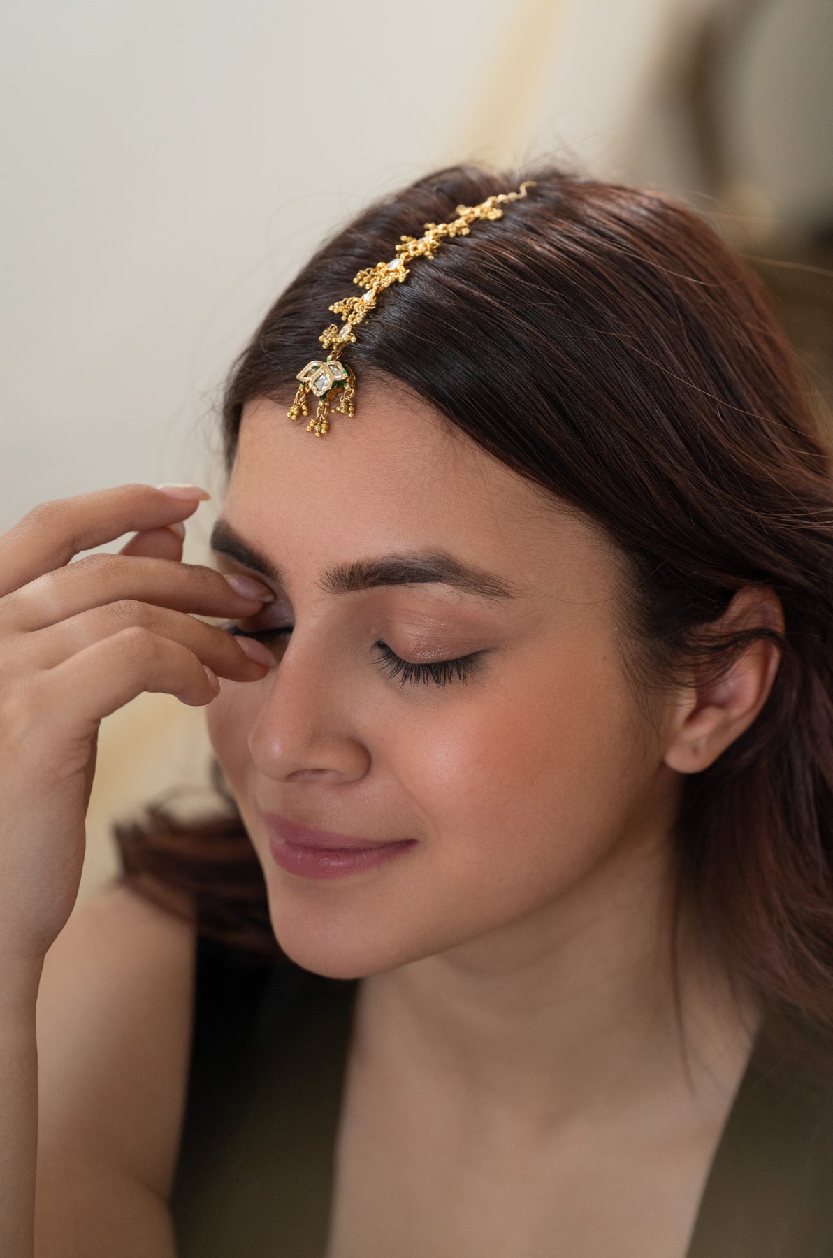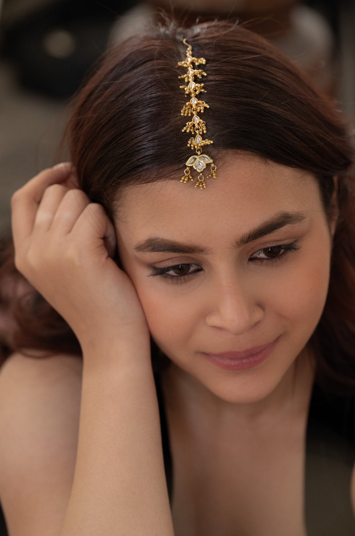 Adorn your forehead with timeless elegance! This stunning Reena maangtikka blends traditional craftsmanship with versatile charm, making it your go-to accessory for weddings, festivals, and special celebrations. The intricate Kundan work catches light beautifully, adding that perfect sparkle to elevate any occasion. Whether you're dressed in ethnic wear or experimenting with fusion styles, Reena brings sophistication and playful glamour to your look. A treasure piece that celebrates your heritage while keeping you effortlessly radiant!