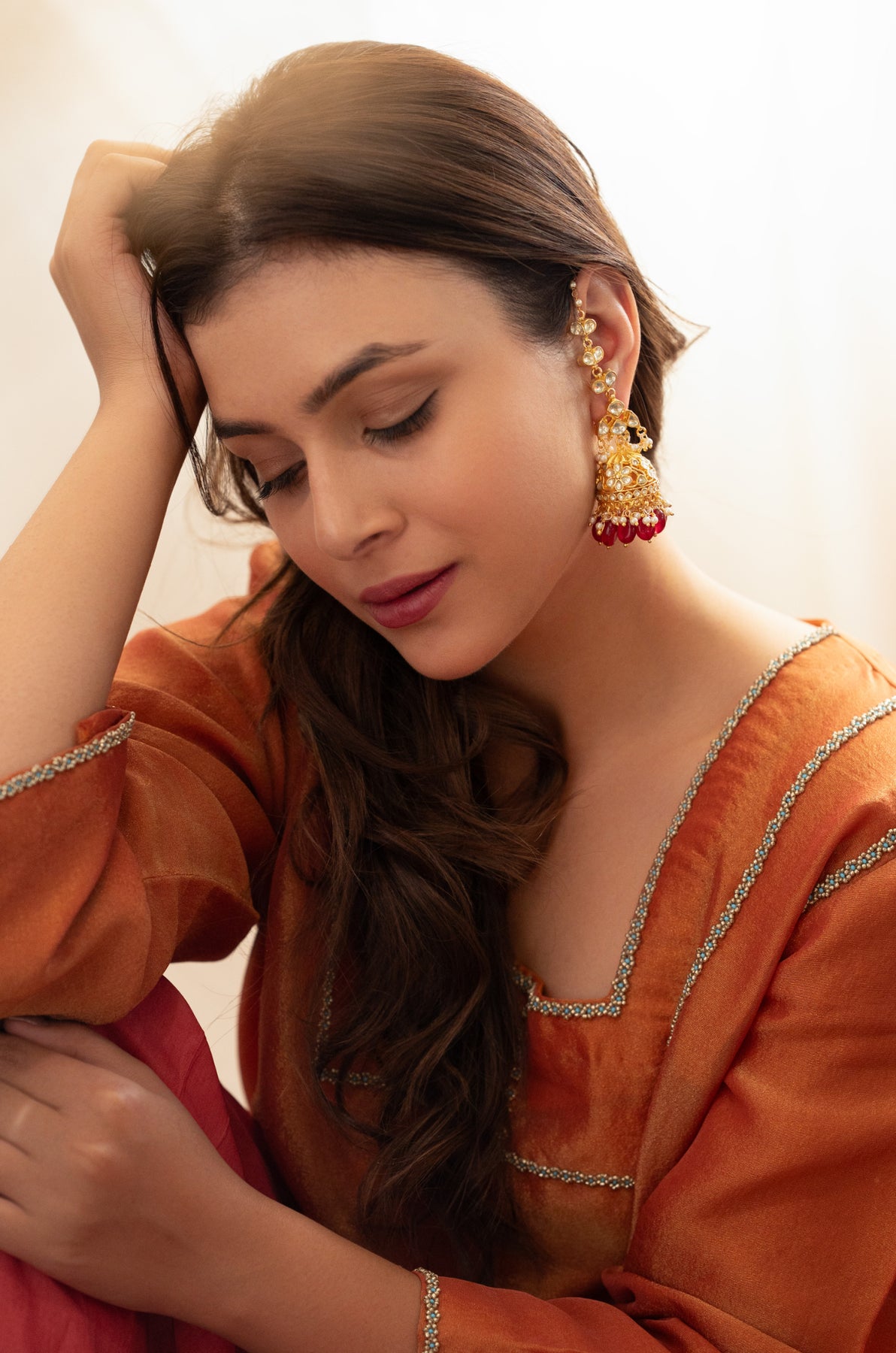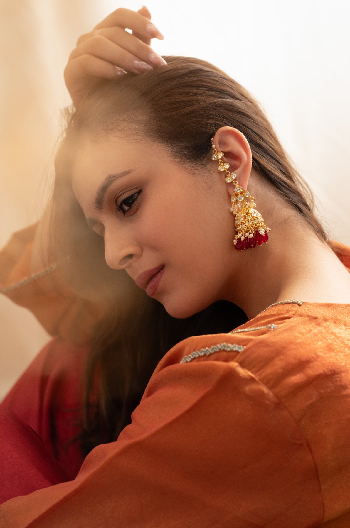 Celebrate tradition with a playful twist in these Rogue earrings. Featuring exquisite kundan craftsmanship, they are beautifully highlighted with lustrous pearls and vibrant red natural stones. These earrings bring a lively sparkle and rich color that’s perfect for adding charm and fun to your festive or everyday wear. Let your style shine with a timeless classic that’s never boring!