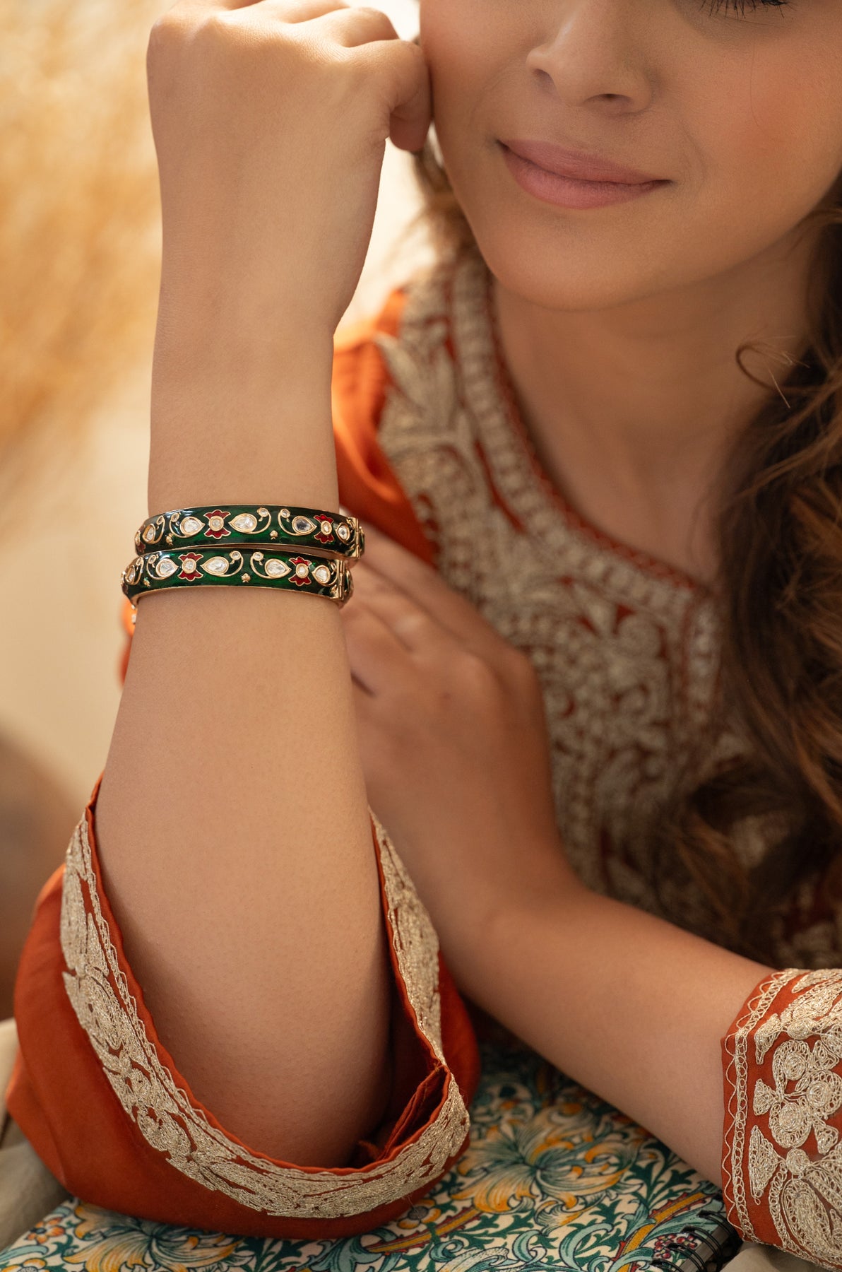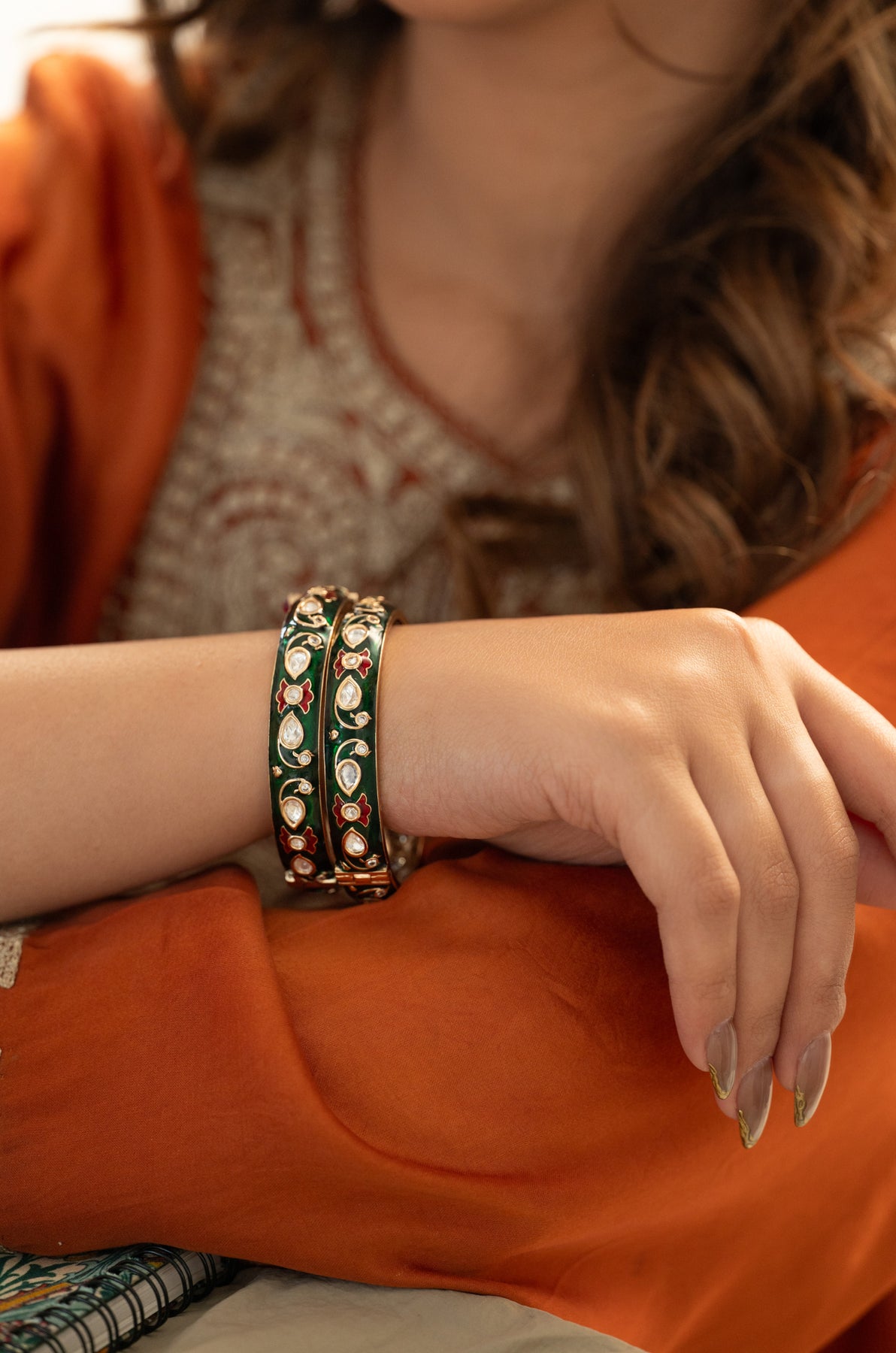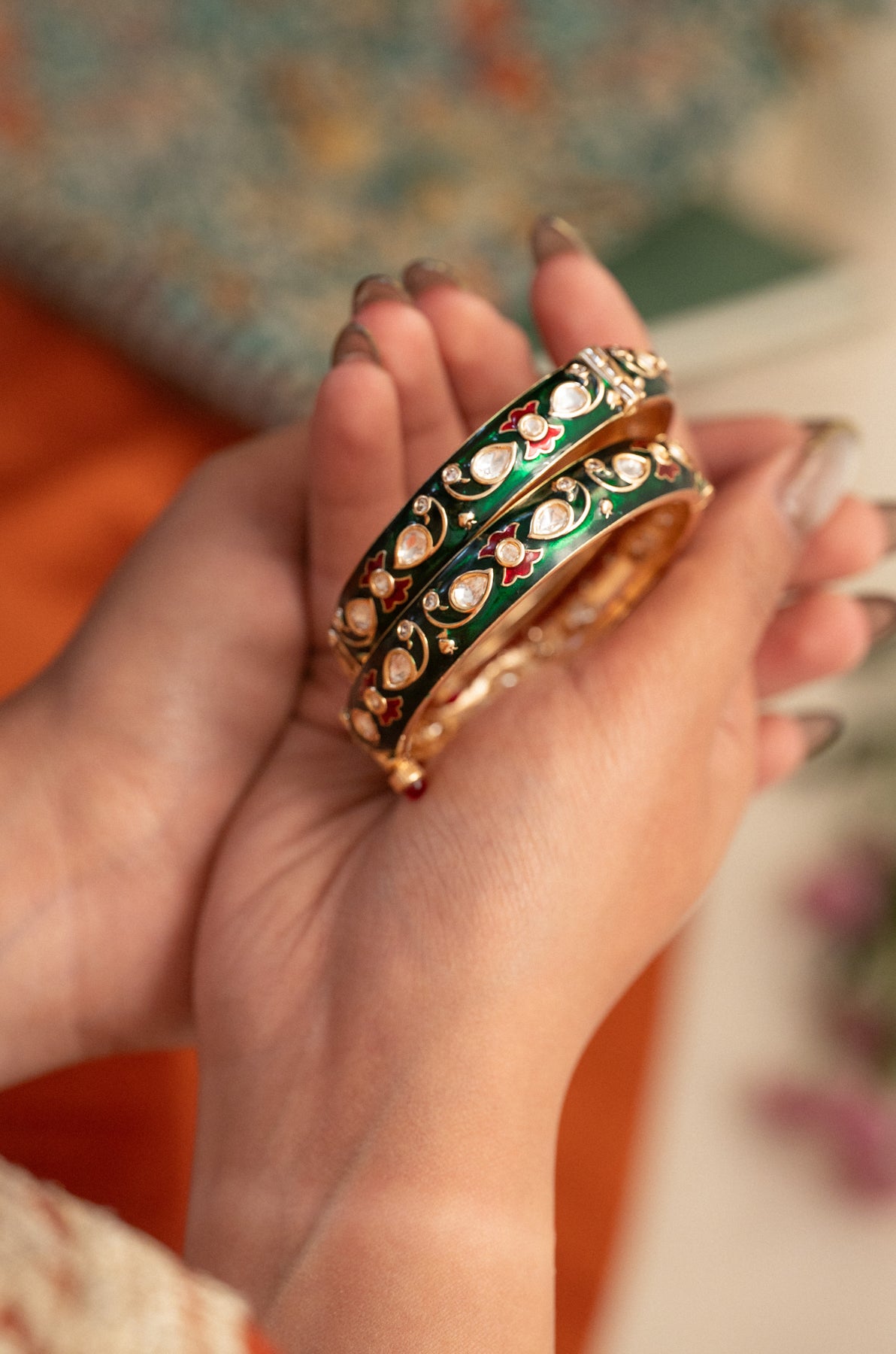 These vibrant bangles are a striking fusion of royal elegance and traditional artistry. Set against a rich cobalt green meenakari, they feature delicate floral patterns in green, intricately accented with pear-shaped polki stones and fine cubic zirconia. The gold framework enhances the regal feel, while the hand-painted detailing reflects exquisite craftsmanship. Ideal for festive occasions, weddings, or heirloom-inspired looks, these bangles add a bold yet graceful statement to any traditional ensemble.