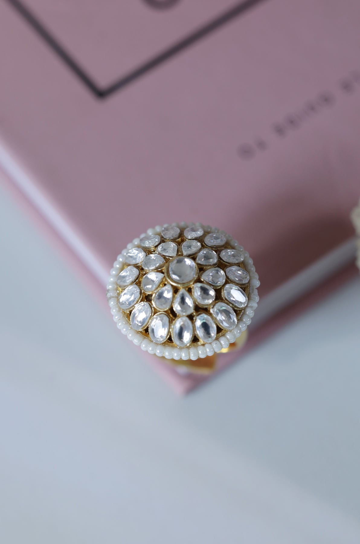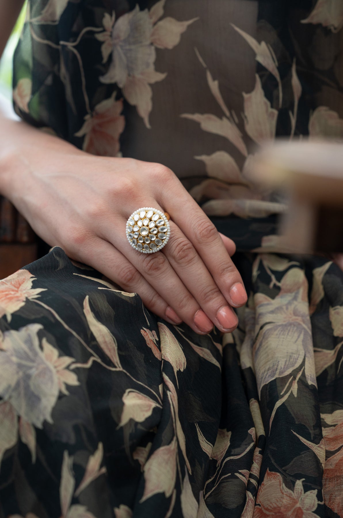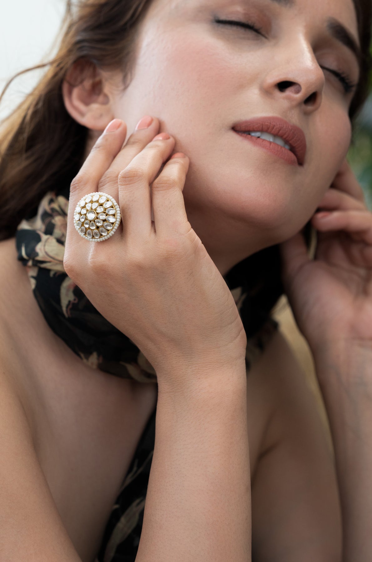 Experience the timeless elegance of the Taashi ring, expertly crafted to showcase the classic beauty of polki diamonds paired with lustrous pearls. This statement piece blends traditional artistry with refined sophistication, enhancing your ensemble with a radiant glow. Perfect for special occasions, its intricate design highlights the natural allure of each stone, making it a distinguished addition to any fine jewelry collection.