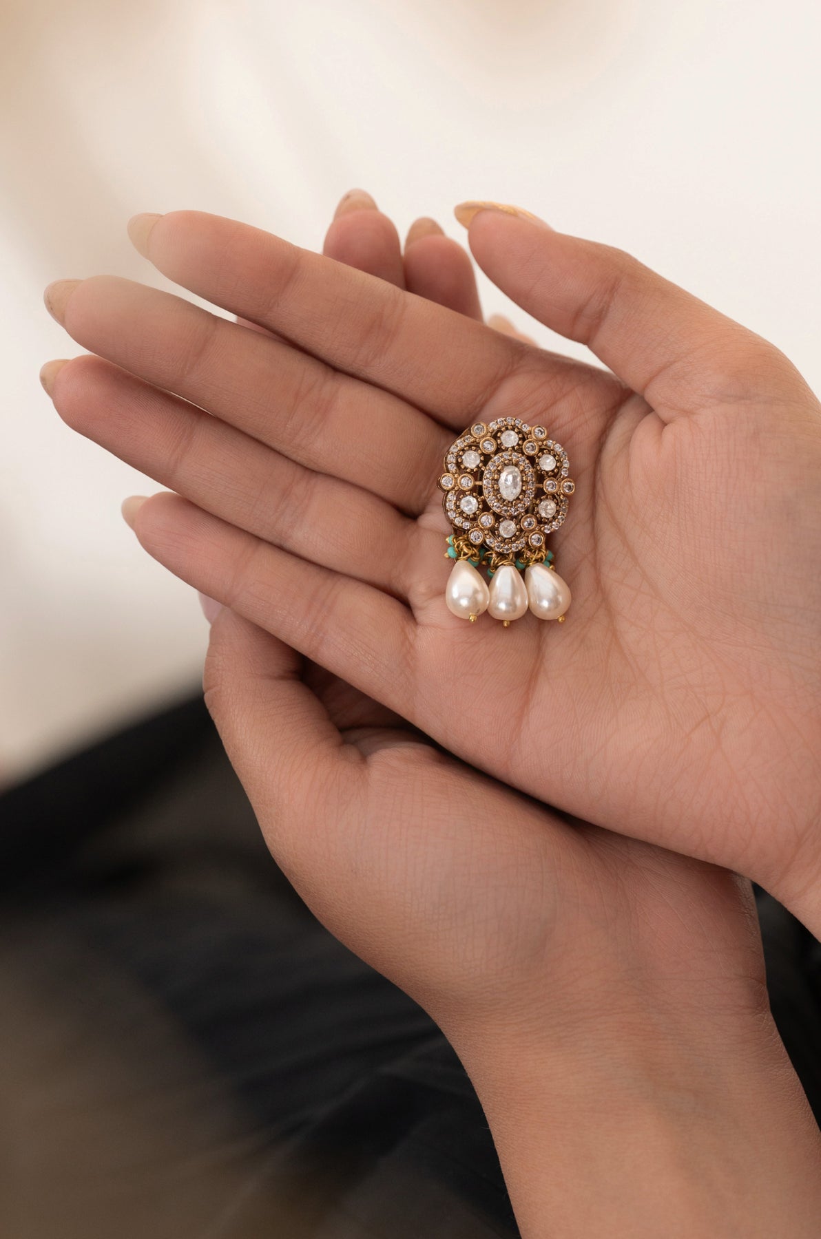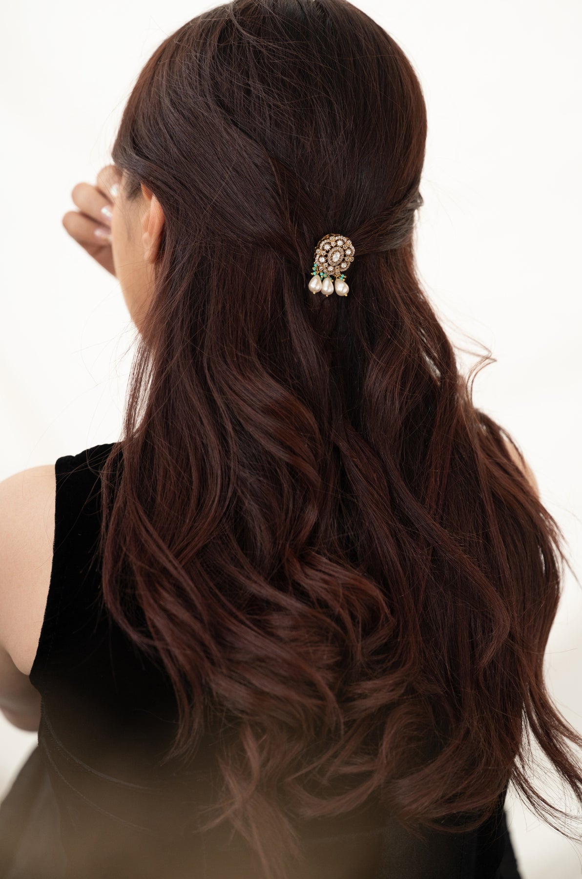 Elevate your everyday braids into show-stopping moments with this Tarah braid pin. Featuring a dazzling mix of cubic zirconia, uncut polki stones, and lustrous pearls, it's the perfect accessory for anyone who loves mixing classic charm with contemporary style. Wear it with a simple plait or an elaborate updo either way, you'll add that coveted sparkle and sophistication that makes heads turn. Because why settle for ordinary when you can make your hair absolutely extraordinary?